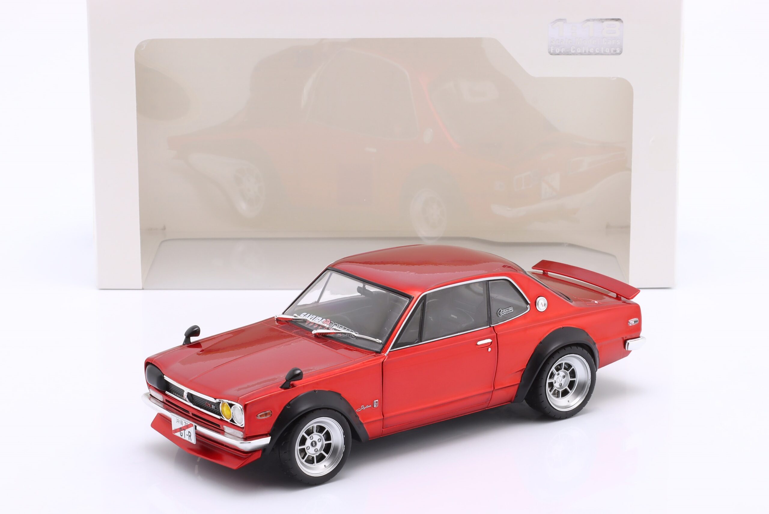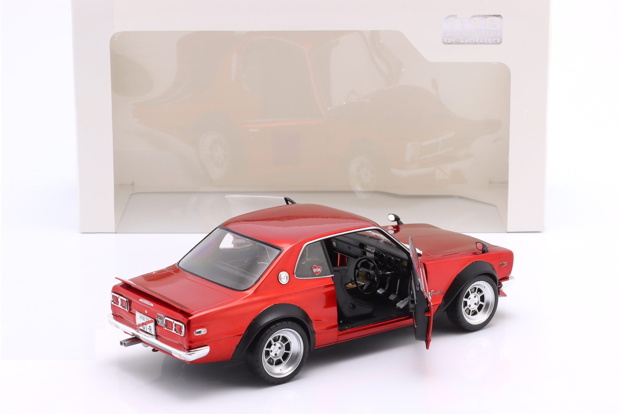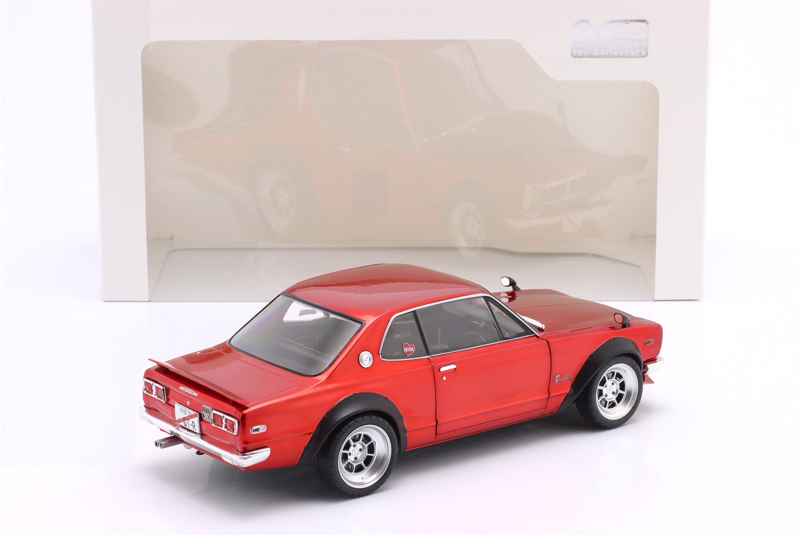 Kolekcjonerski model metalowy z elementami plastikowymi samochodu NISSAN SKYLINE (C10) Hakosuka Works z roku 1970 w kolorze Czerwony metallic.Model posiada otwierane drzwi.