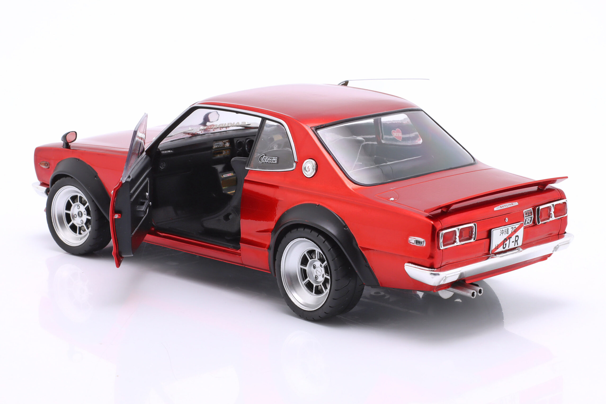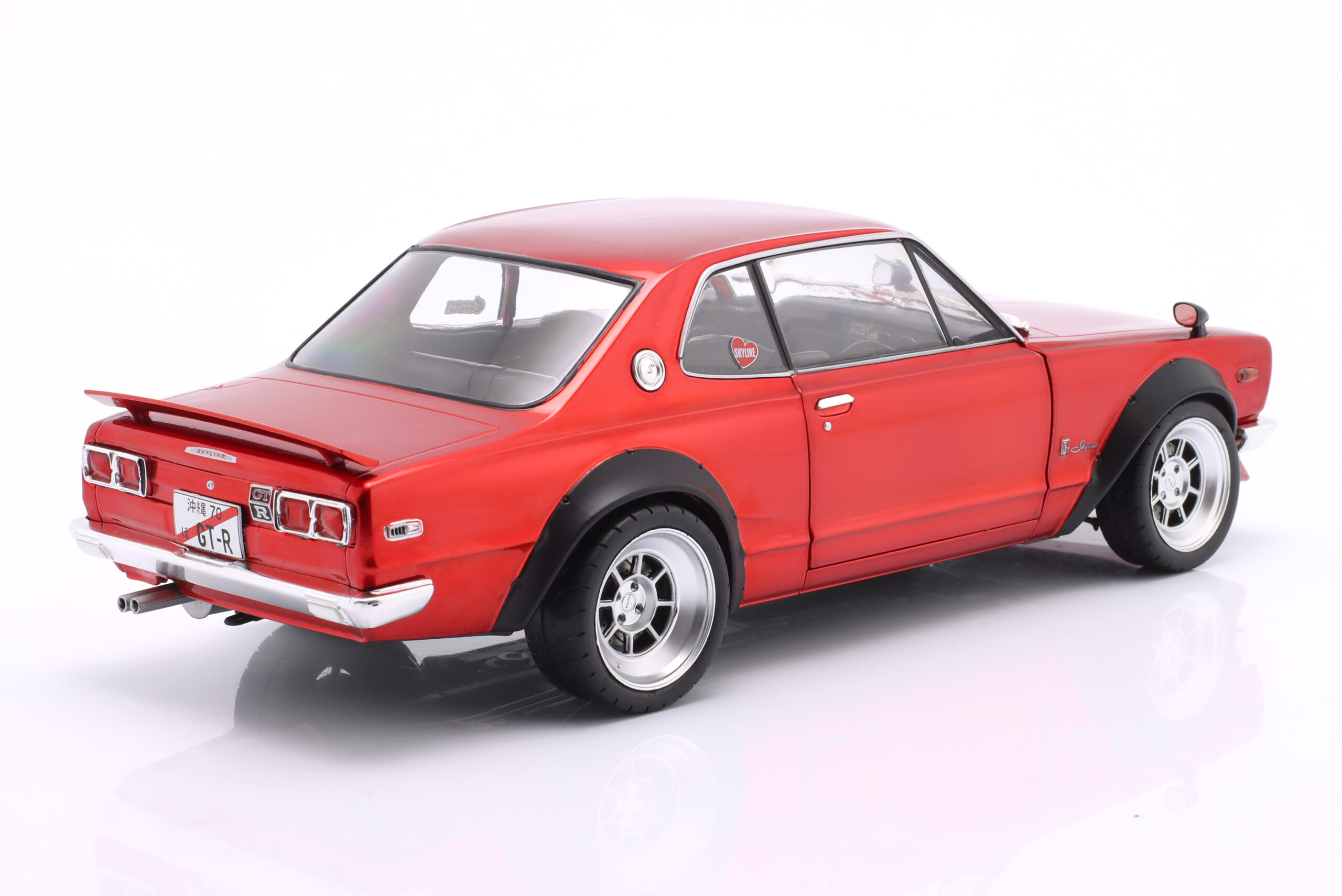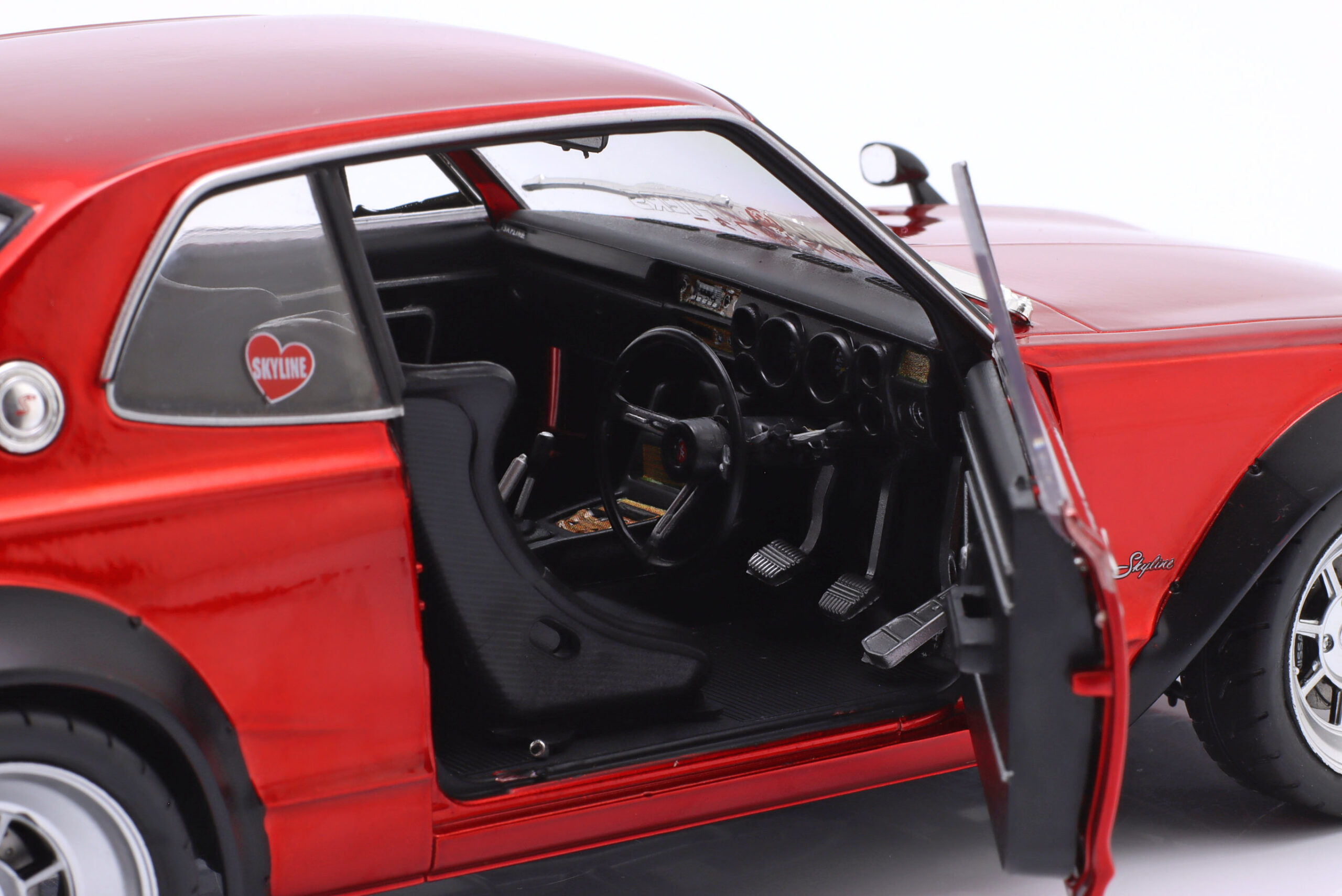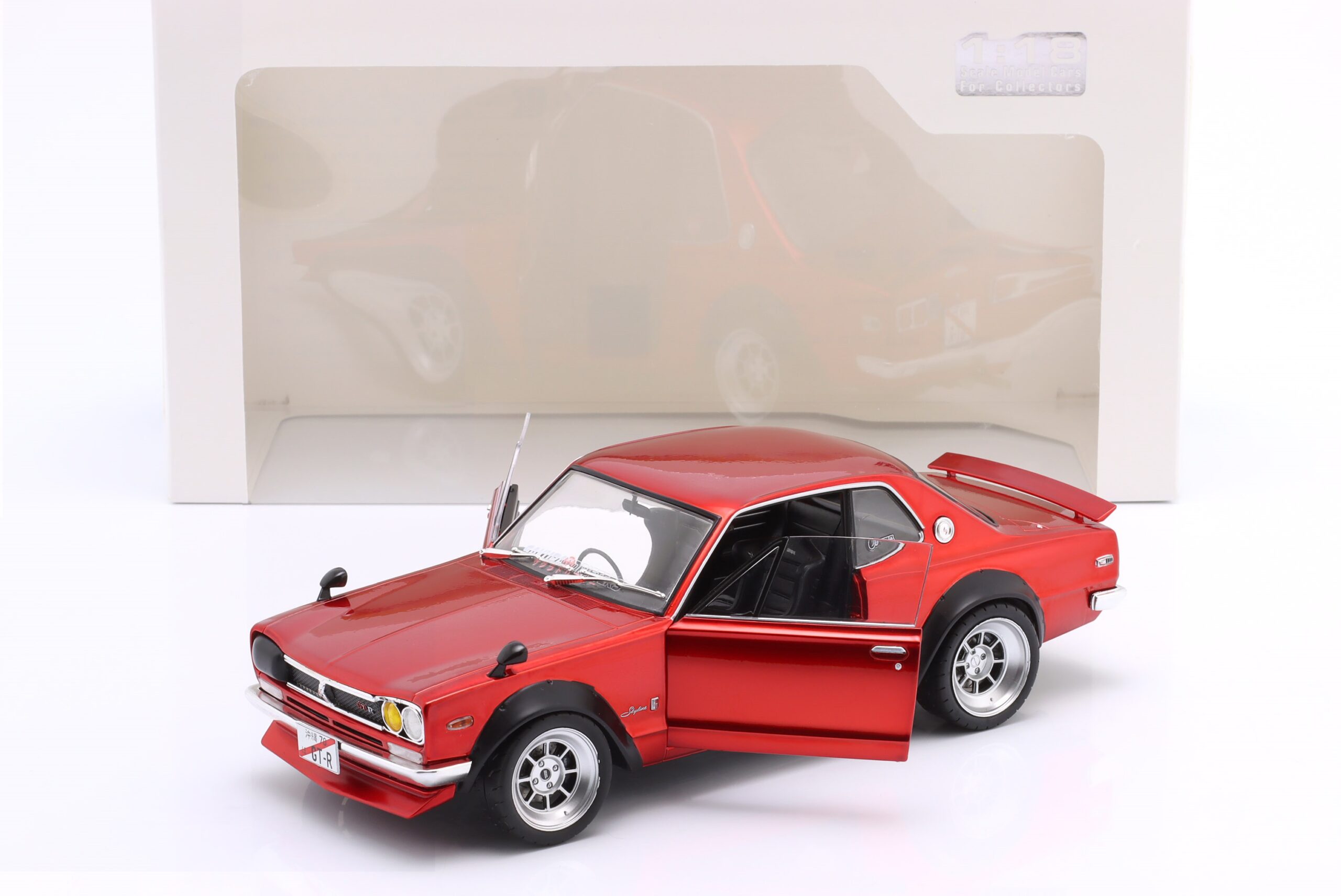Kolekcjonerski model metalowy z elementami plastikowymi samochodu NISSAN SKYLINE (C10) Hakosuka Works z roku 1970 w kolorze Czerwony metallic.Model posiada otwierane drzwi.