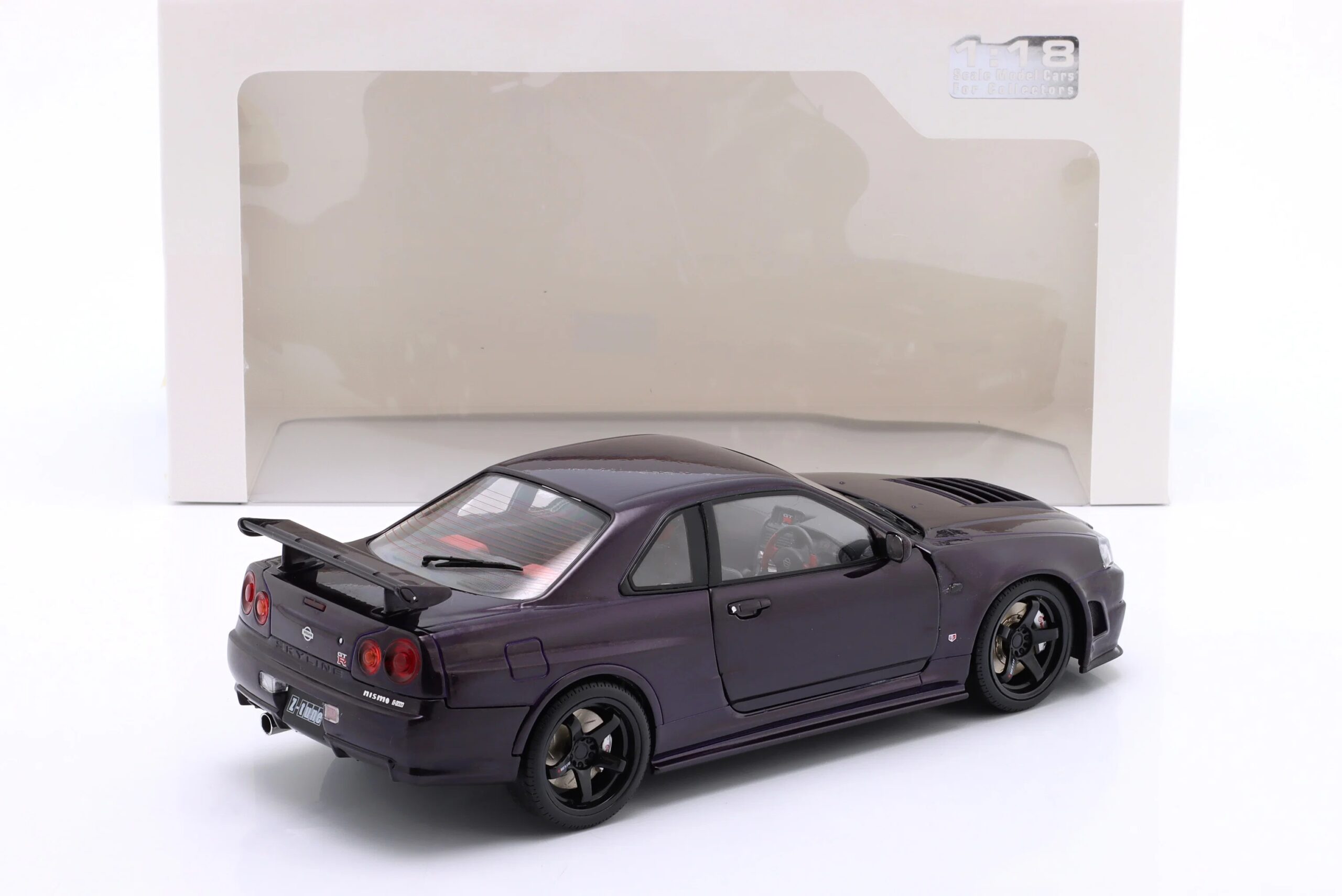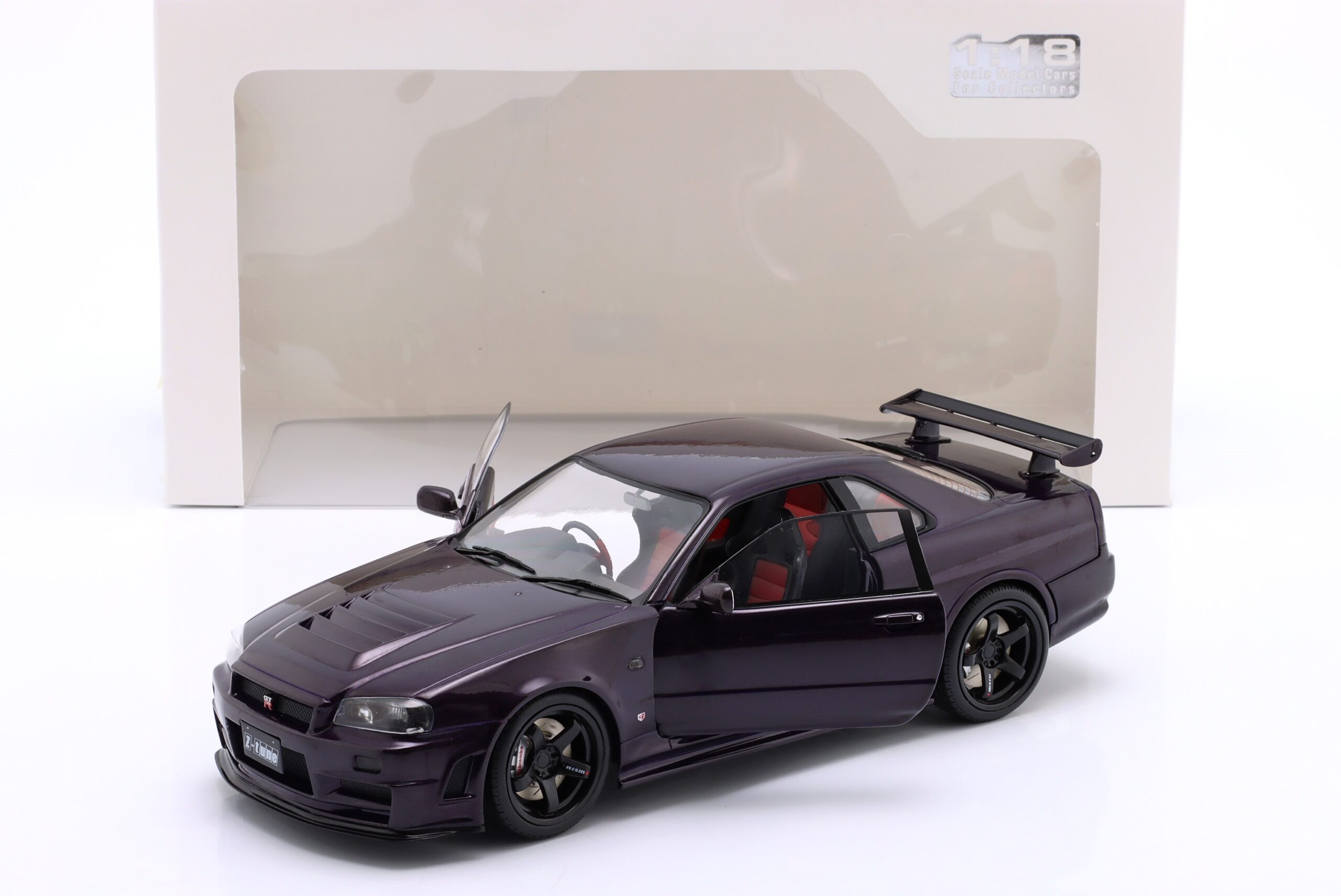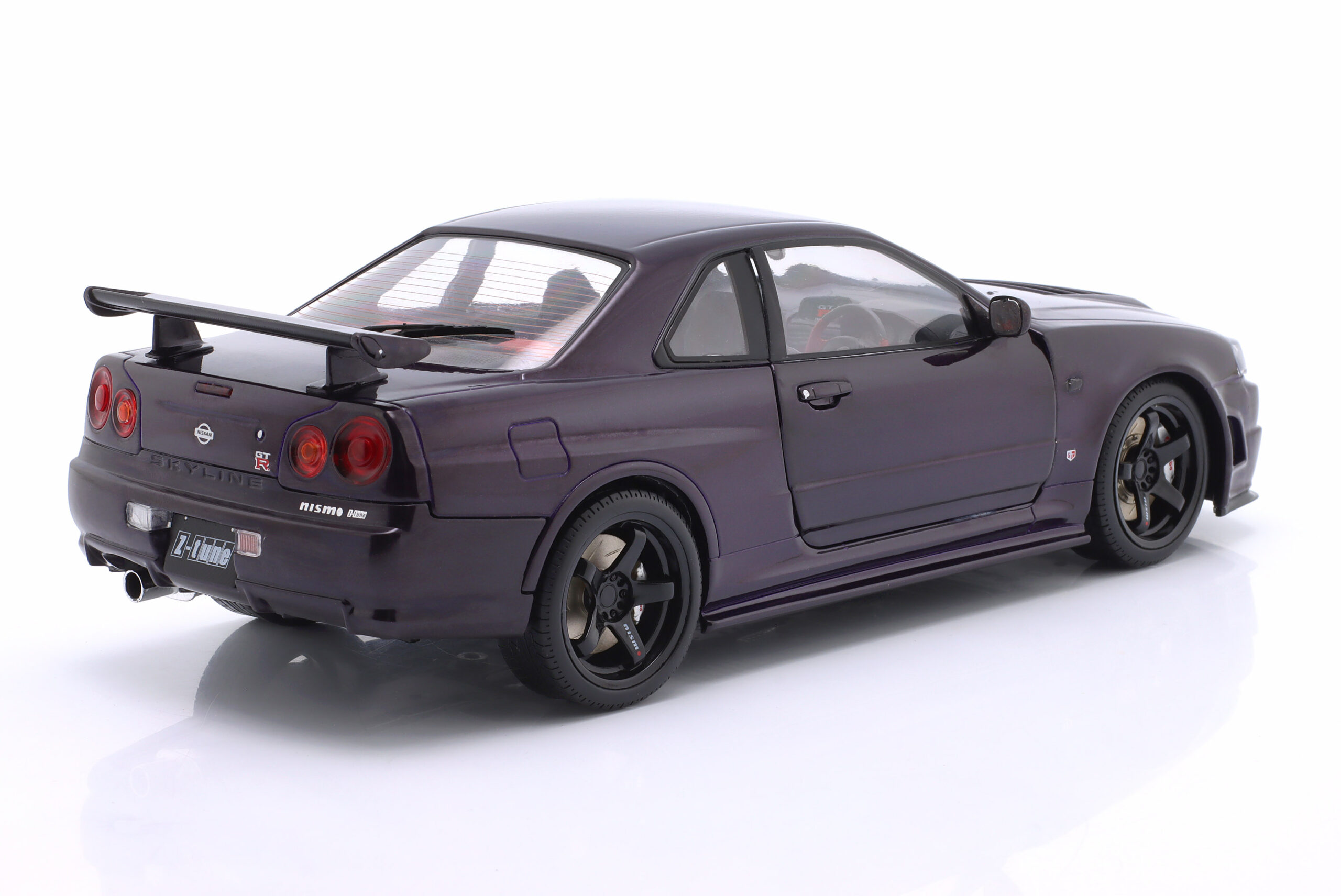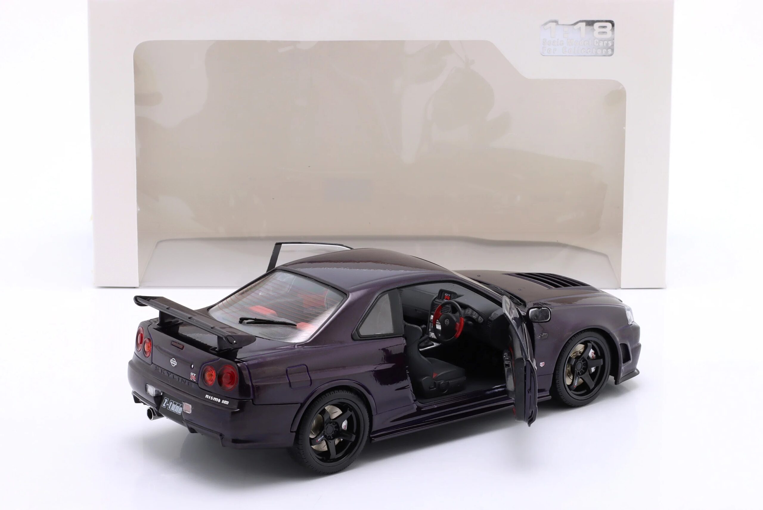 Kolekcjonerski model metalowy z elementami plastikowymi samochodu NISSAN SKYLINE (R34) GT-R Z Tune z roku 1999 w kolorze Midnight Purple.Model posiada otwierane drzwi.