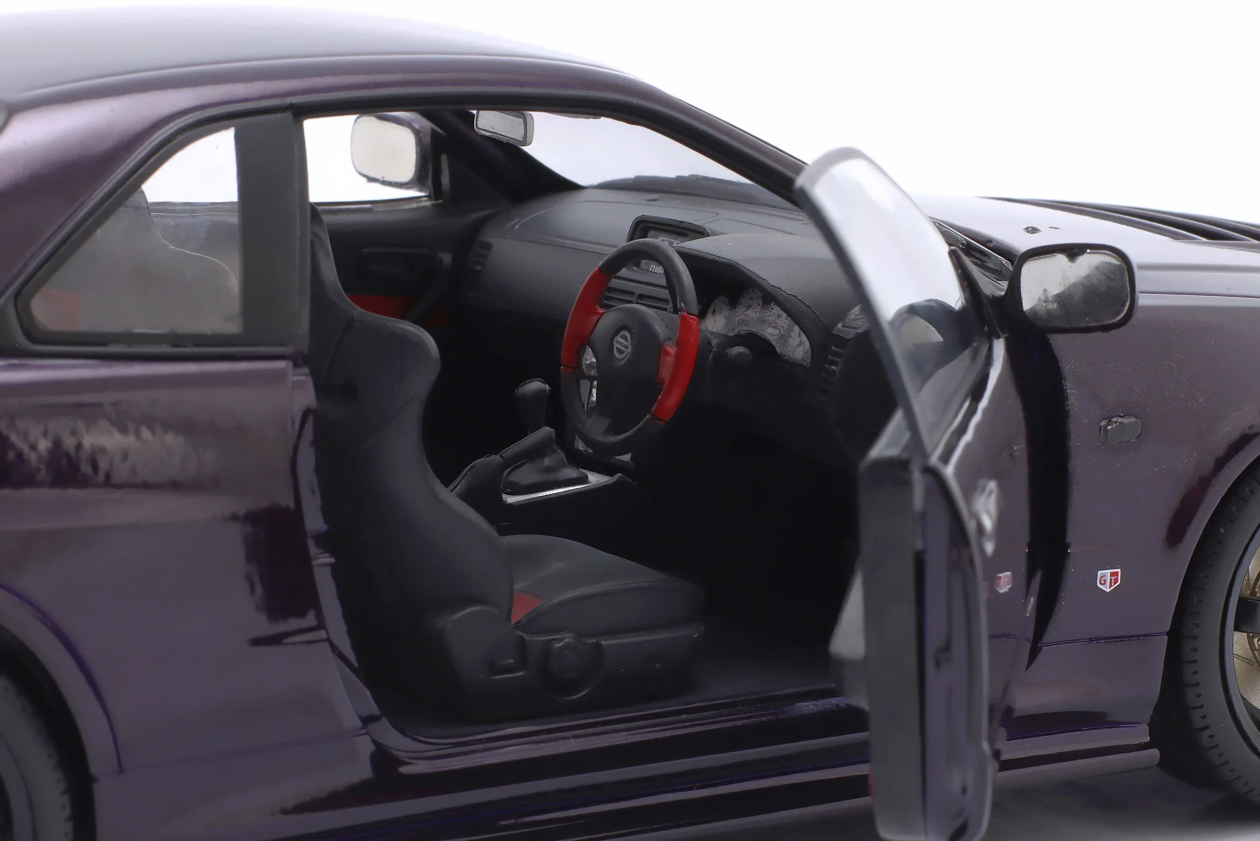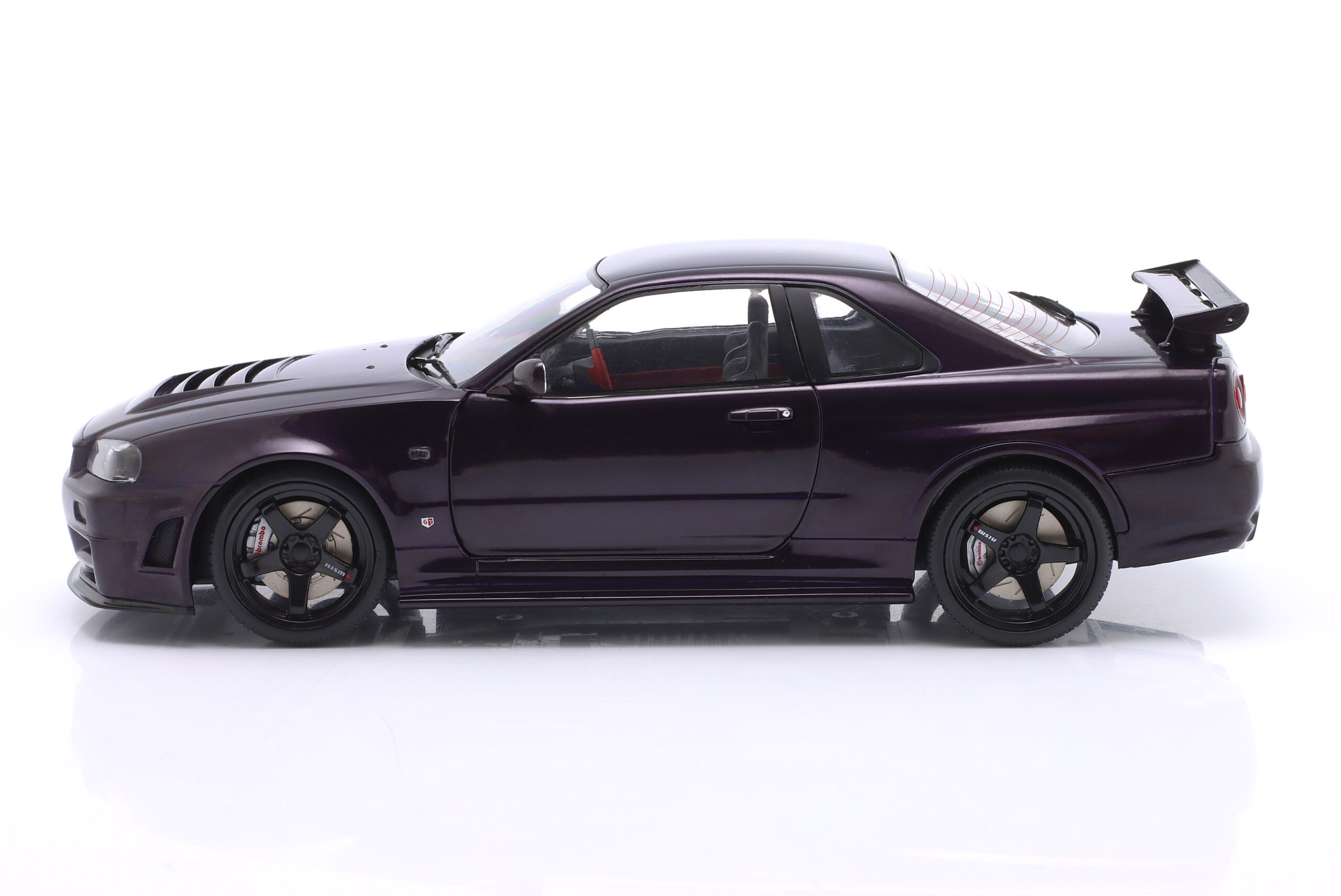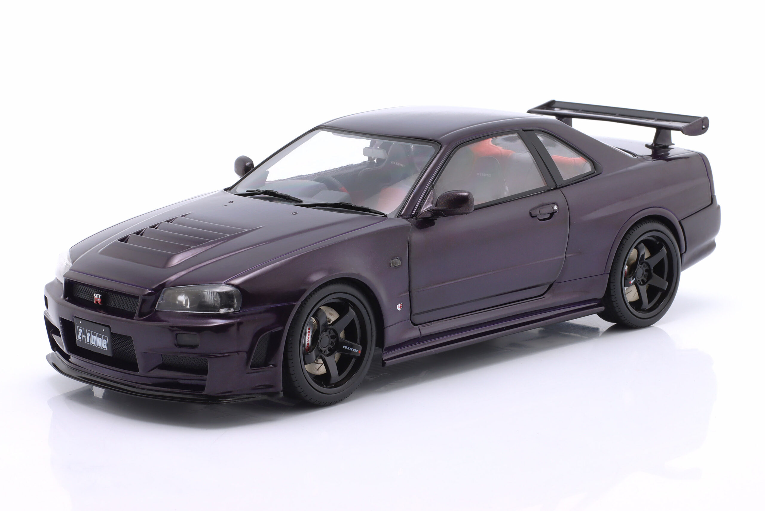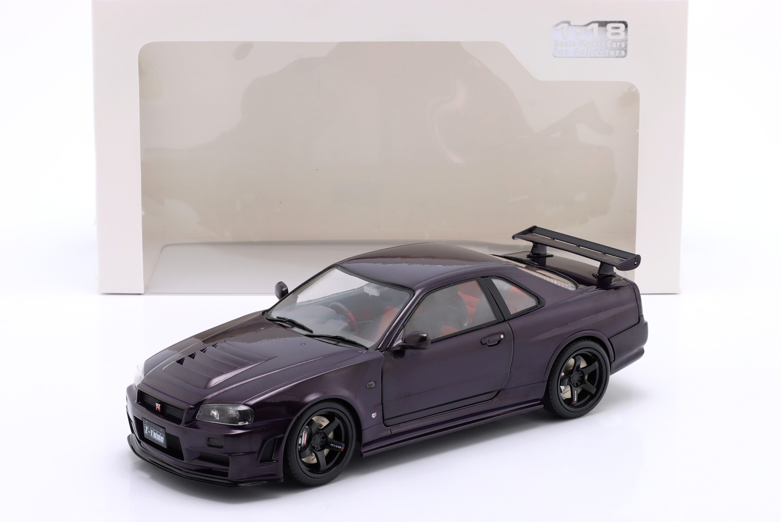 Kolekcjonerski model metalowy z elementami plastikowymi samochodu NISSAN SKYLINE (R34) GT-R Z Tune z roku 1999 w kolorze Midnight Purple.Model posiada otwierane drzwi.