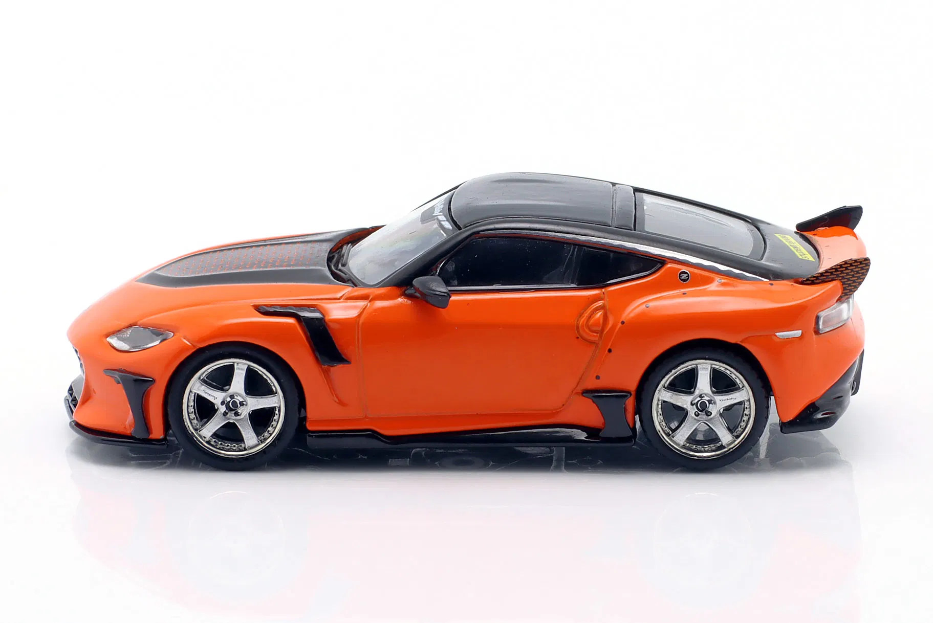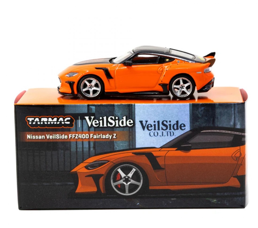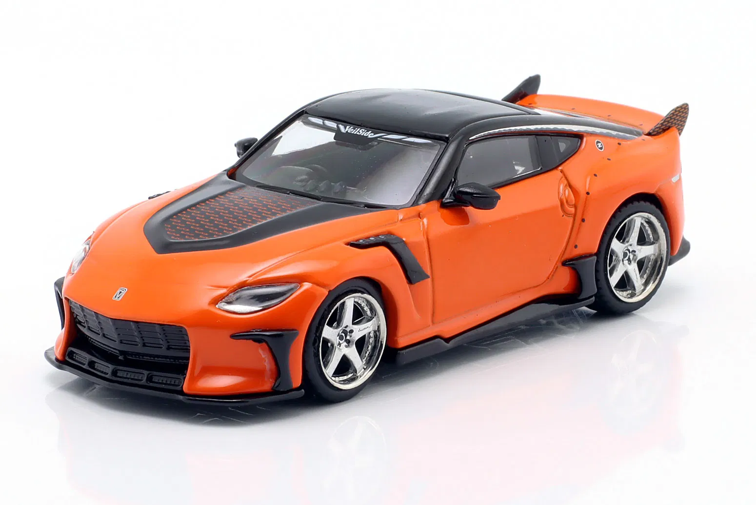 Kolekcjonerski model metalowy z elementami plastikowymi samochodu NISSAN VEILSIDE FFZ400 Fairlady Z w kolorze pomarańczowym.Model zapakowany w kartonowe pudełko z obrazkiem samochodu.