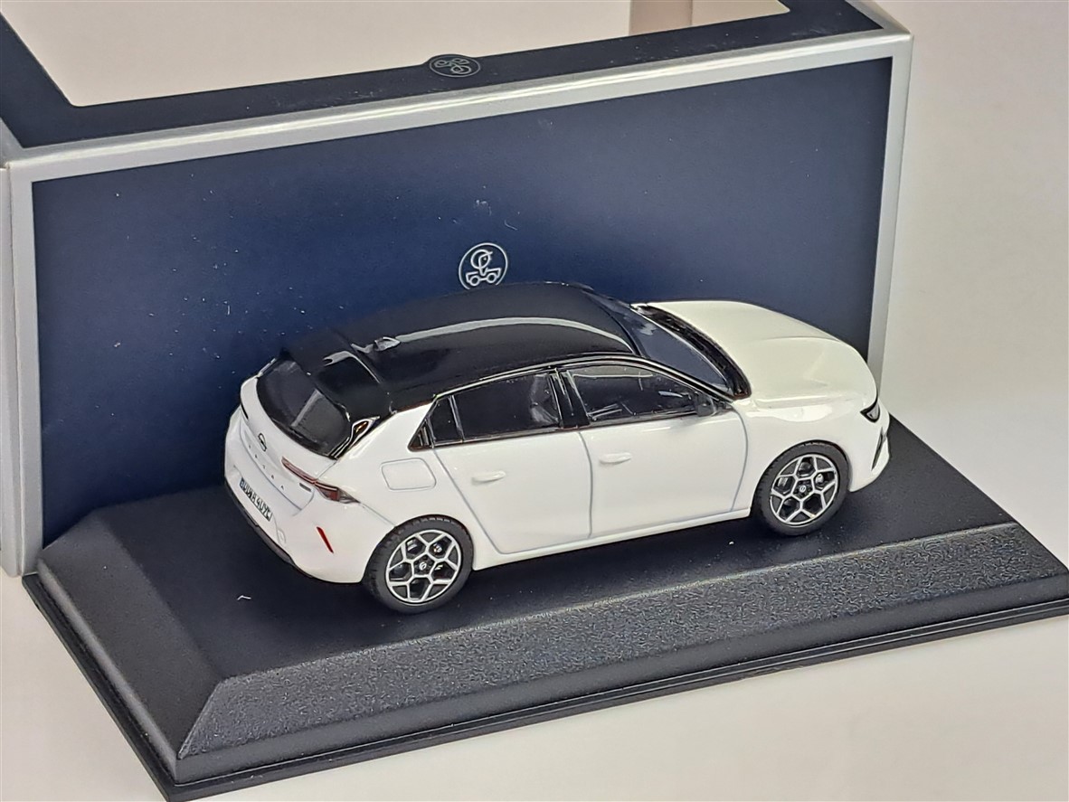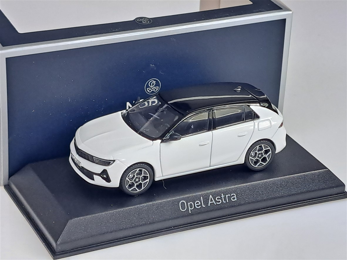 Kolekcjonerski model metalowy z elementami plastikowymi samochodu OPEL ASTRA z roku 2022 w kolorze Arctic White.Model w skali 1:43,model na podstawce posiada akrylową gablotkę ekspozycyjną.