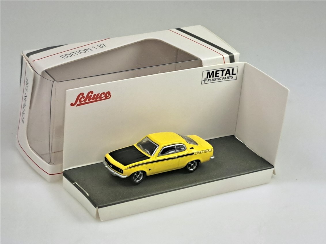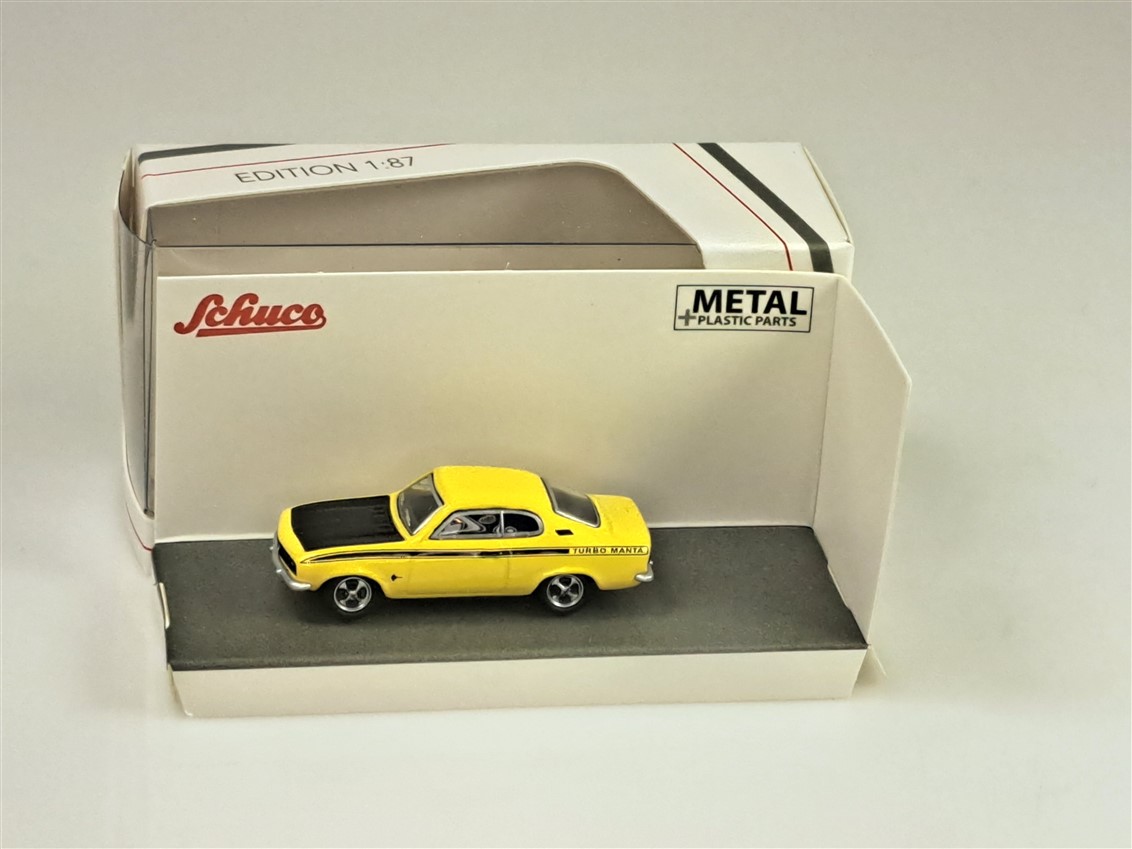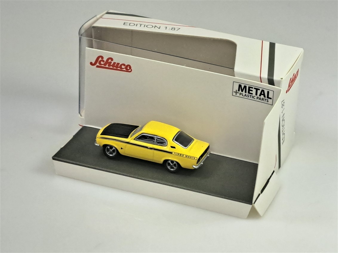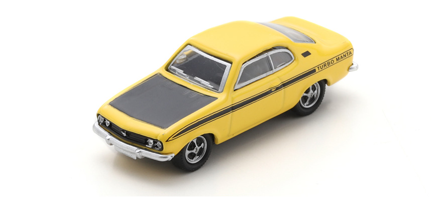 Kolekcjonerski model metalowy z elementami plastikowymi samochodu OPEL MANTA „Turbo Manta” w kolorze Żółtym.