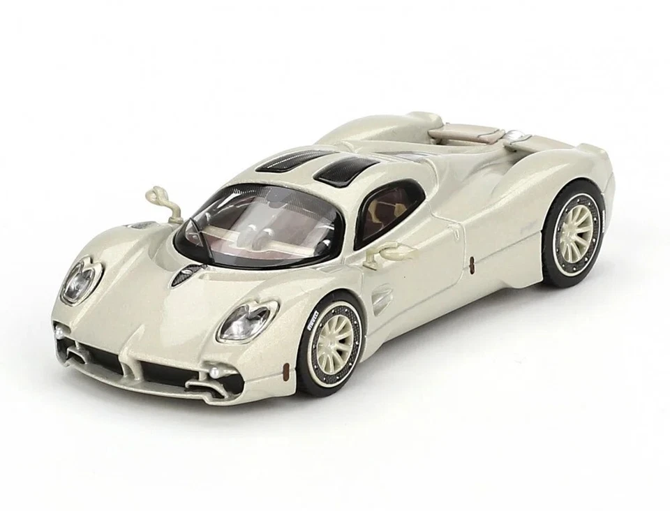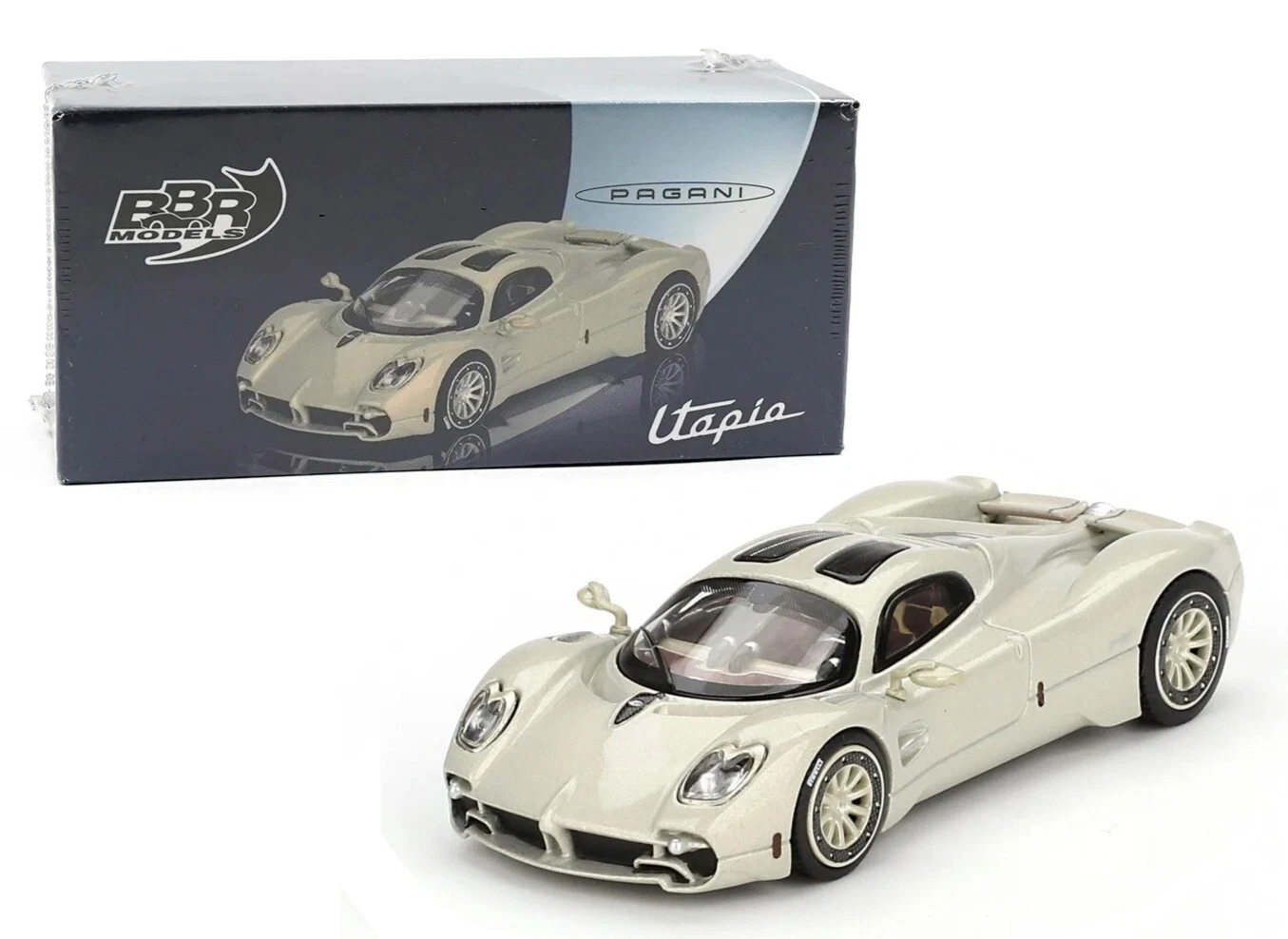 Kolekcjonerski model metalowy z elementami plastikowymi samochodu PAGANI UTOPIA Presentation z roku 2023 w kolorze Grigio Rinascimento .Model zapakowany w kartonowe pudełko z rysunkiem samochodu.