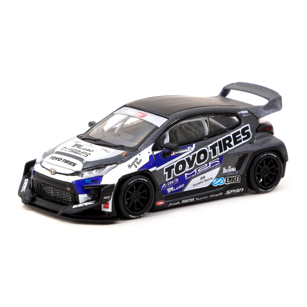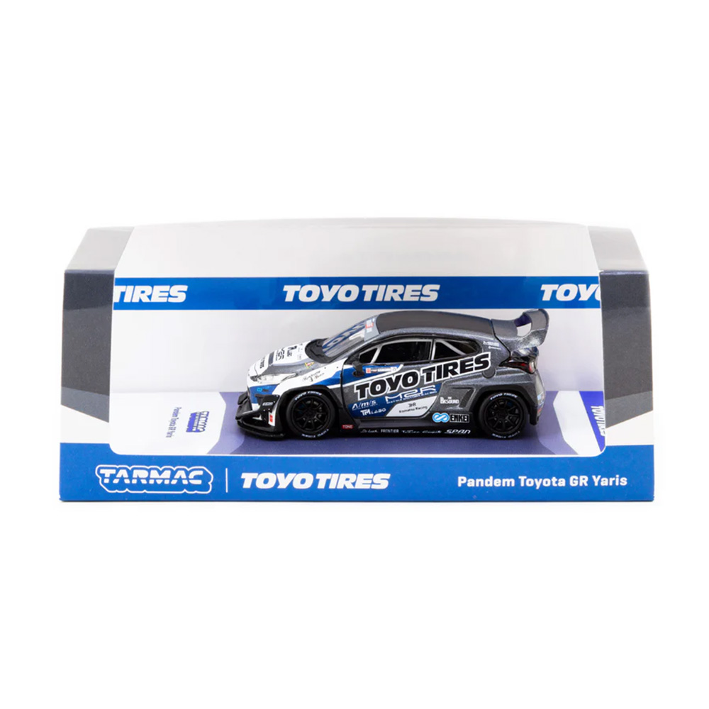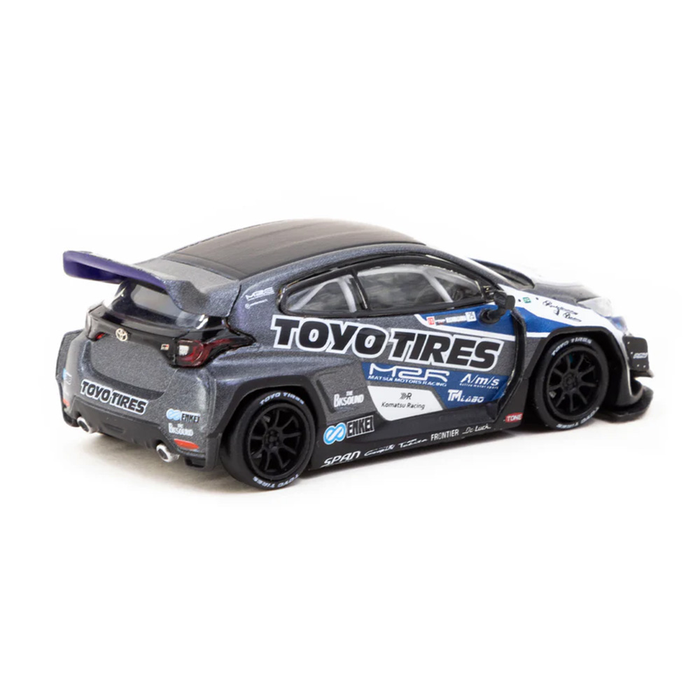Kolekcjonerski model metalowy z elementami plastikowymi samochodu PANDEM TOYOTA GR Yaris „TOYO Tires” w kolorze Czarny/niebieski.