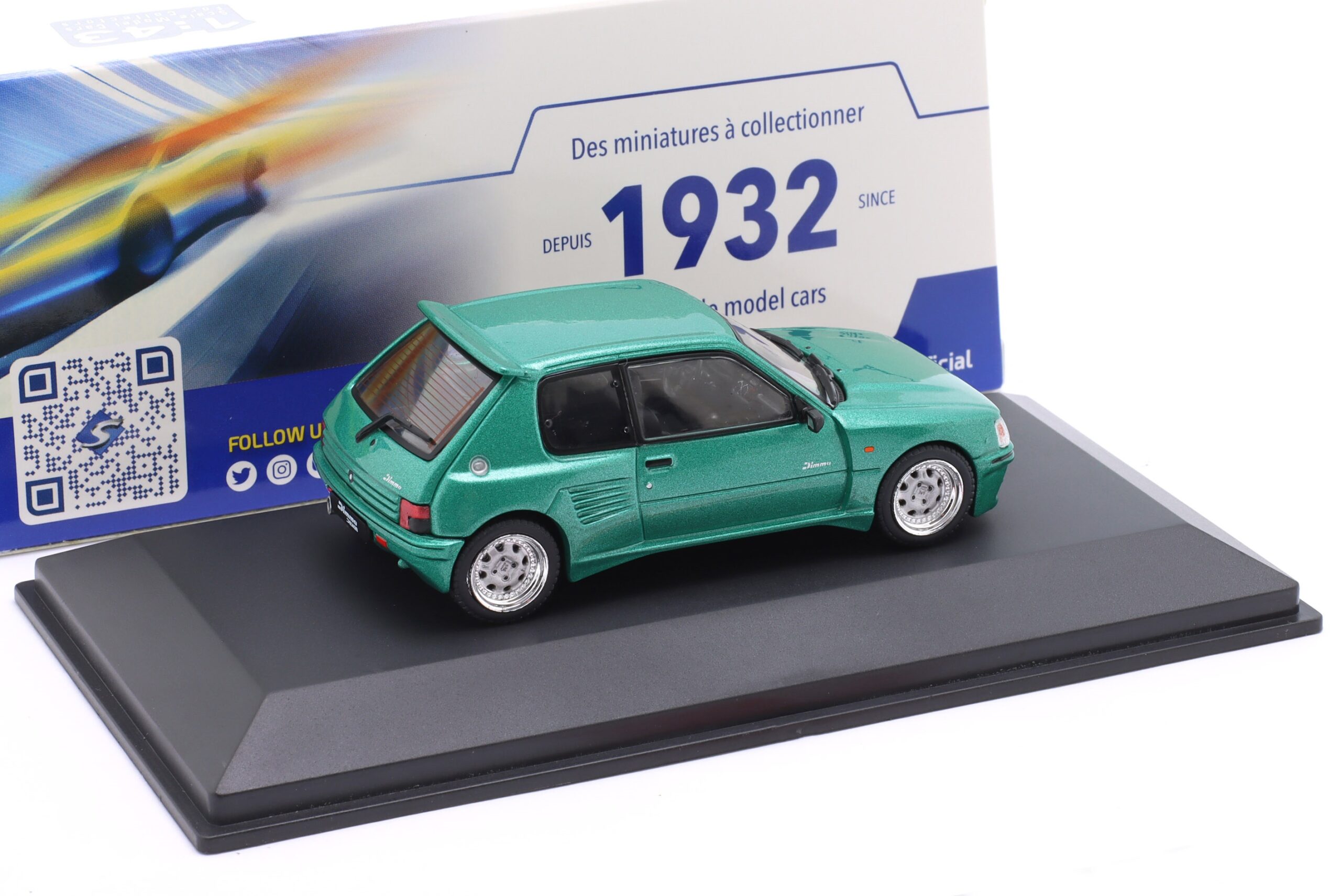 Kolekcjonerski model metalowy z elementami plastikowymi samochodu PEUGEOT 205 DIMMA Body Kit z roku 1992 w kolorze Zielony metallic.Model na podstawce,posiada akrylową gablotkę ekspozycyjną.