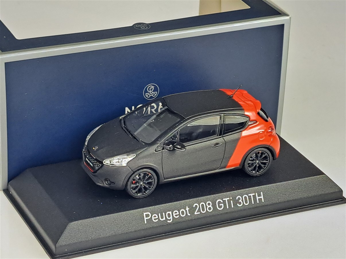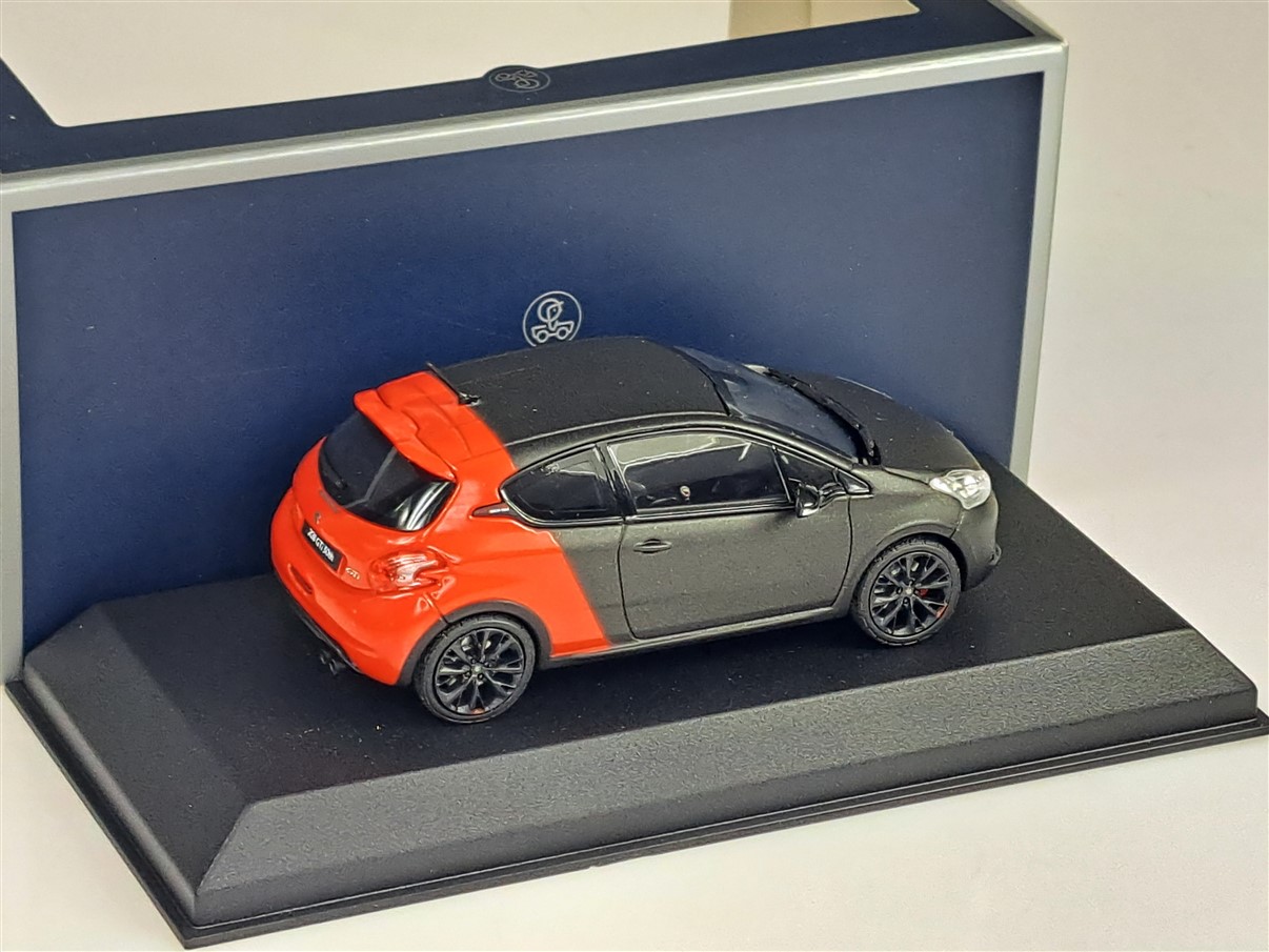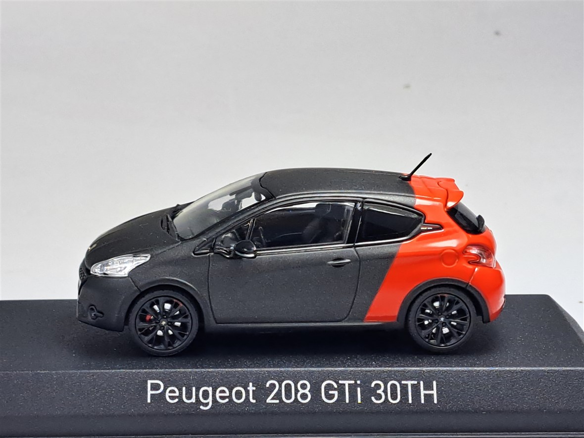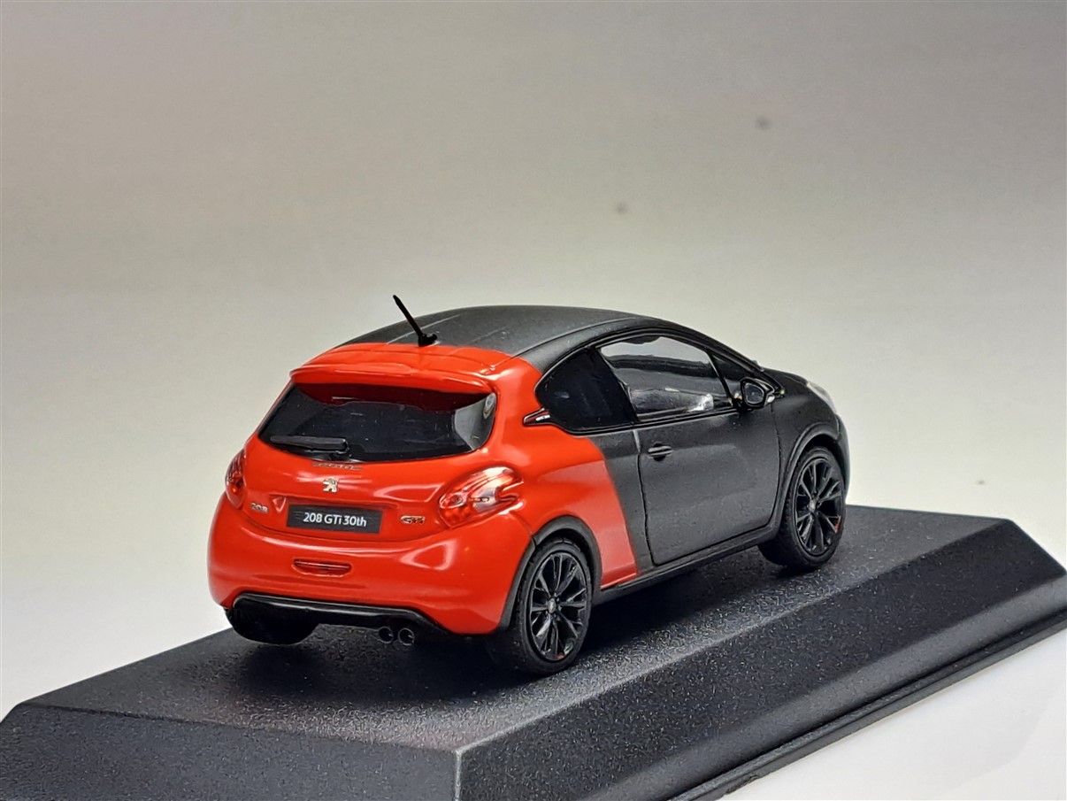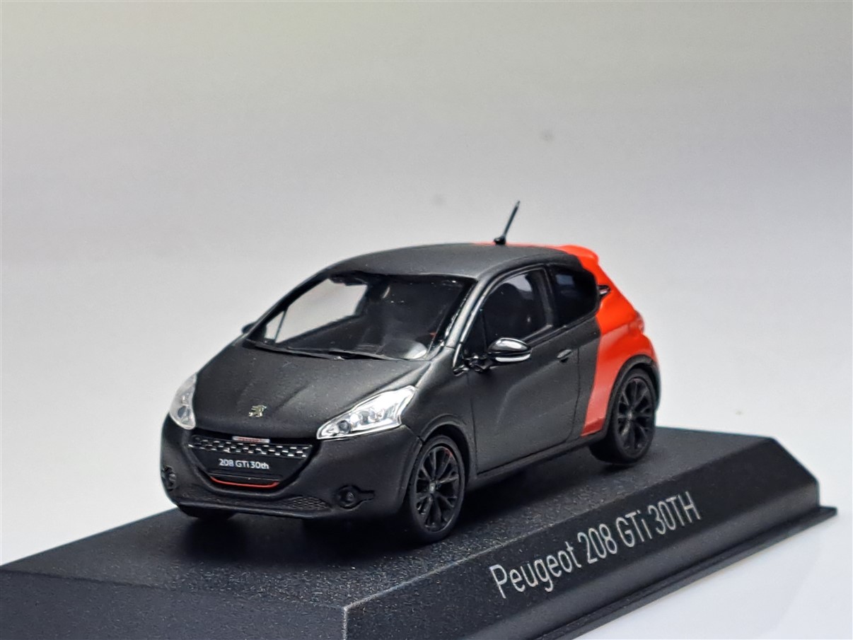 Kolekcjonerski model metalowy z elementami plastikowymi samochodu PEUGEOT 208 GTi 30th z roku 2014 w kolorze Czarny matowy/Czerwony.