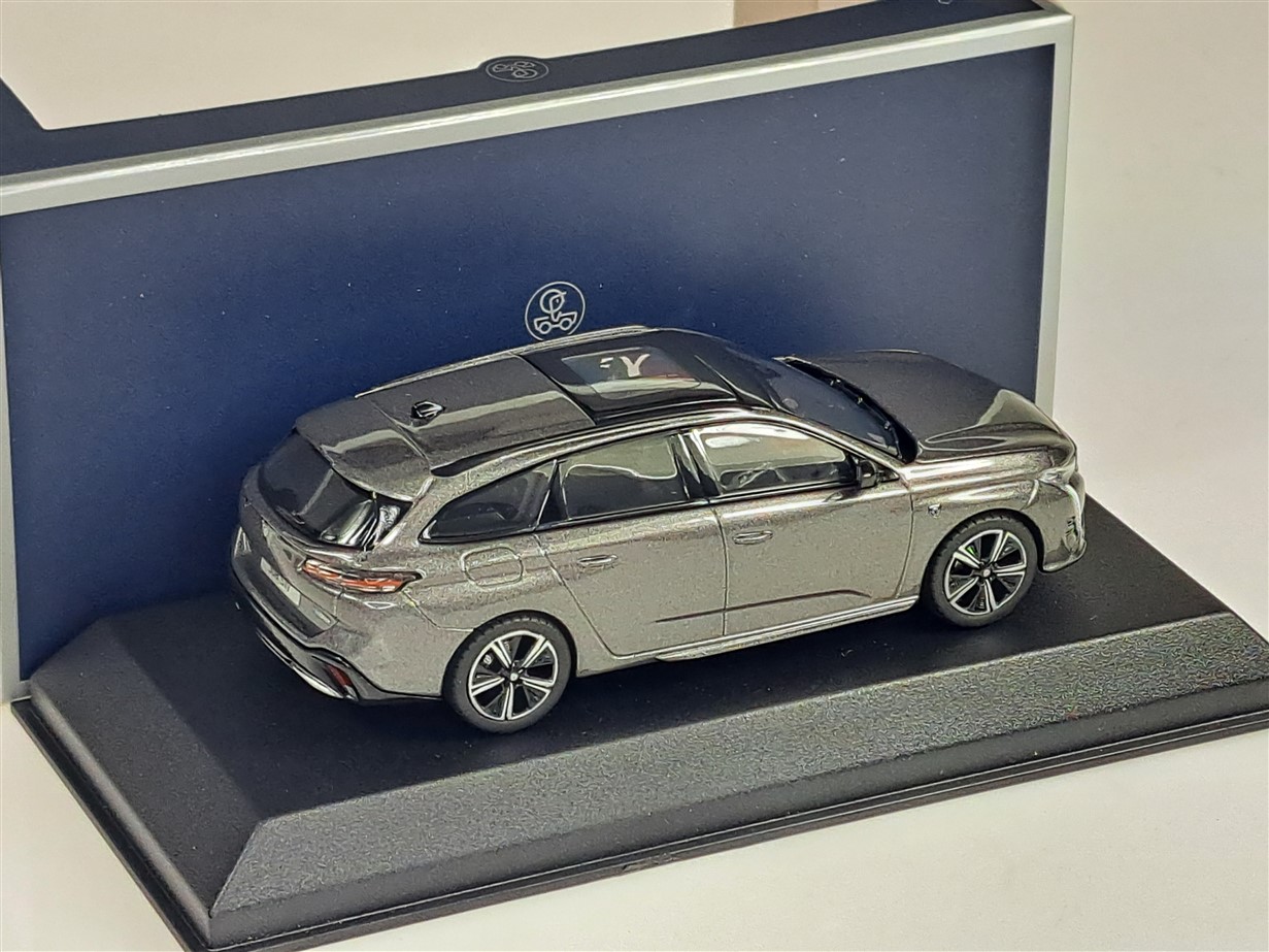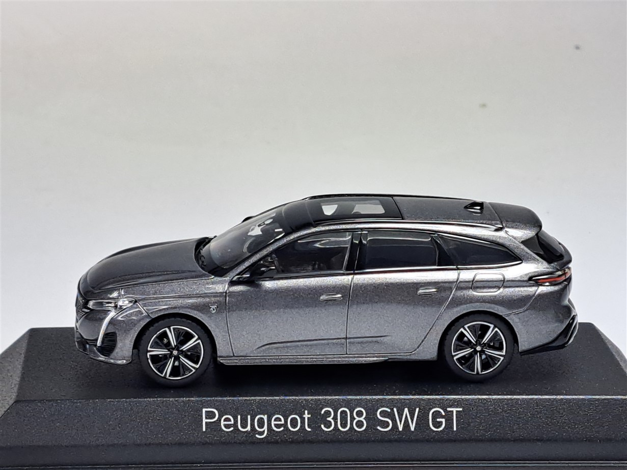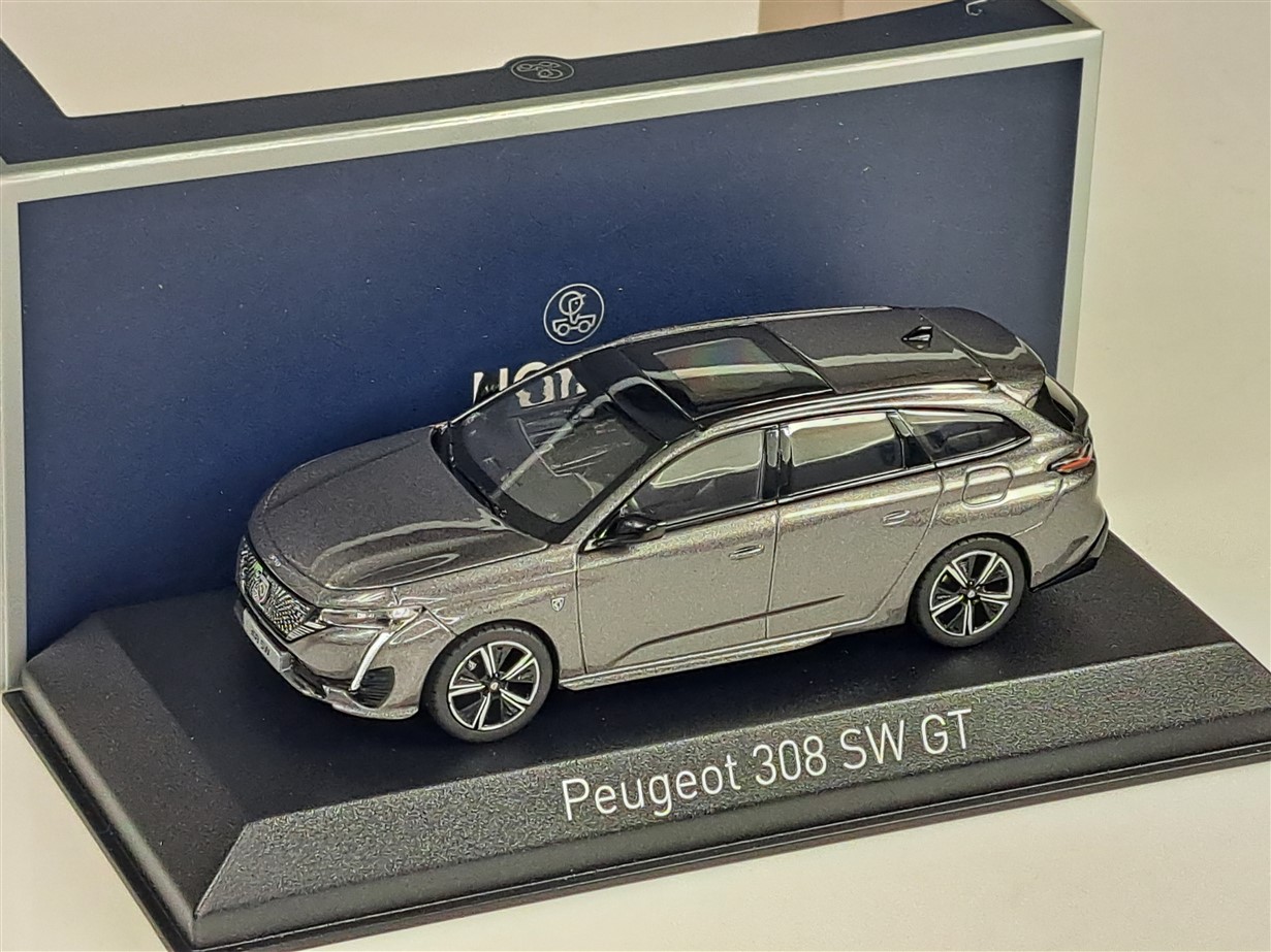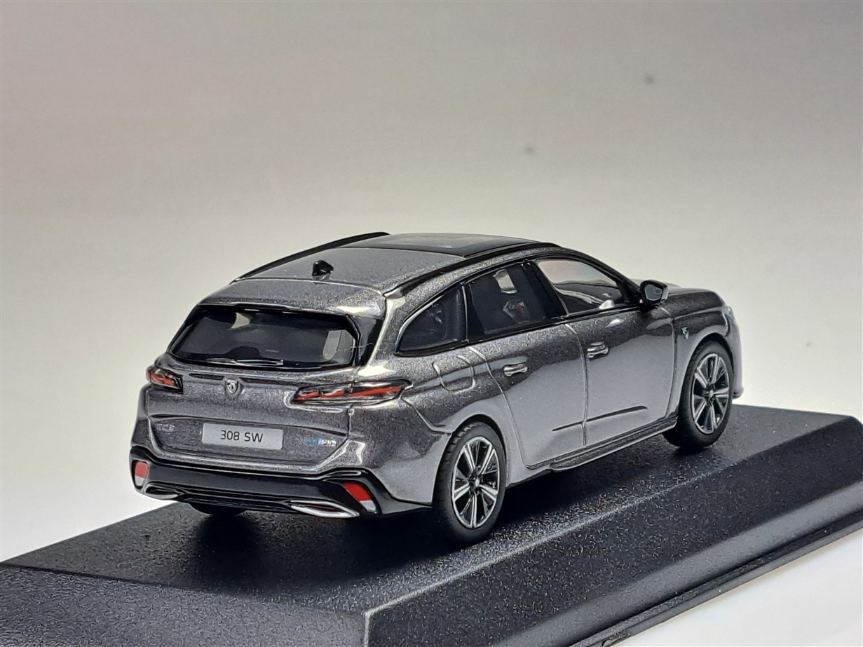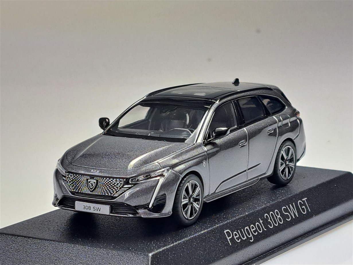 Kolekcjonerski model metalowy z elementami plastikowymi samochodu PEUGEOT 308 SW GT z roku 2021 w kolorze Platinium Grey.