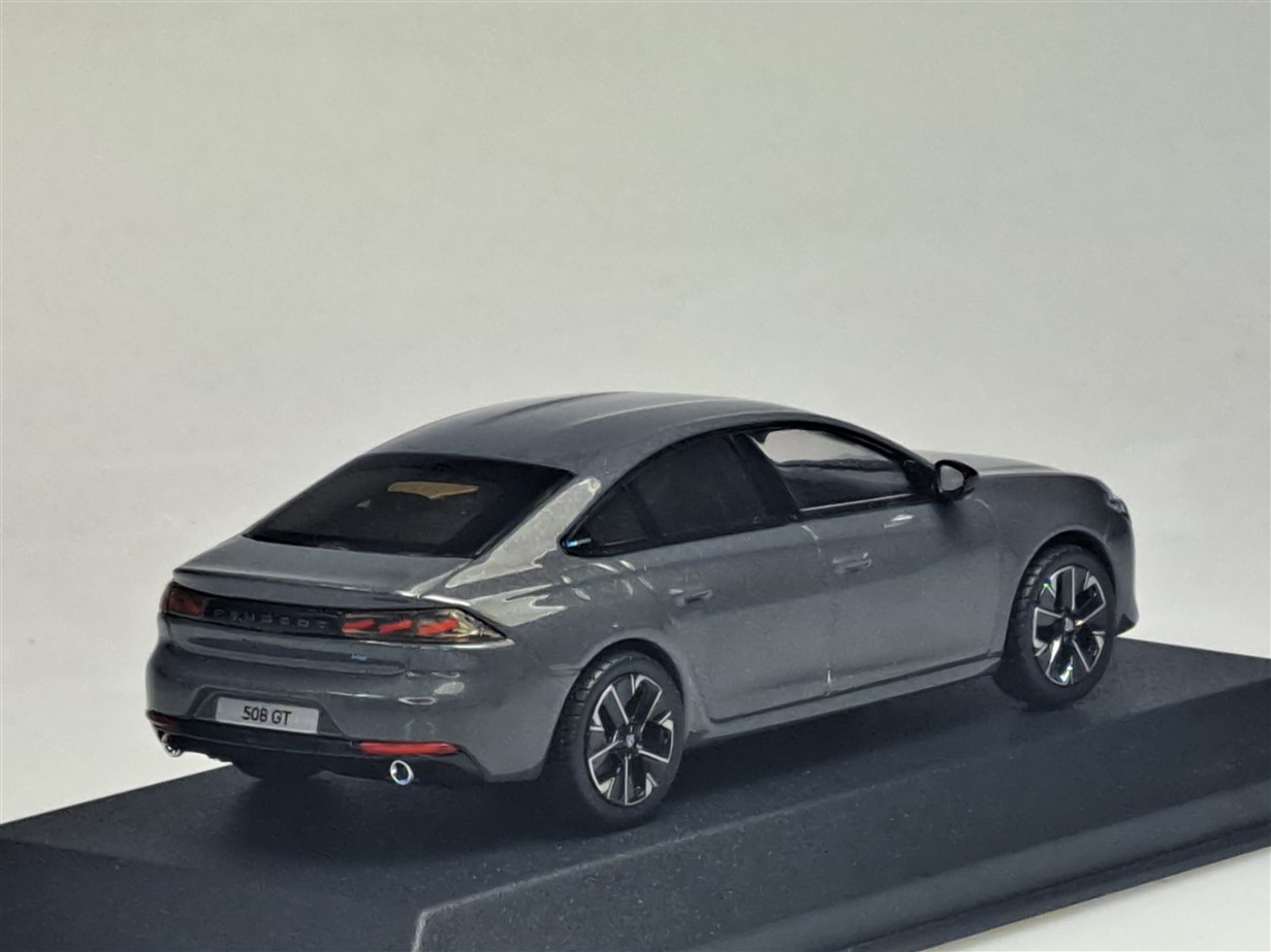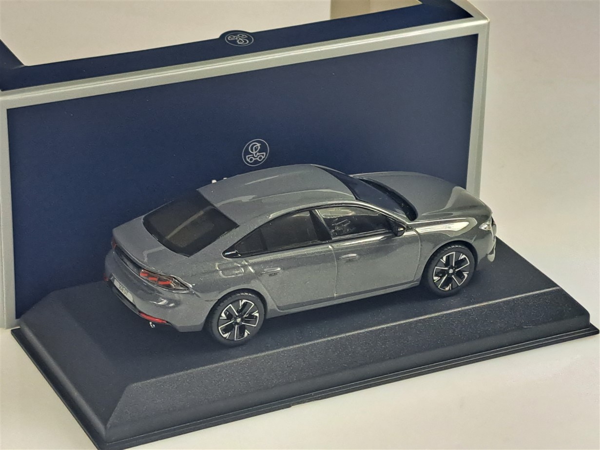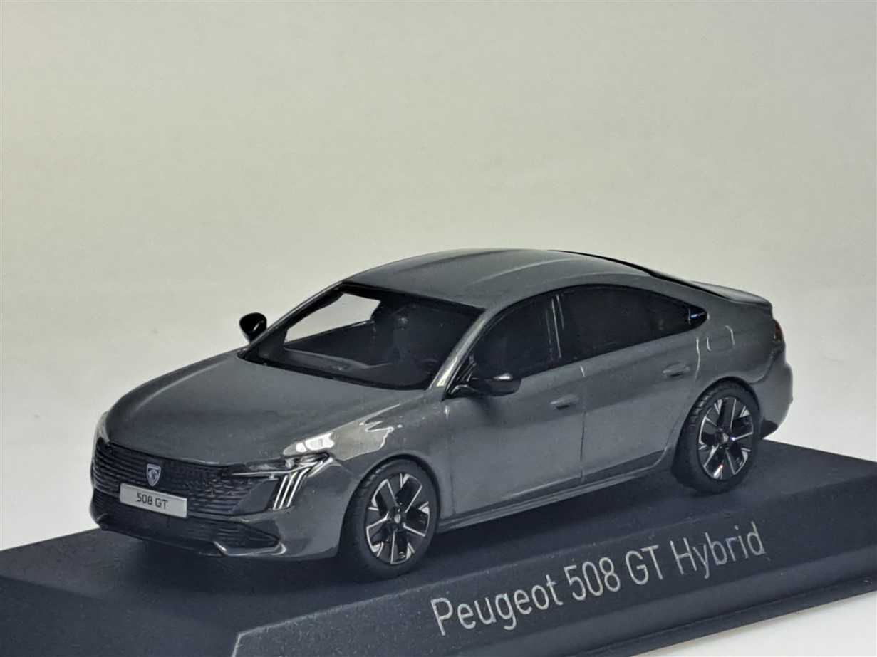 Kolekcjonerski model metalowy z elementami plastikowymi samochodu PEUGEOT 508 GT Hybrid z roku 2023 w kolorze Selenium Grey.