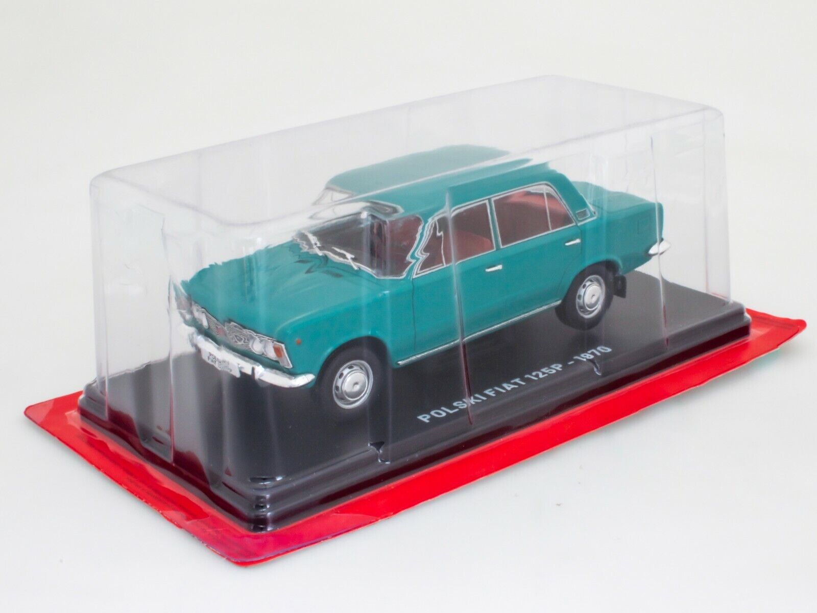 Kolekcjonerski model metalowy z elementami plastikowymi samochodu Polski FIAT 125p z roku 1970 w kolorze Zielonym.Model na podstawce,nie posiada otwieranych elementów,zapakowany w blister.