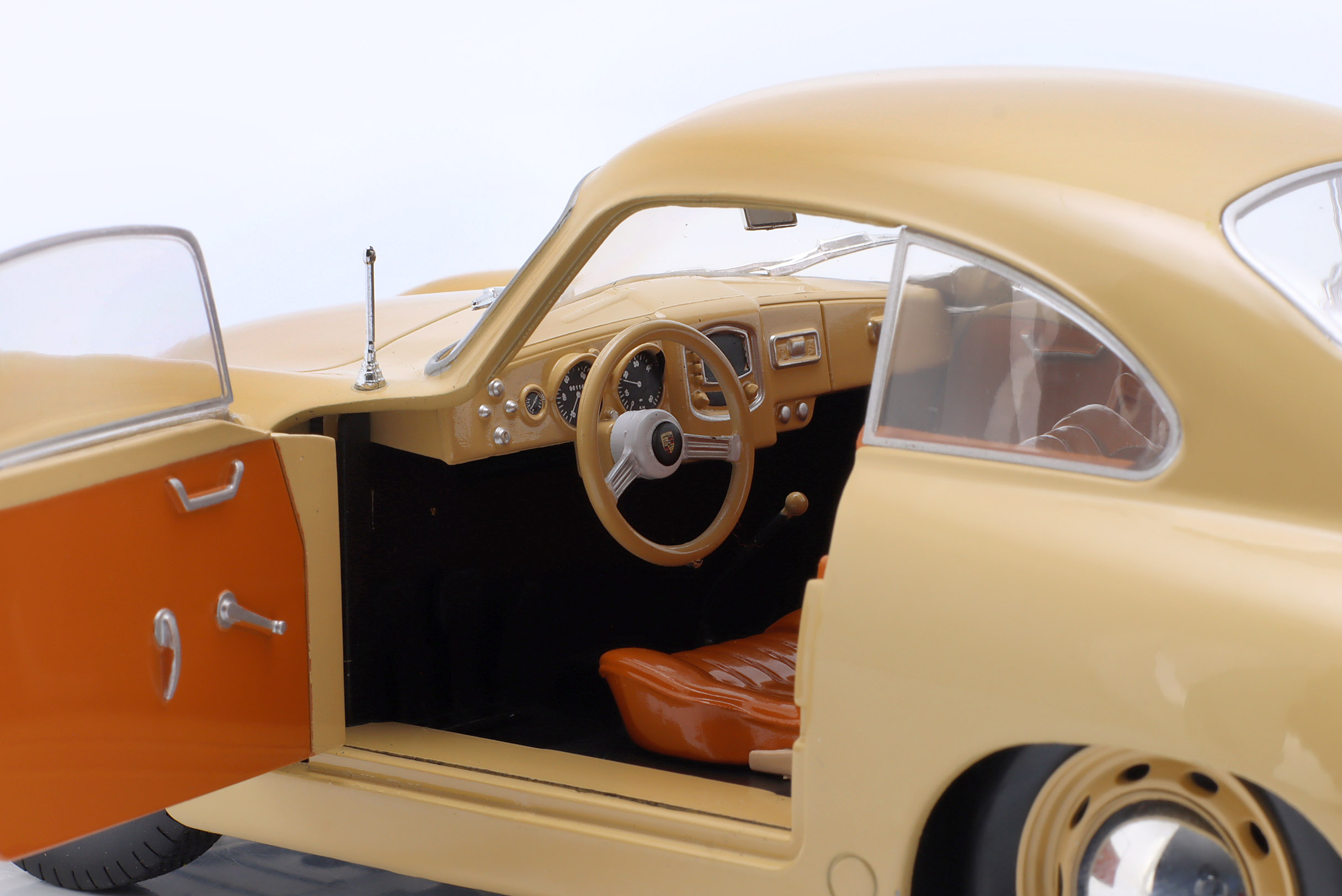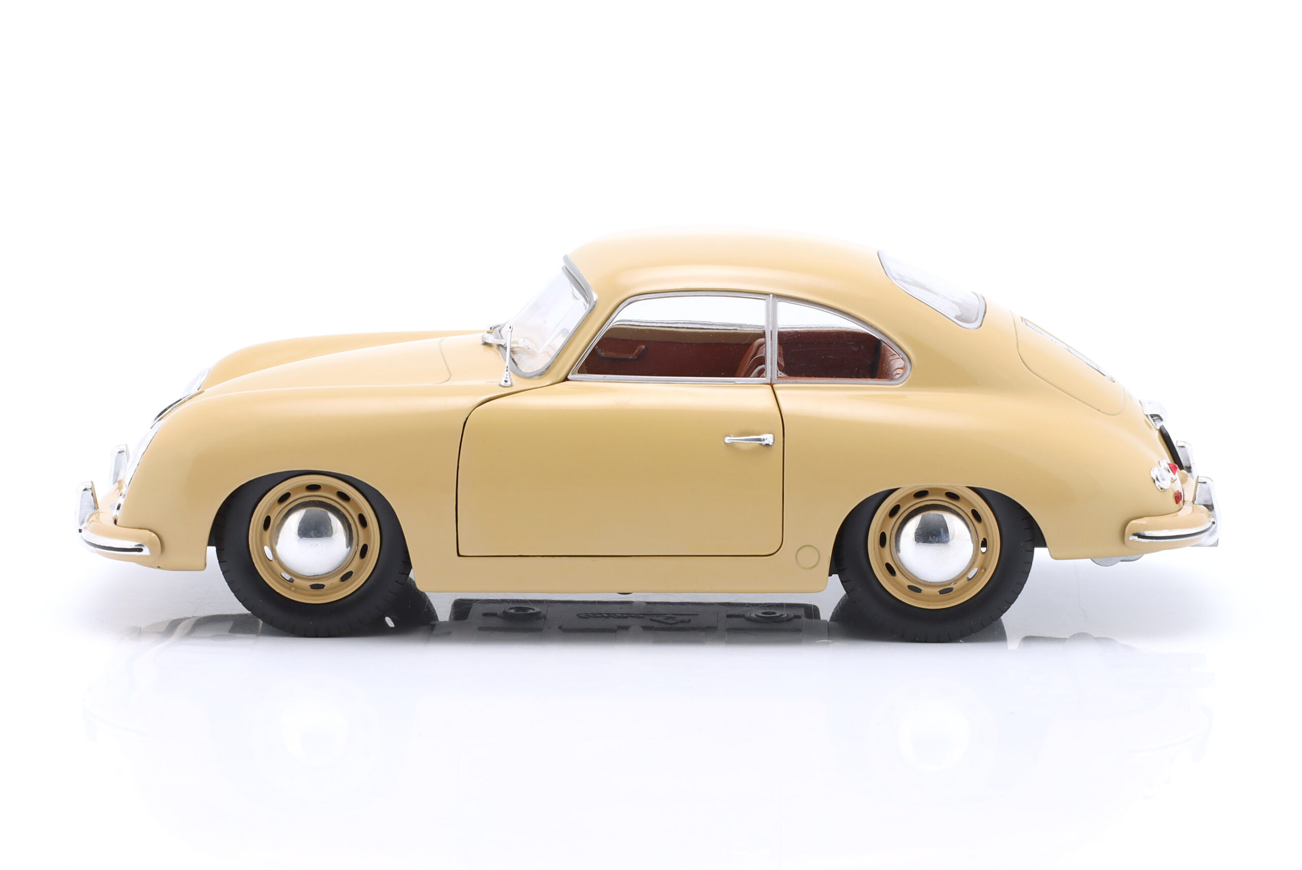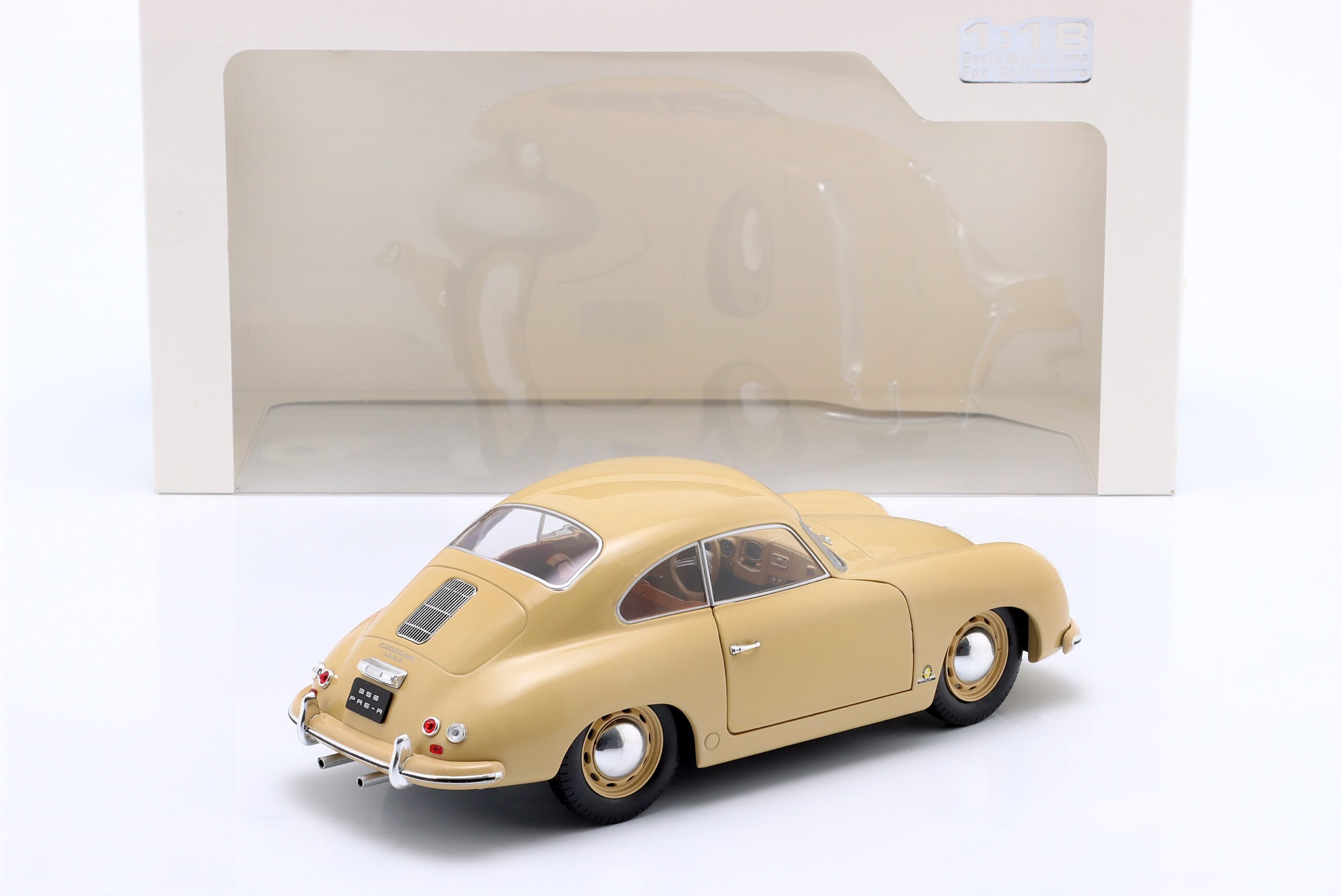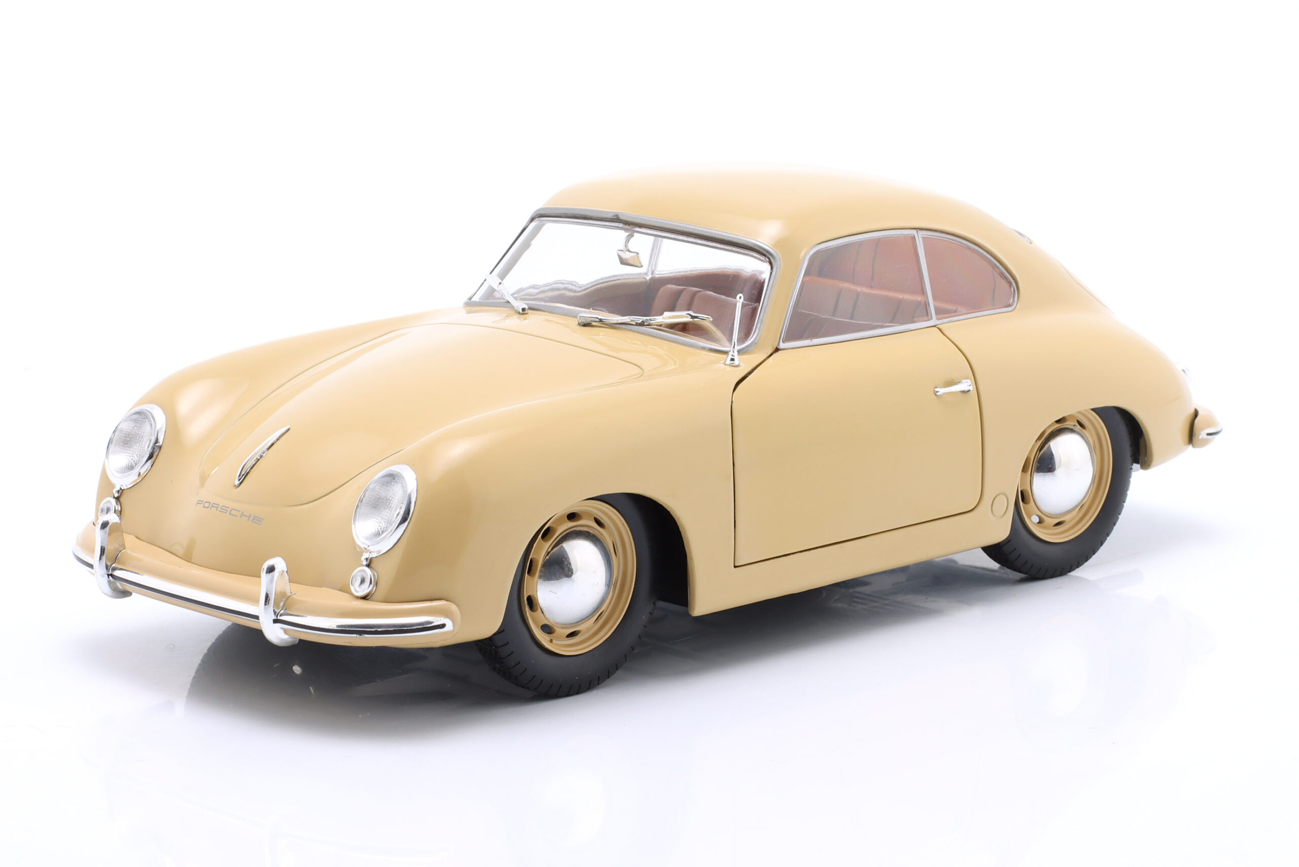 Kolekcjonerski model metalowy z elementami plastikowymi samochodu PORSCHE 356 Pre-A z roku 1953 w kolorze Jasnobrązowym.