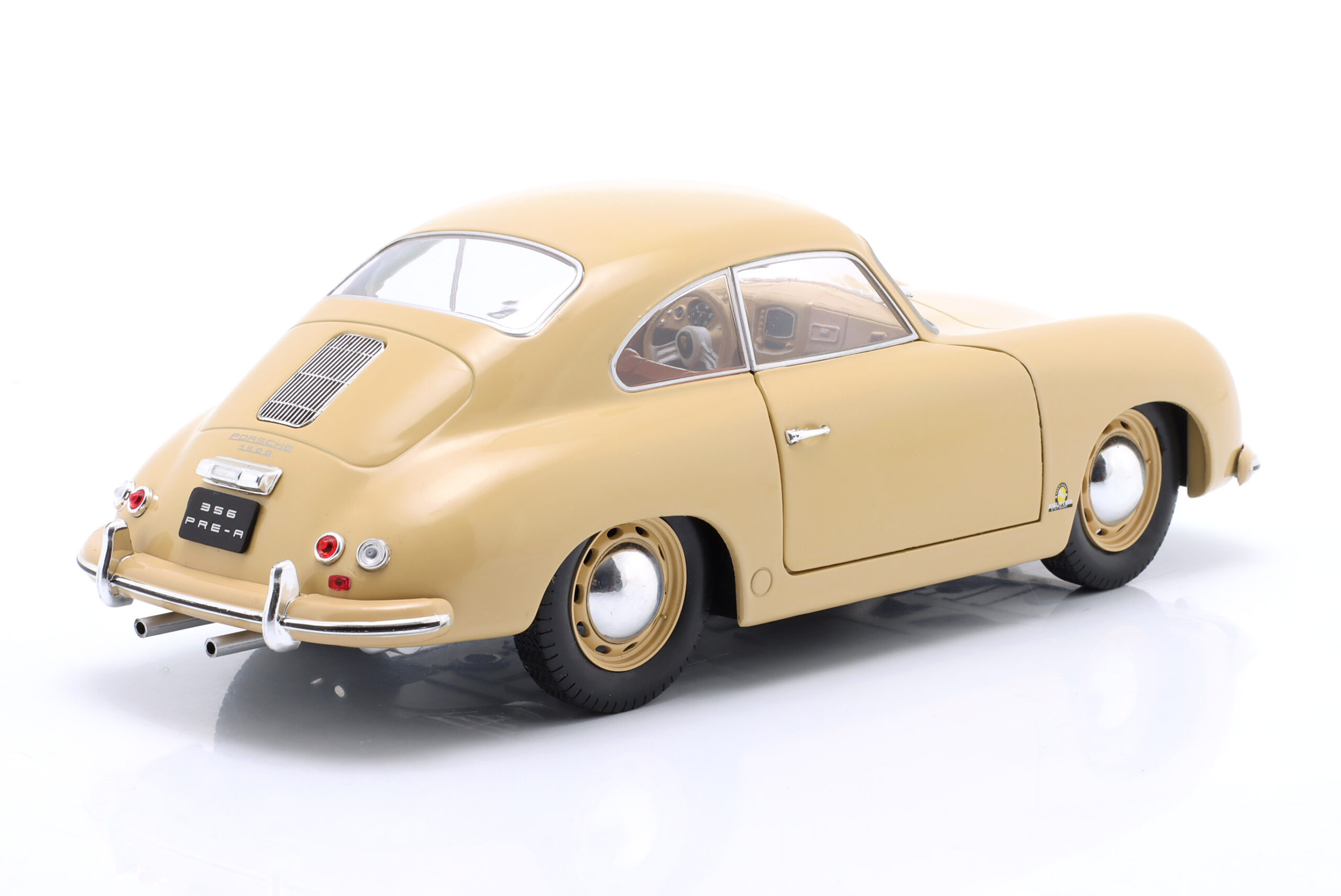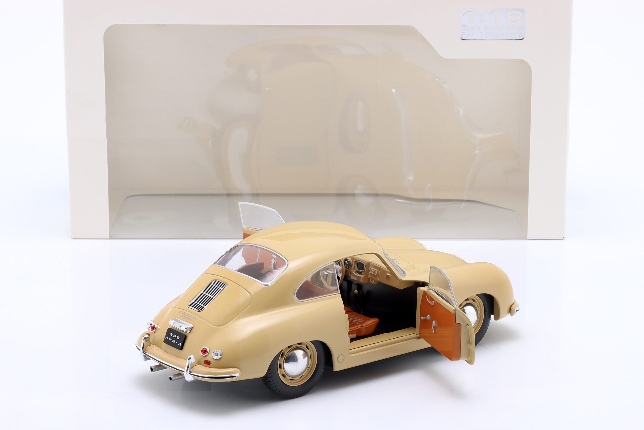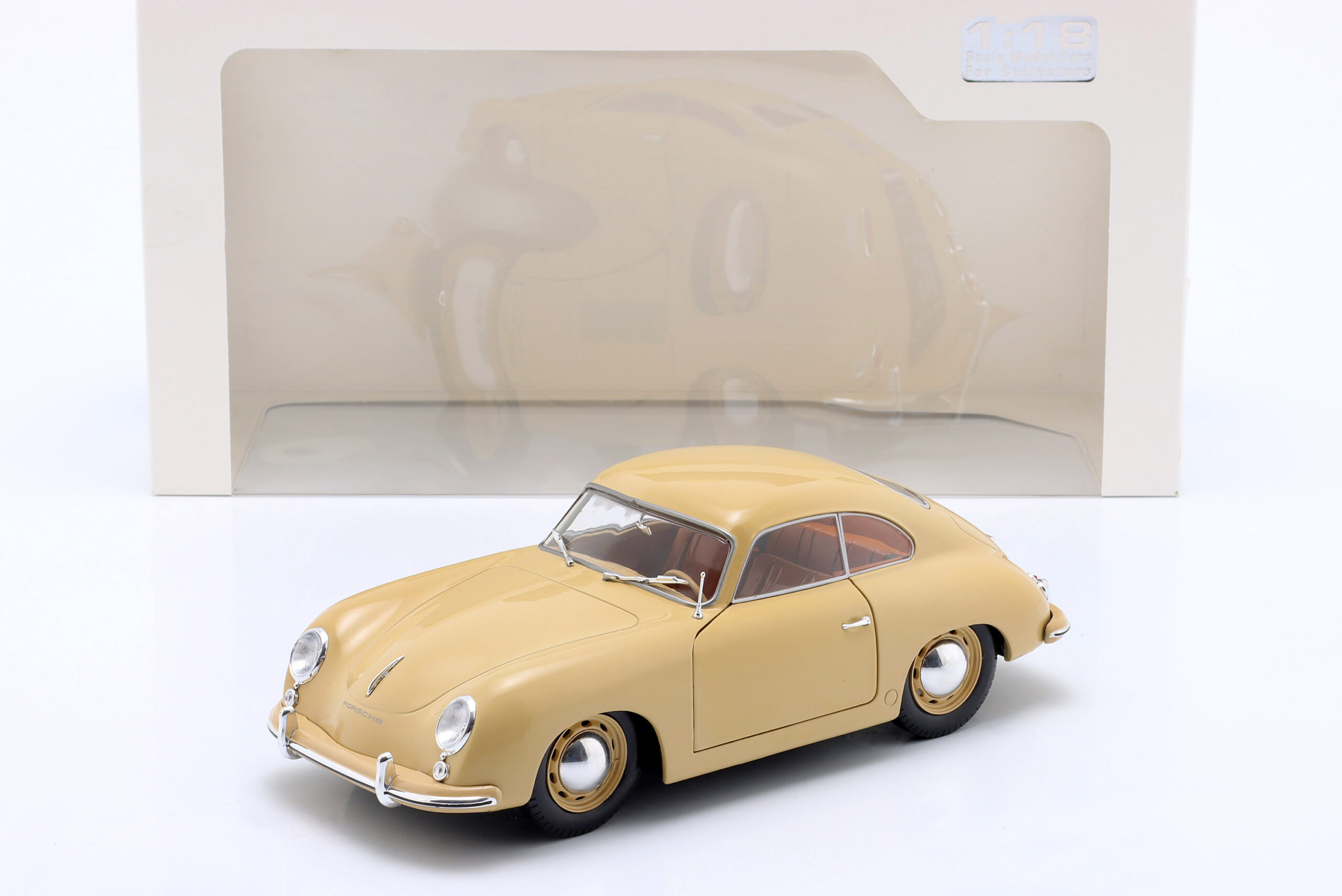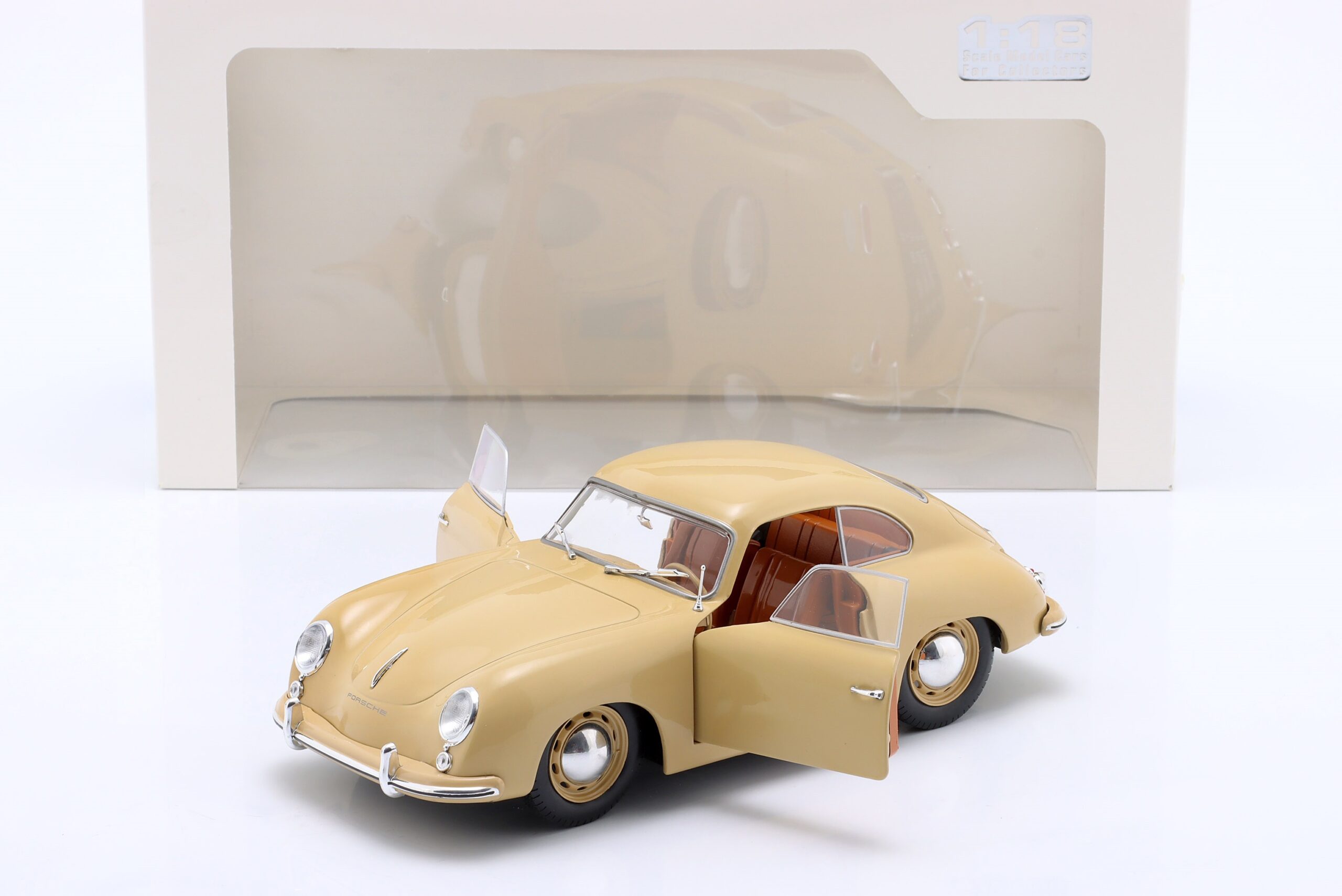 Kolekcjonerski model metalowy z elementami plastikowymi samochodu PORSCHE 356 Pre-A z roku 1953 w kolorze Jasnobrązowym.