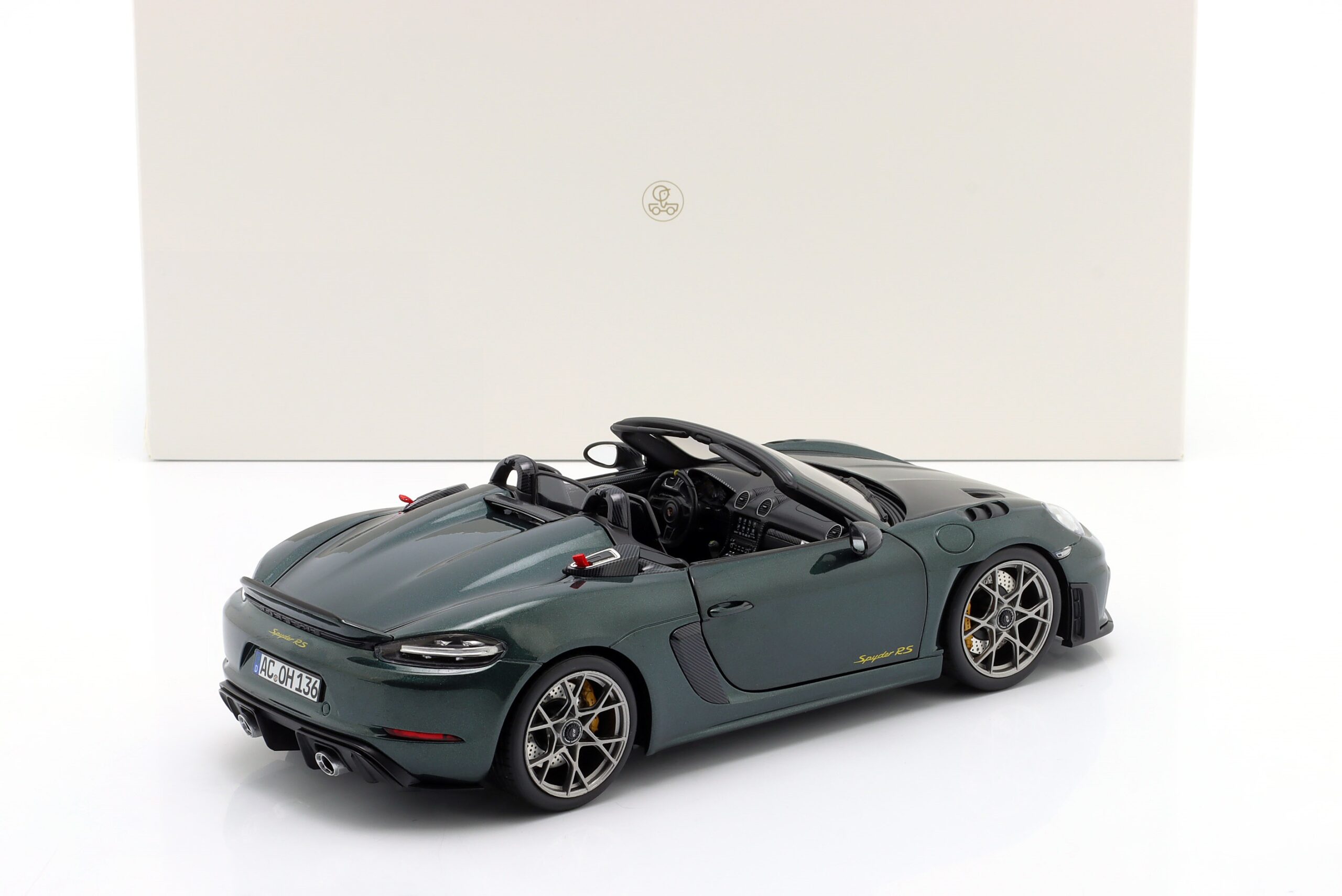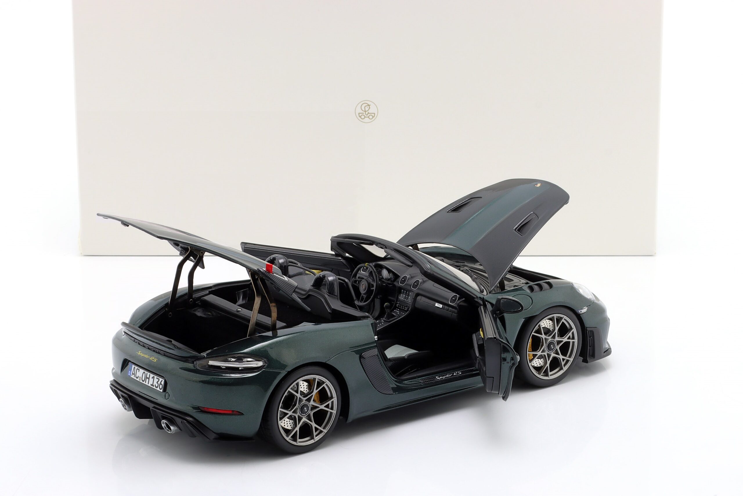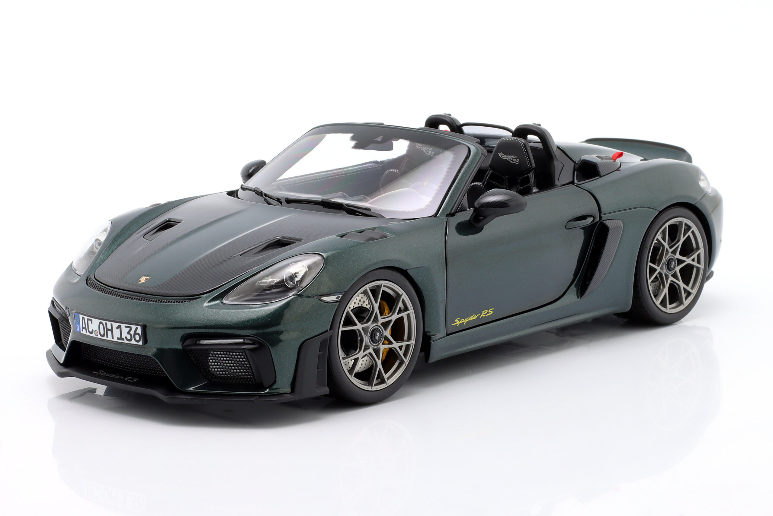 Kolekcjonerski model metalowy z elementami plastikowymi samochodu PORSCHE 718 Spyder RS w/ Weissach Pack z roku 2023 w kolorze Forest Green.Model posiada otwierane drzwi,pokrywę silnika oraz bagażnika.