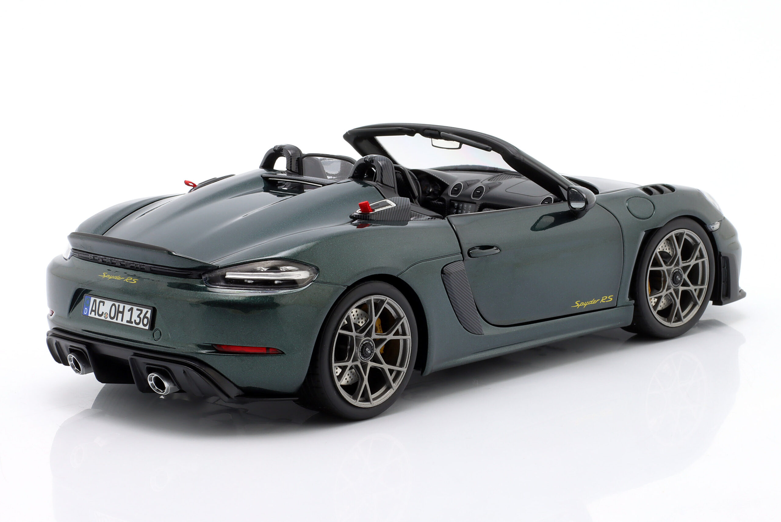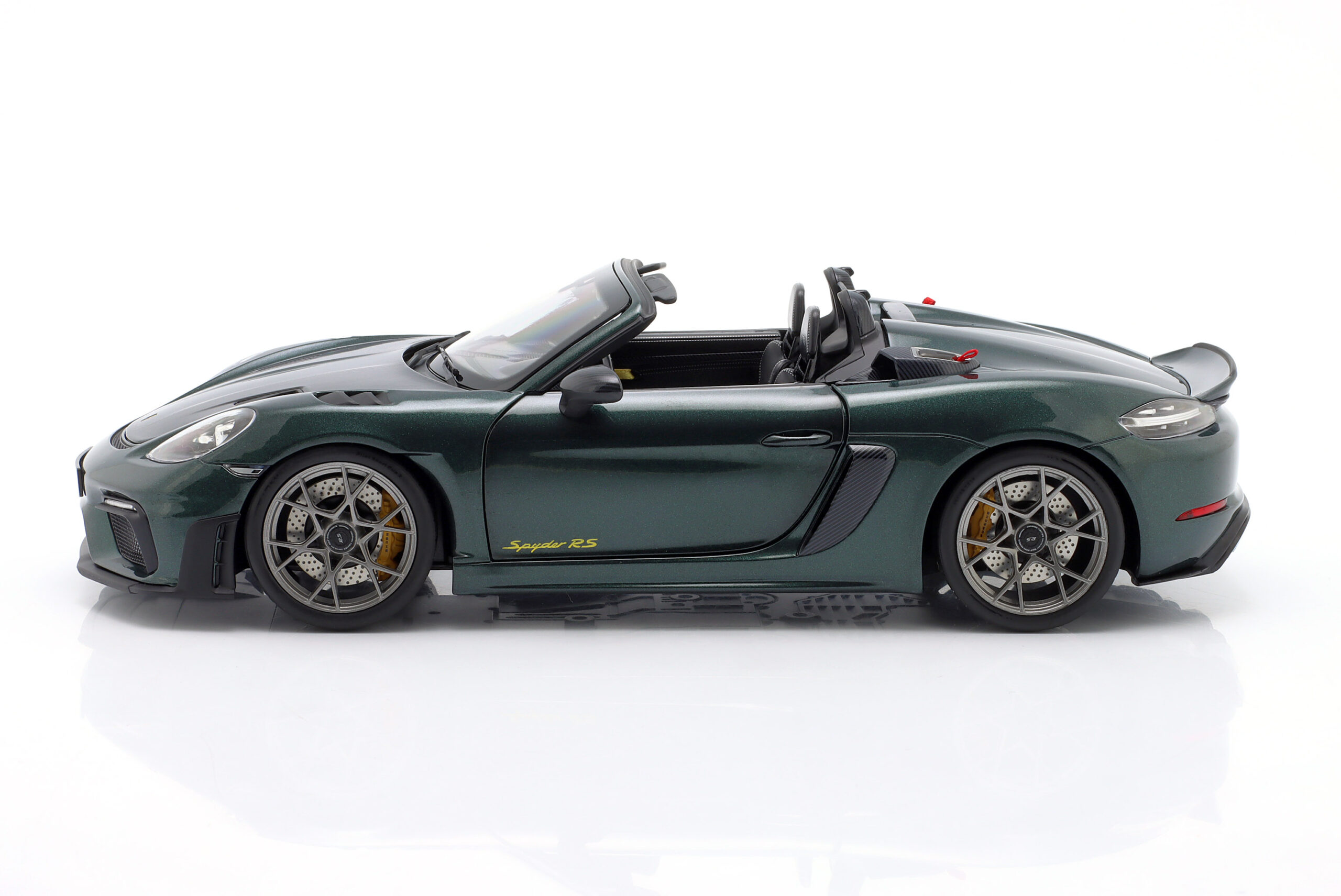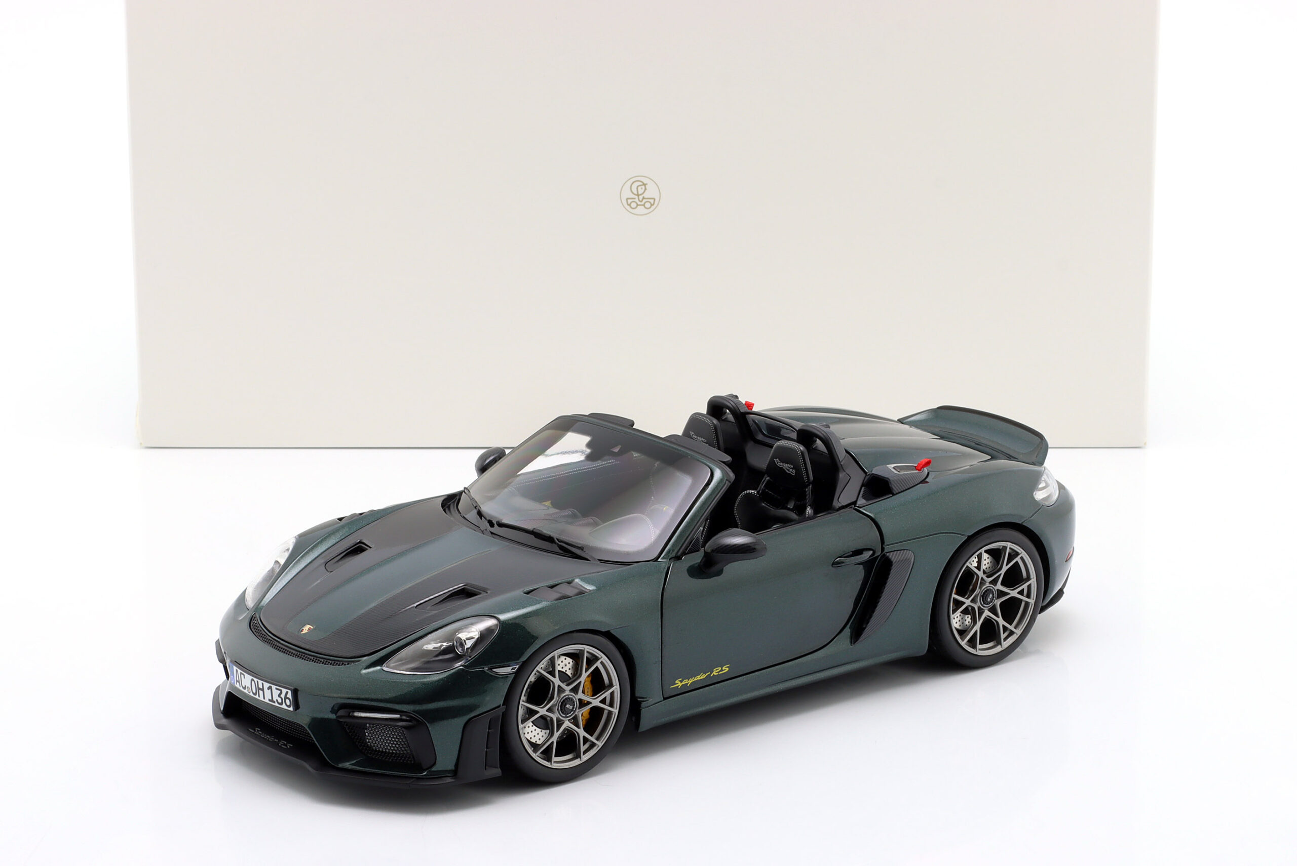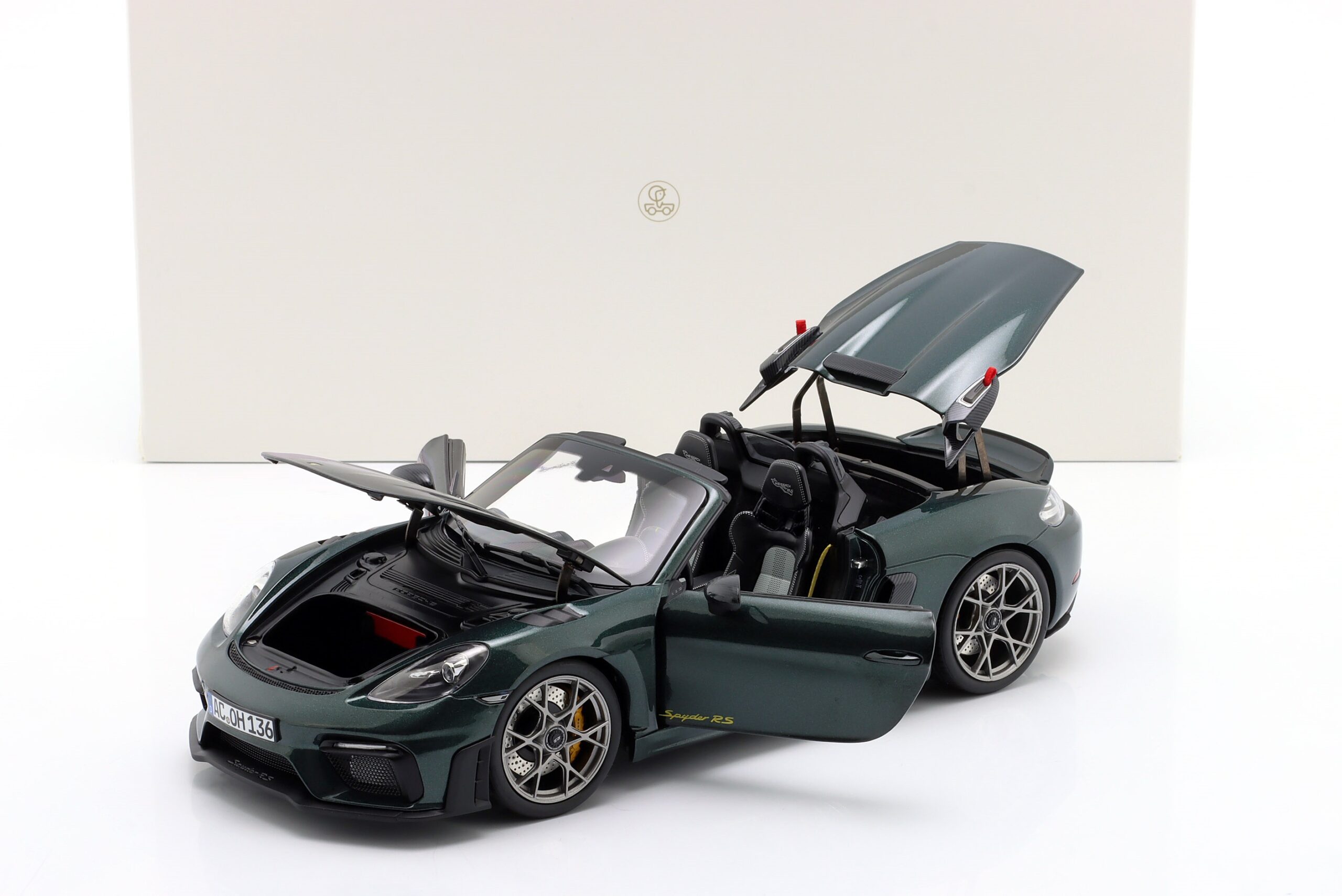 Kolekcjonerski model metalowy z elementami plastikowymi samochodu PORSCHE 718 Spyder RS w/ Weissach Pack z roku 2023 w kolorze Forest Green.Model posiada otwierane drzwi,pokrywę silnika oraz bagażnika.