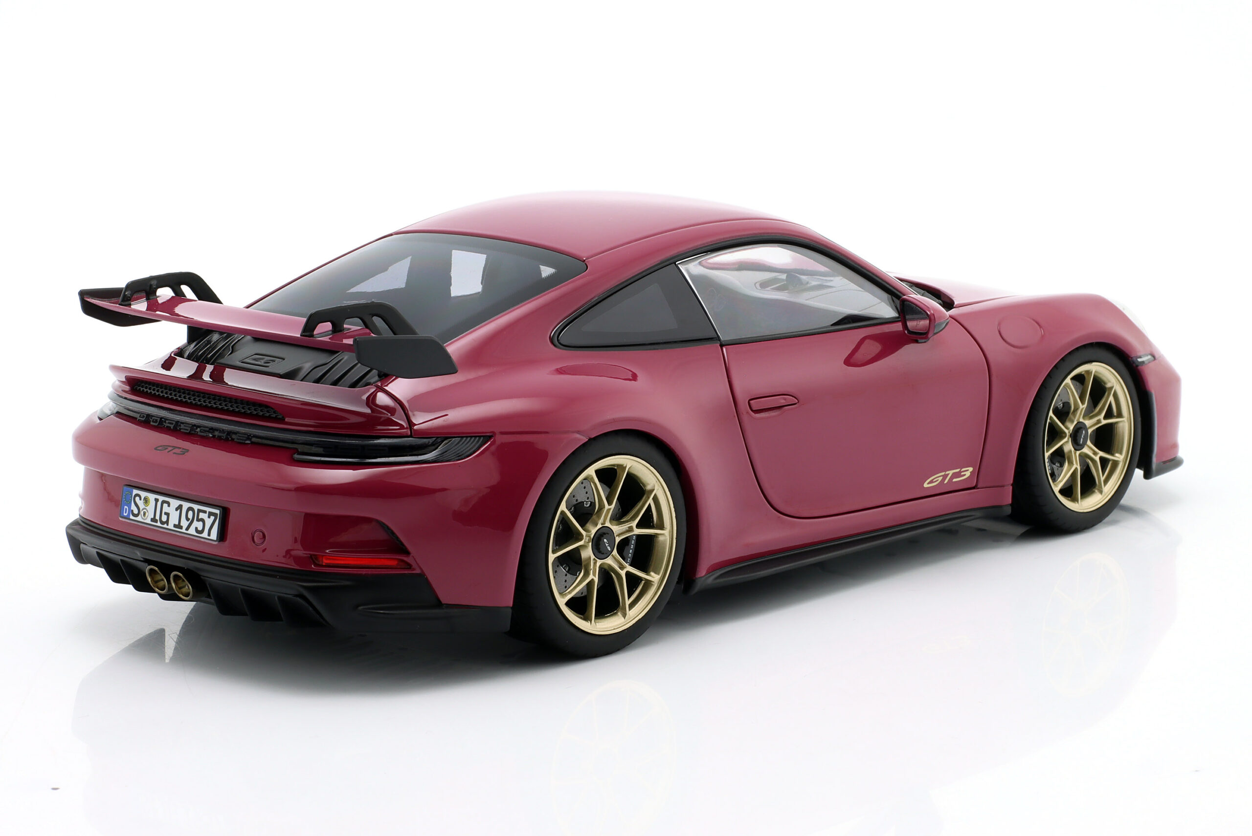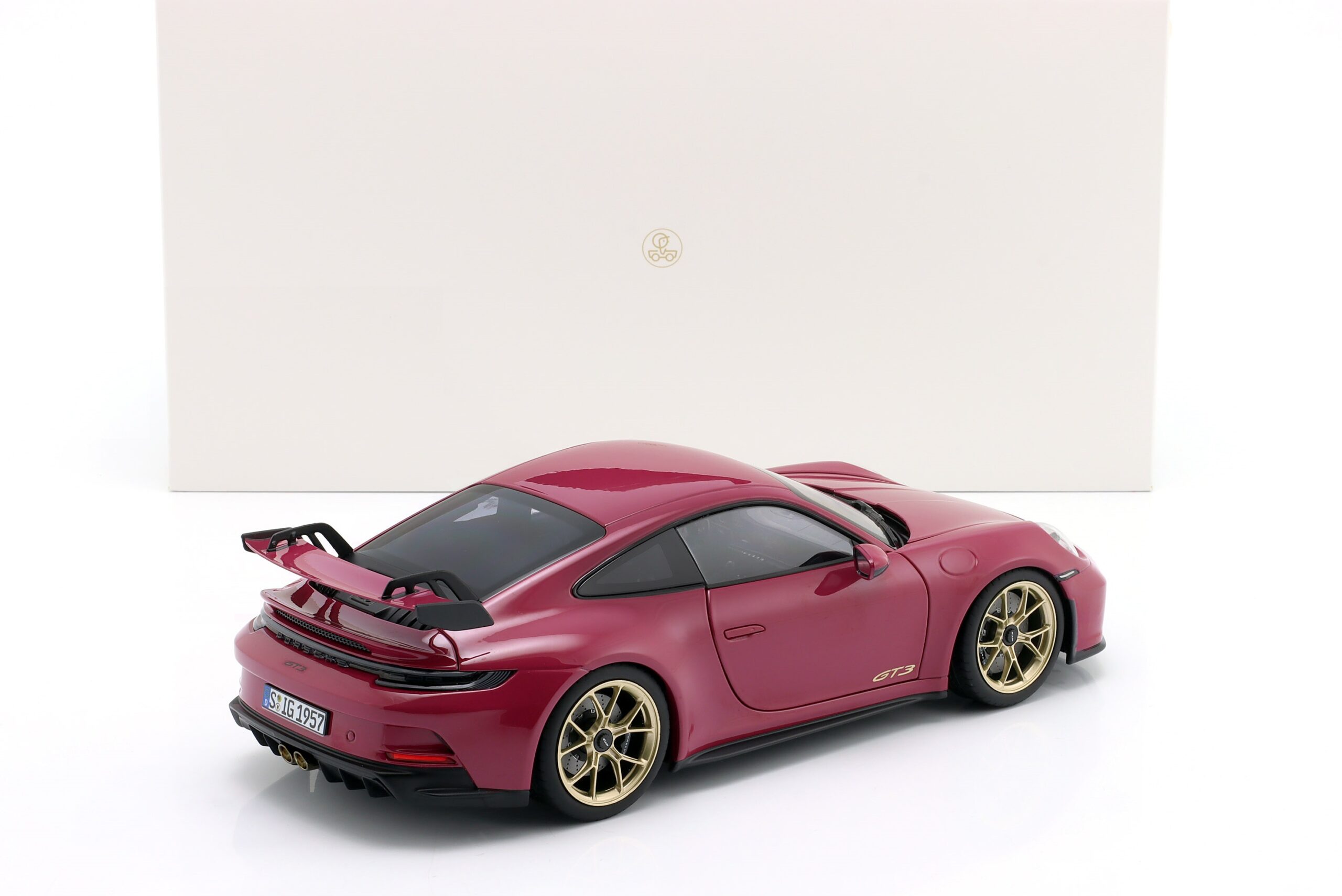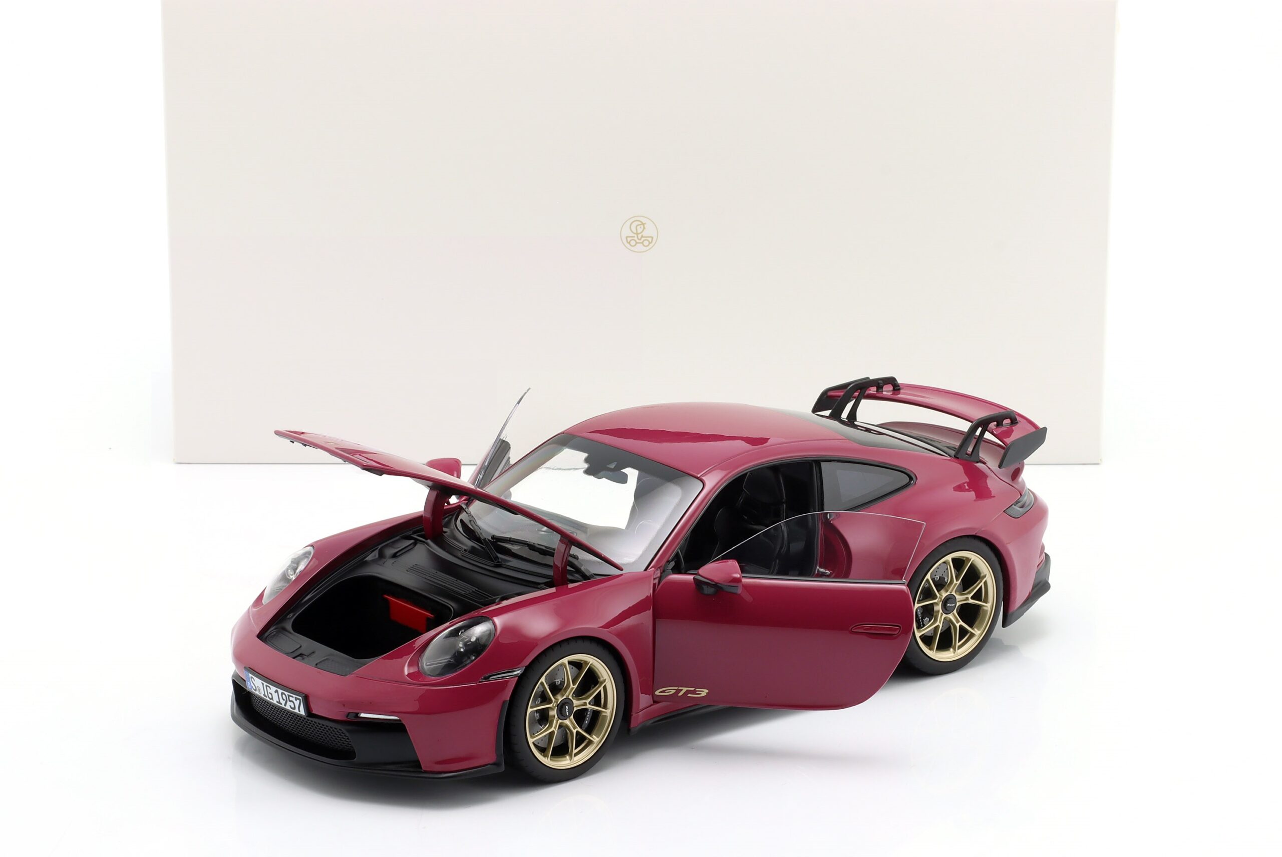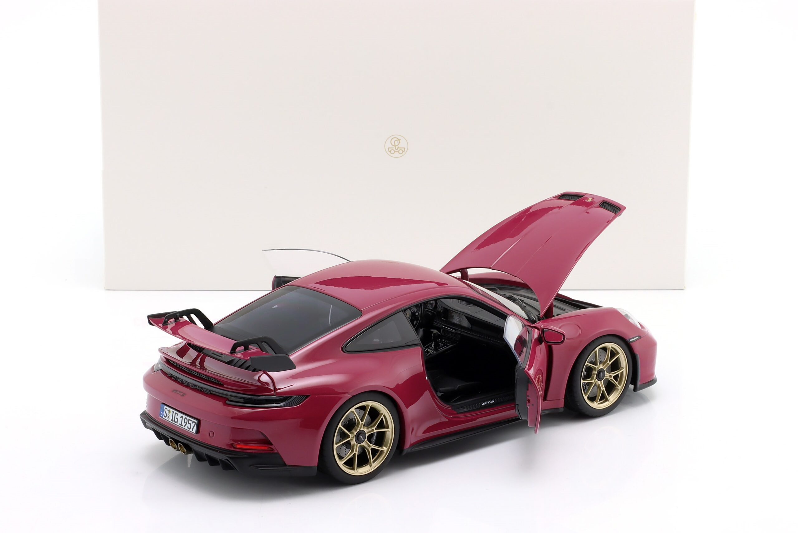 Kolekcjonerski model metalowy z elementami plastikowymi samochodu PORSCHE 911 (992) GT3 z roku 2021 w kolorze Star ruby.