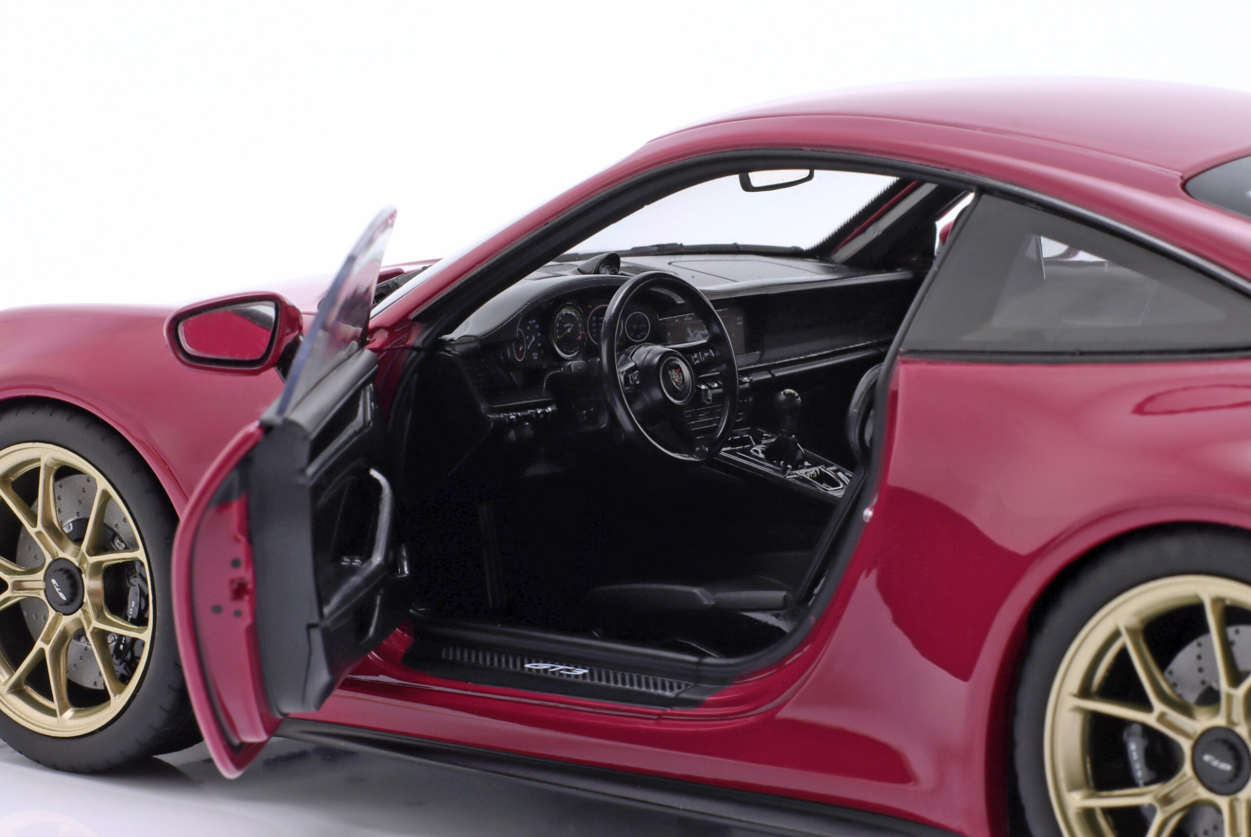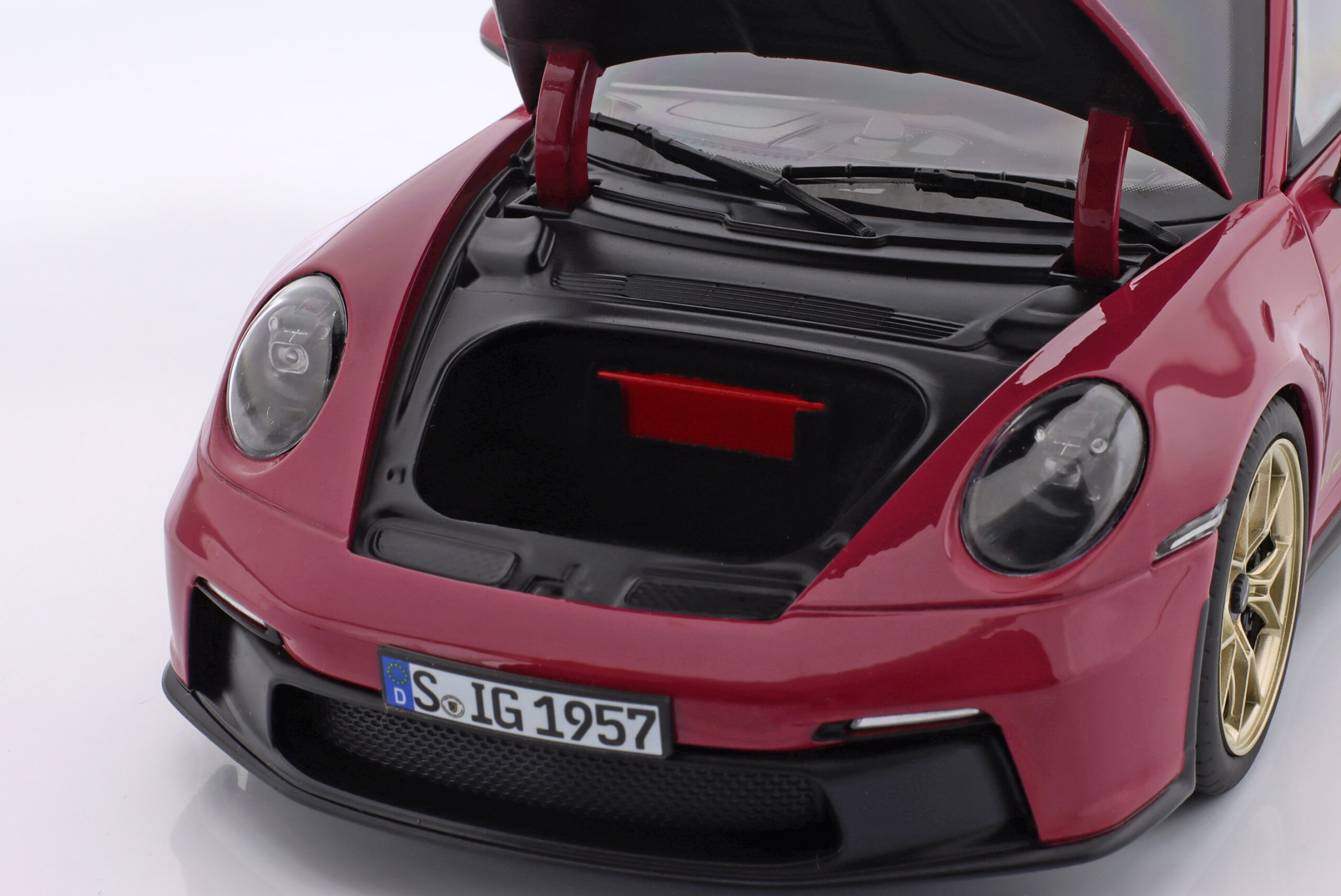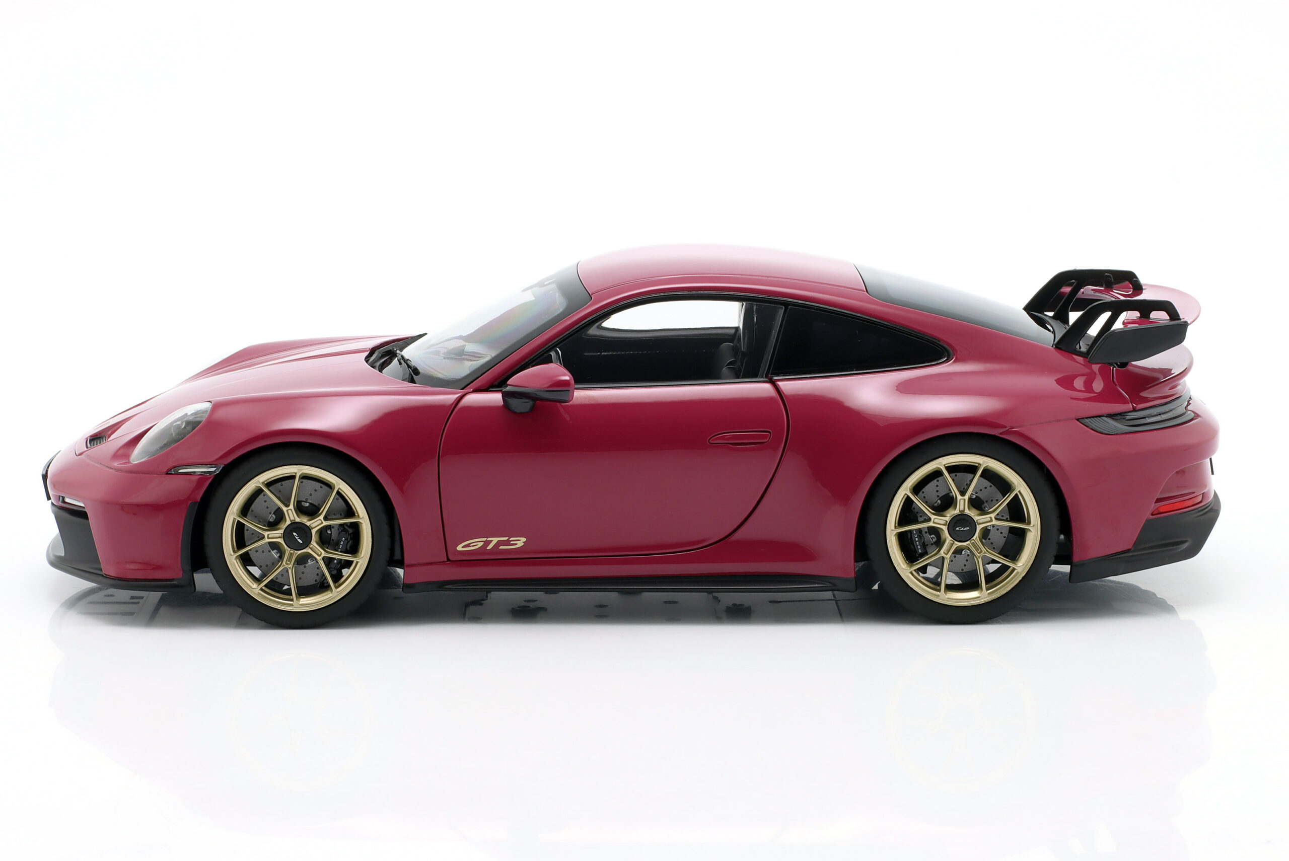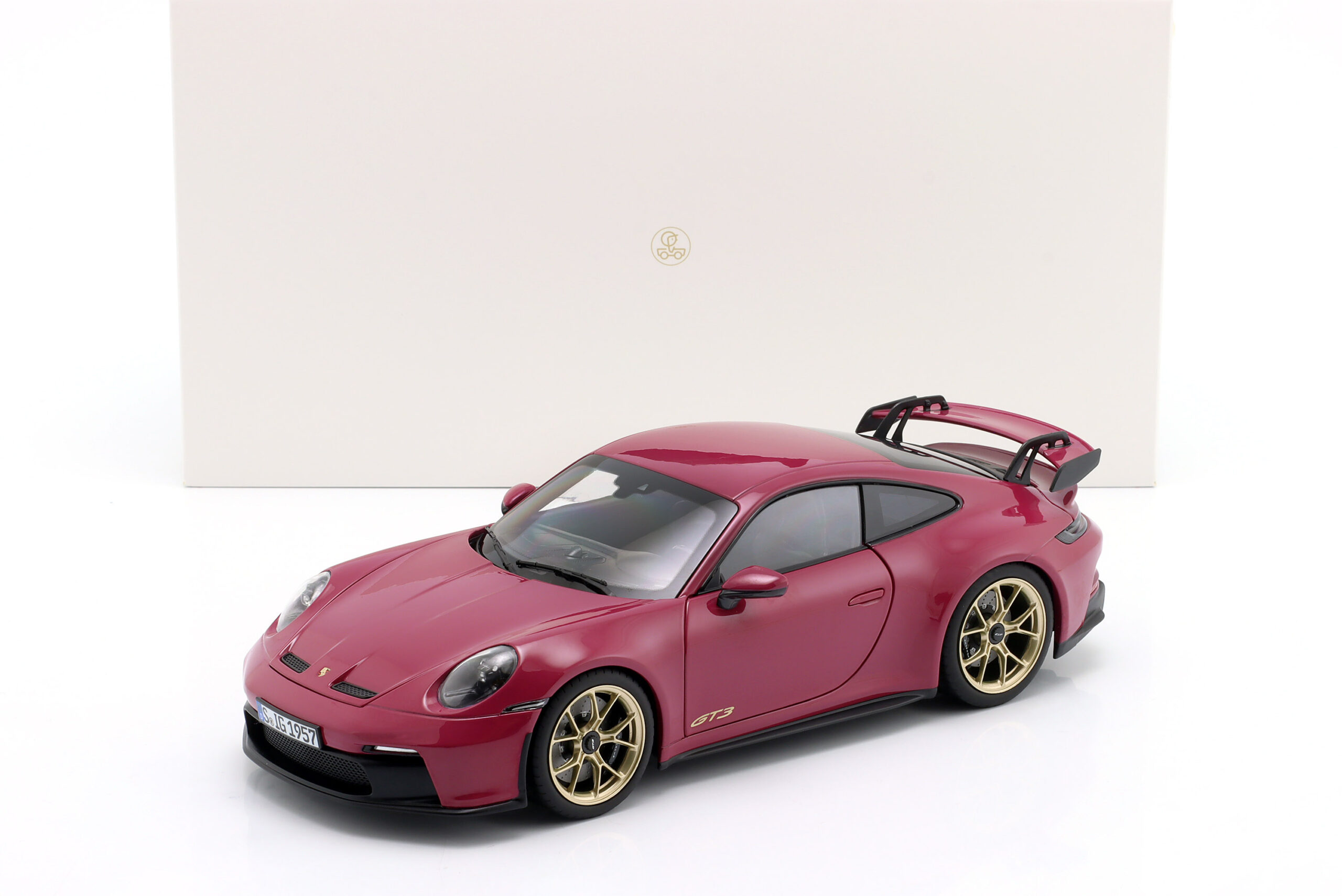 Kolekcjonerski model metalowy z elementami plastikowymi samochodu PORSCHE 911 (992) GT3 z roku 2021 w kolorze Star ruby.