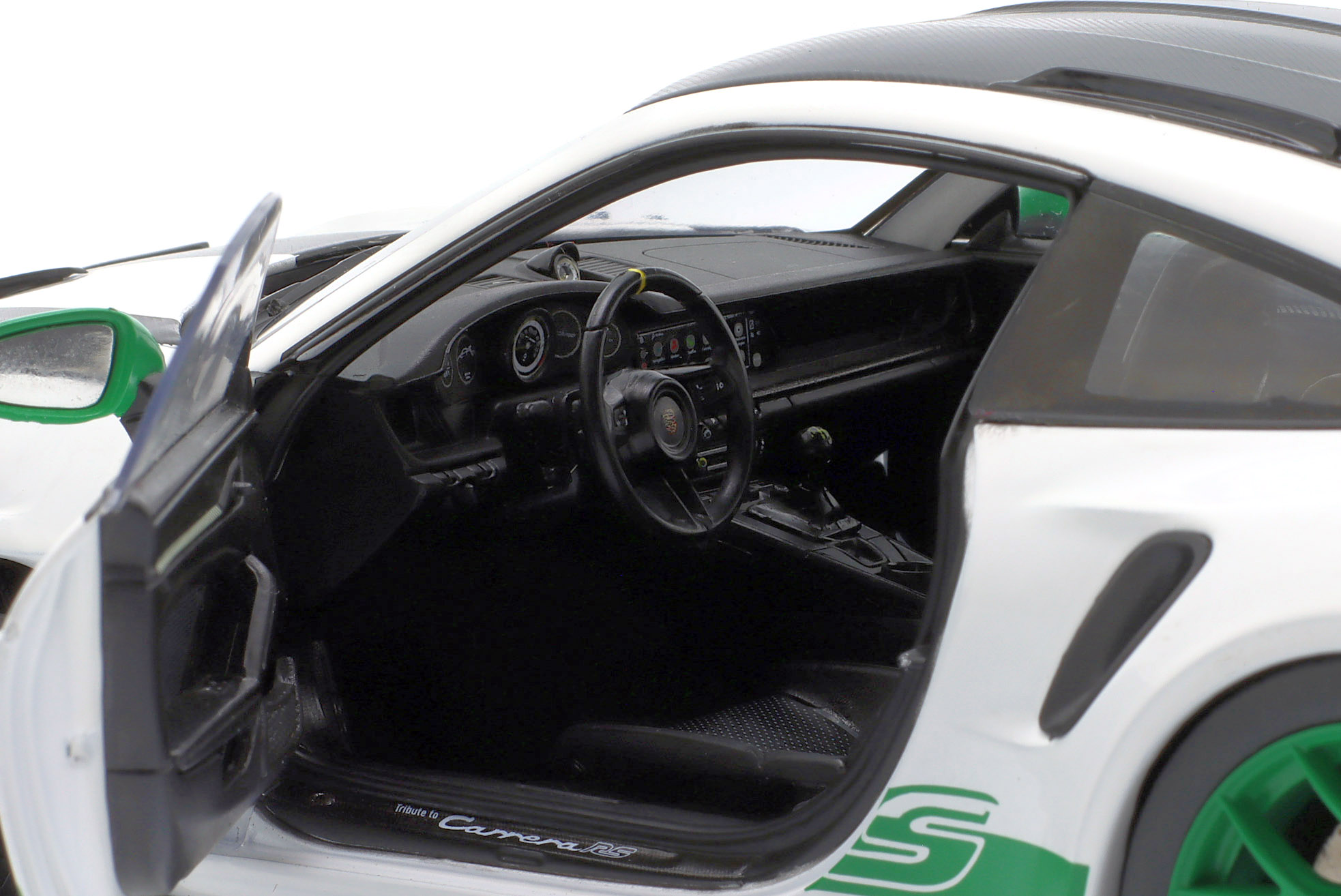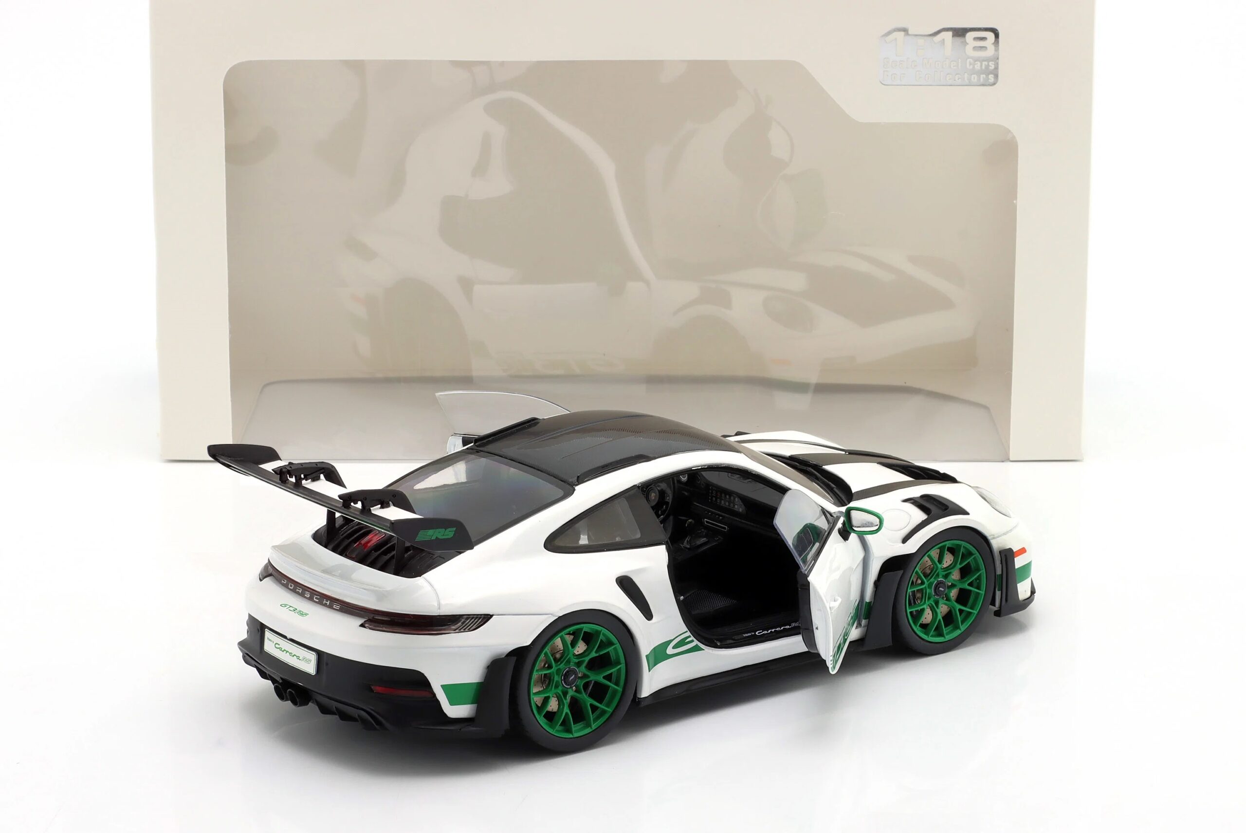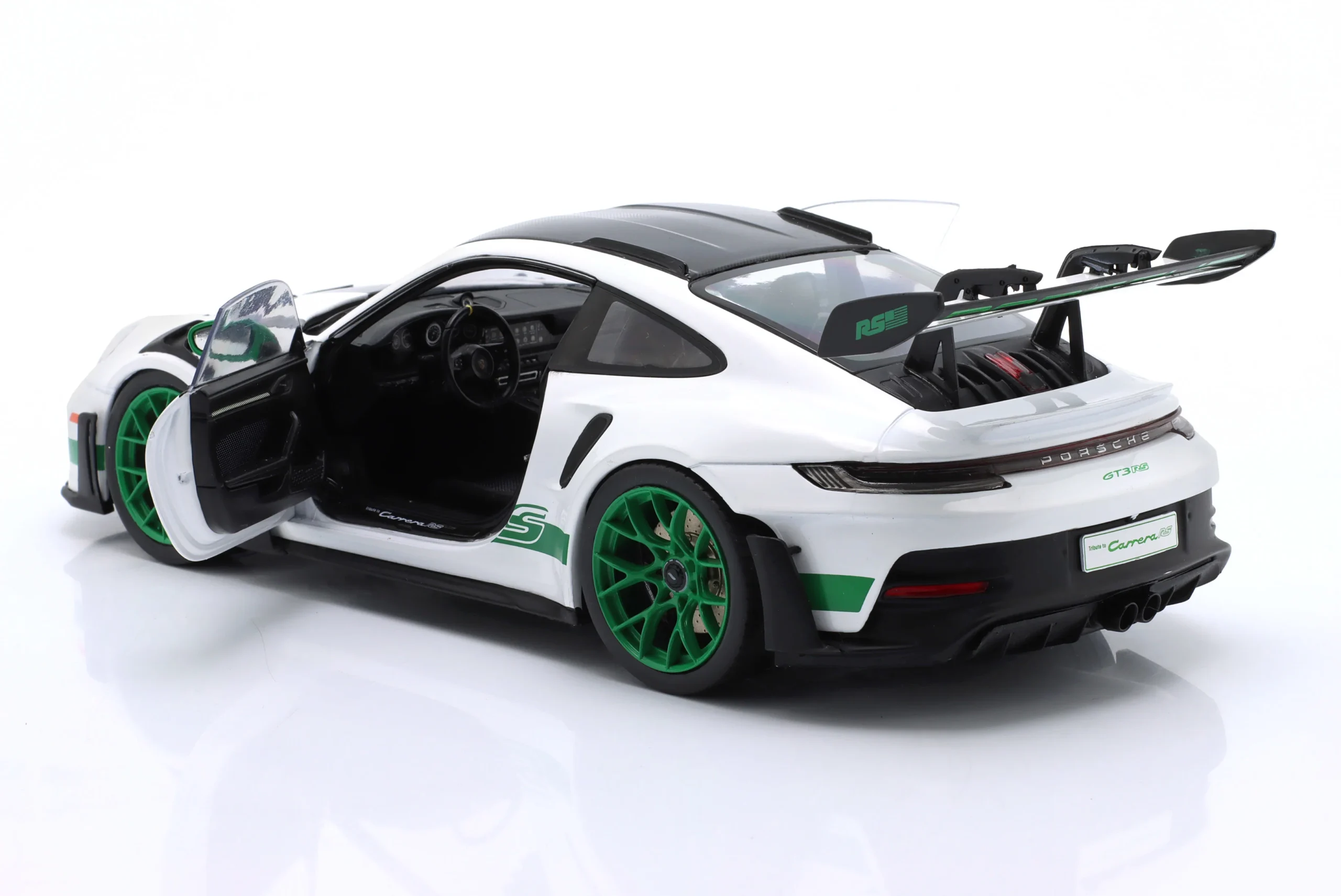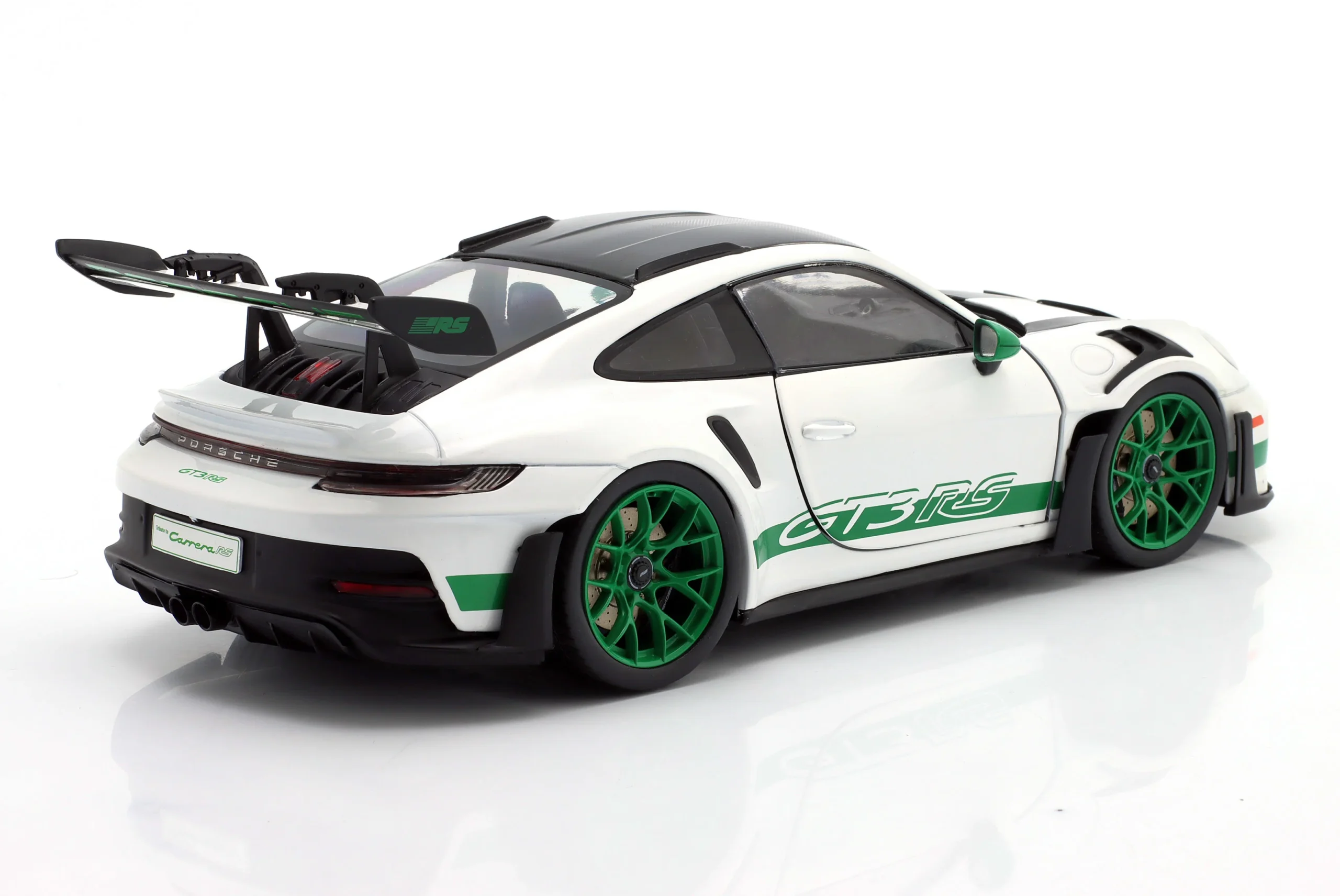 Kolekcjonerski model metalowy z elementami plastikowymi samochodu PORSCHE 911 (992) GT3 RS Tribute Carrera RS z roku 2024 w kolorze Biały/Zielony.Model posiada otwierane drzwi.