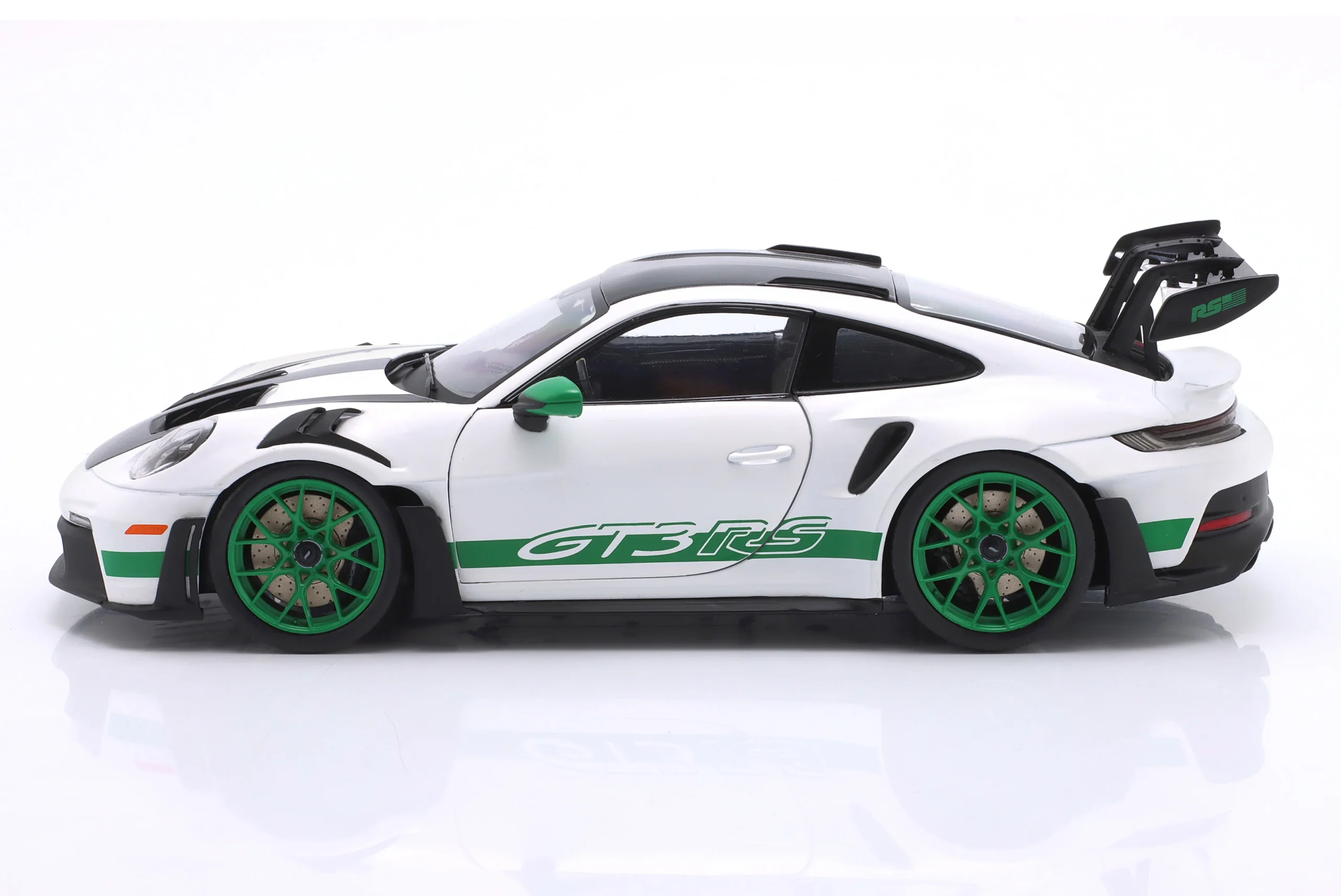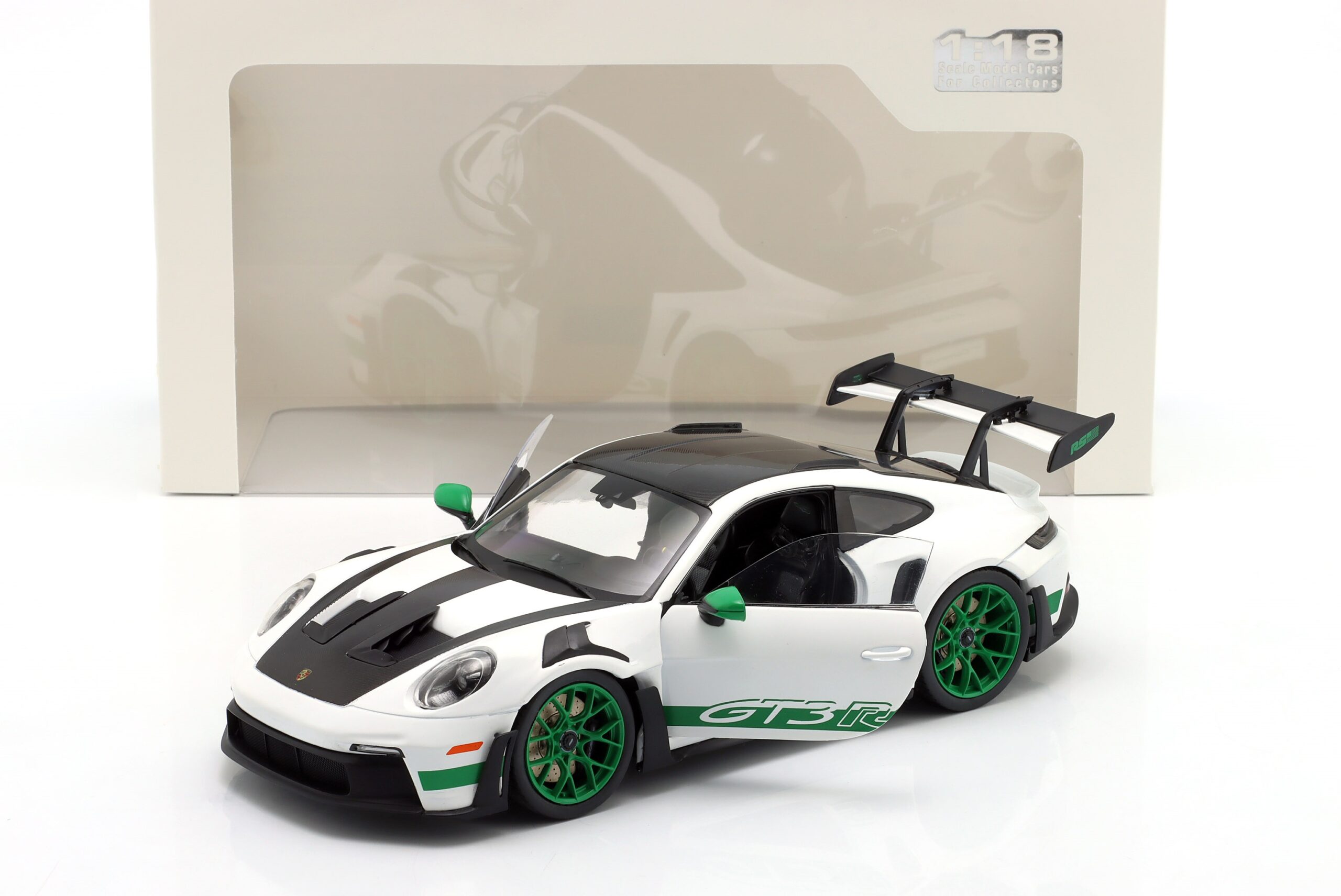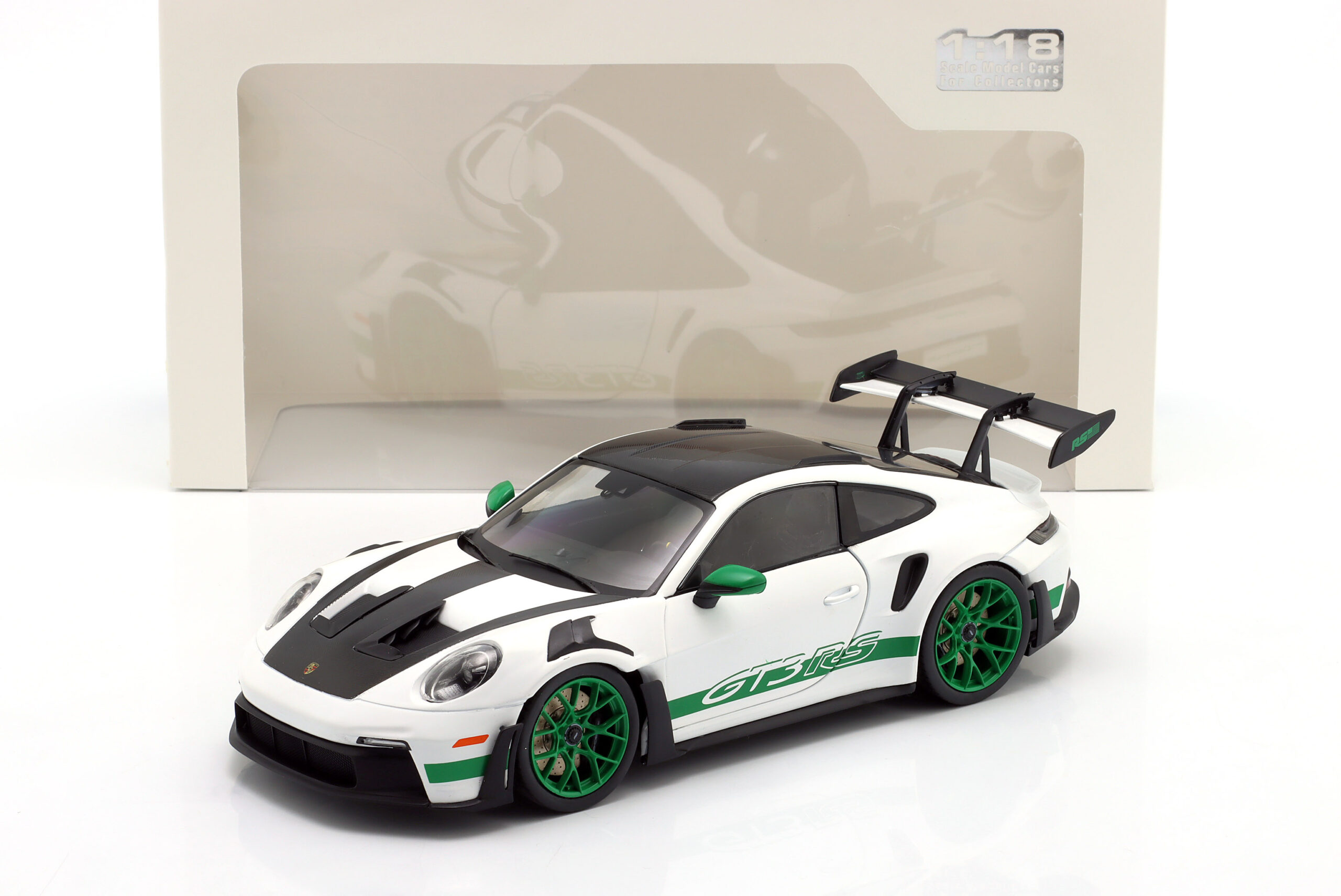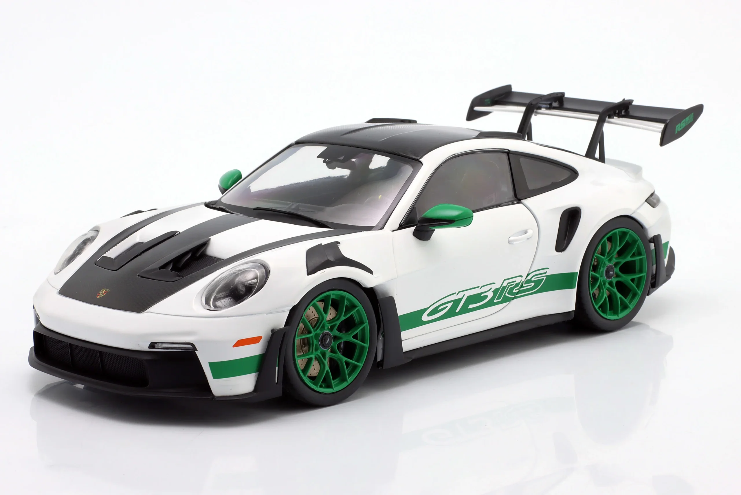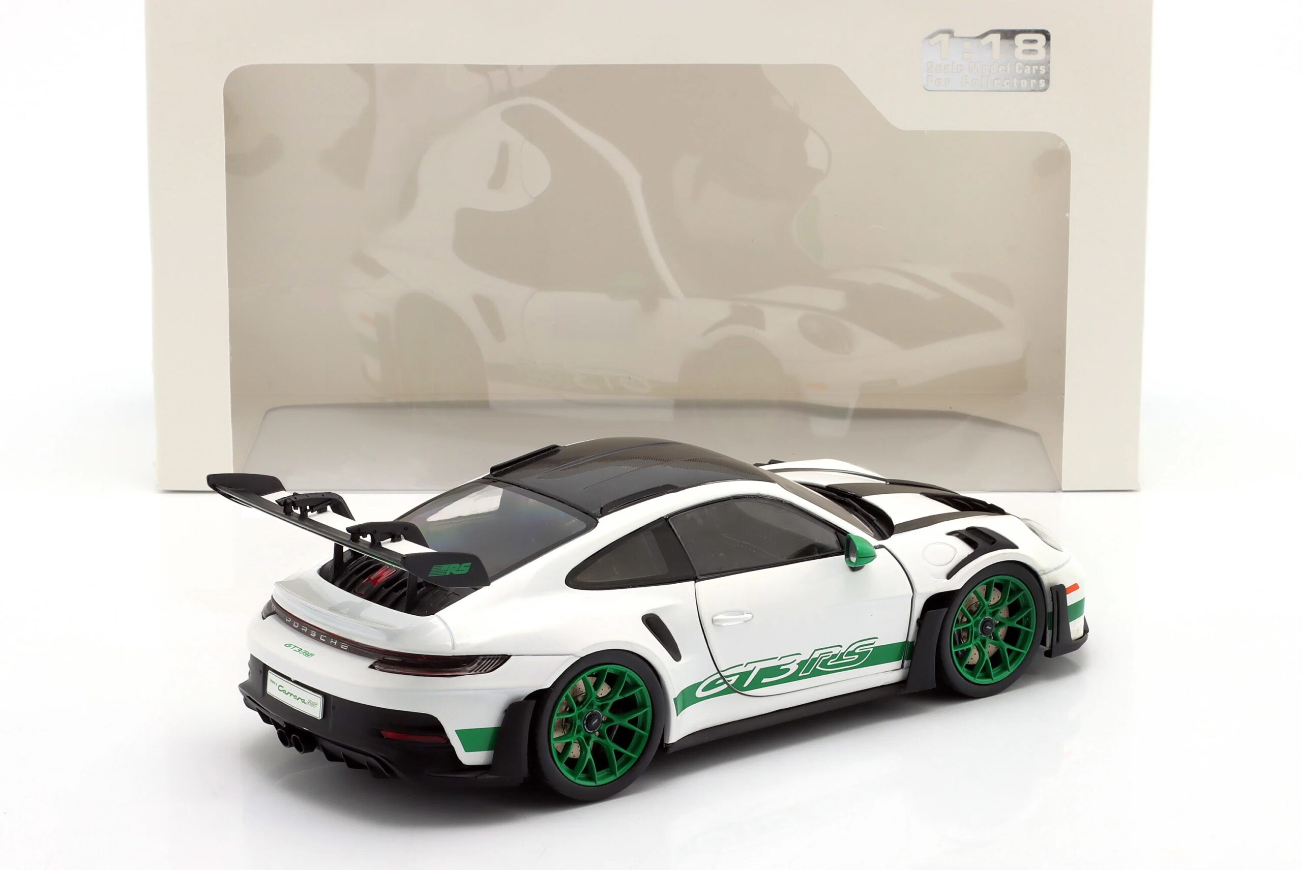 Kolekcjonerski model metalowy z elementami plastikowymi samochodu PORSCHE 911 (992) GT3 RS Tribute Carrera RS z roku 2024 w kolorze Biały/Zielony.Model posiada otwierane drzwi.