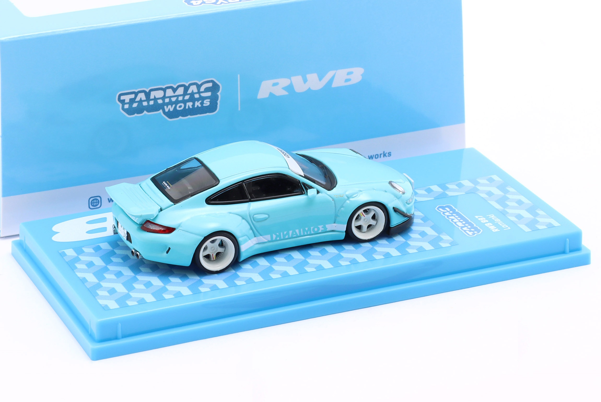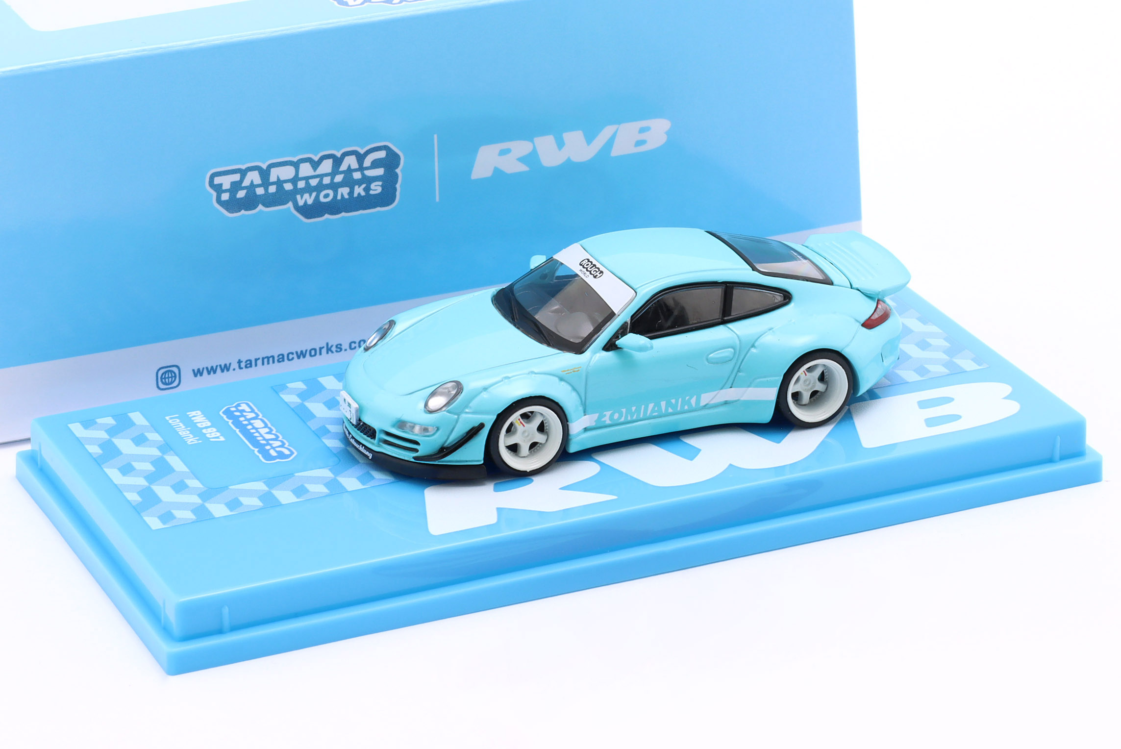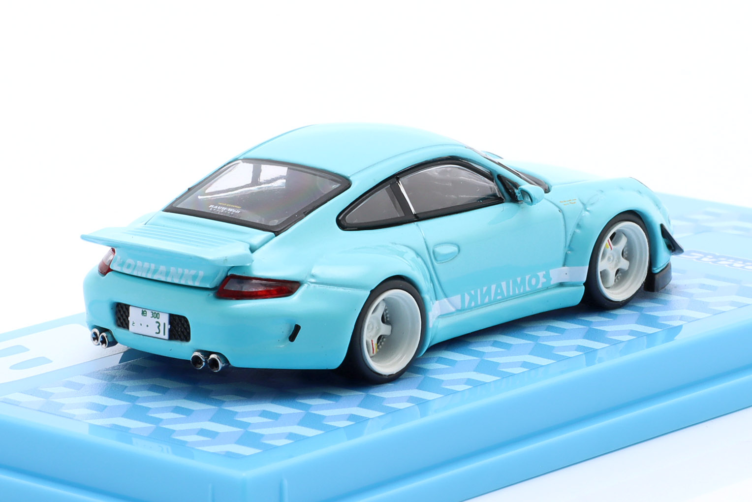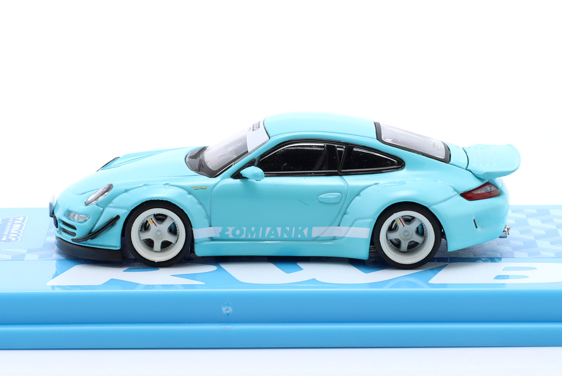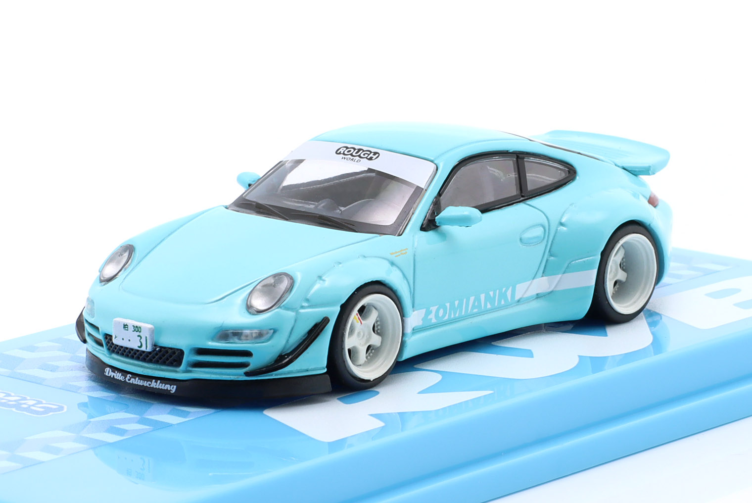 Kolekcjonerski model metalowy z elementami plastikowymi samochodu PORSCHE 911 (997) RWB „Łomianki” w kolorze jasnoniebieskim.Model na podstawce,posiada akrylową gablotke ekspozycyjną.
