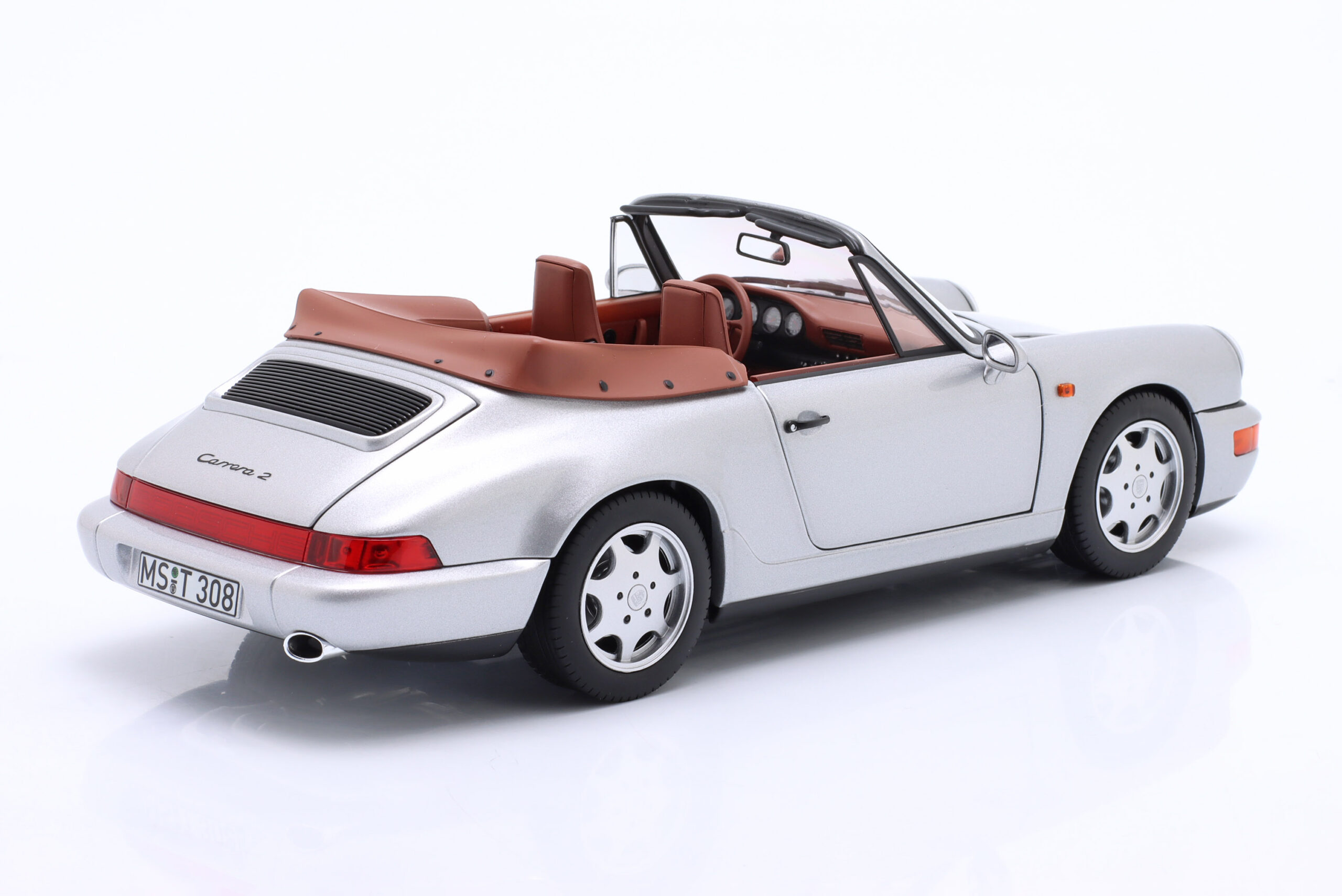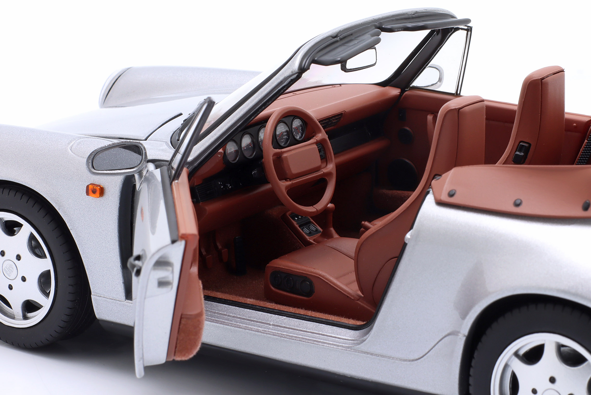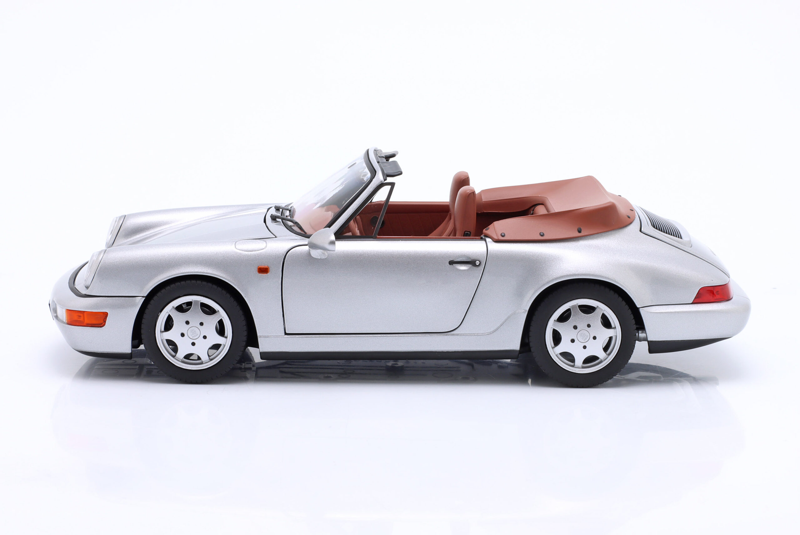 Kolekcjonerski model metalowy z elementami plastikowymi samochodu PORSCHE 911 Carrera 2 Cabriolet z roku 1990 w kolorze Srebrnym.