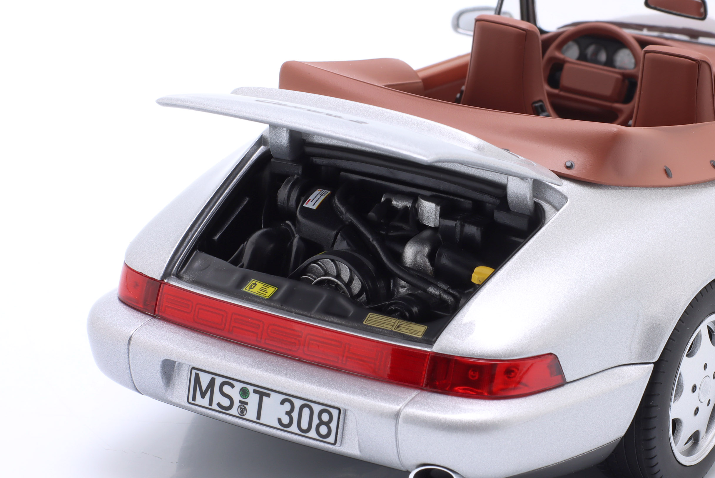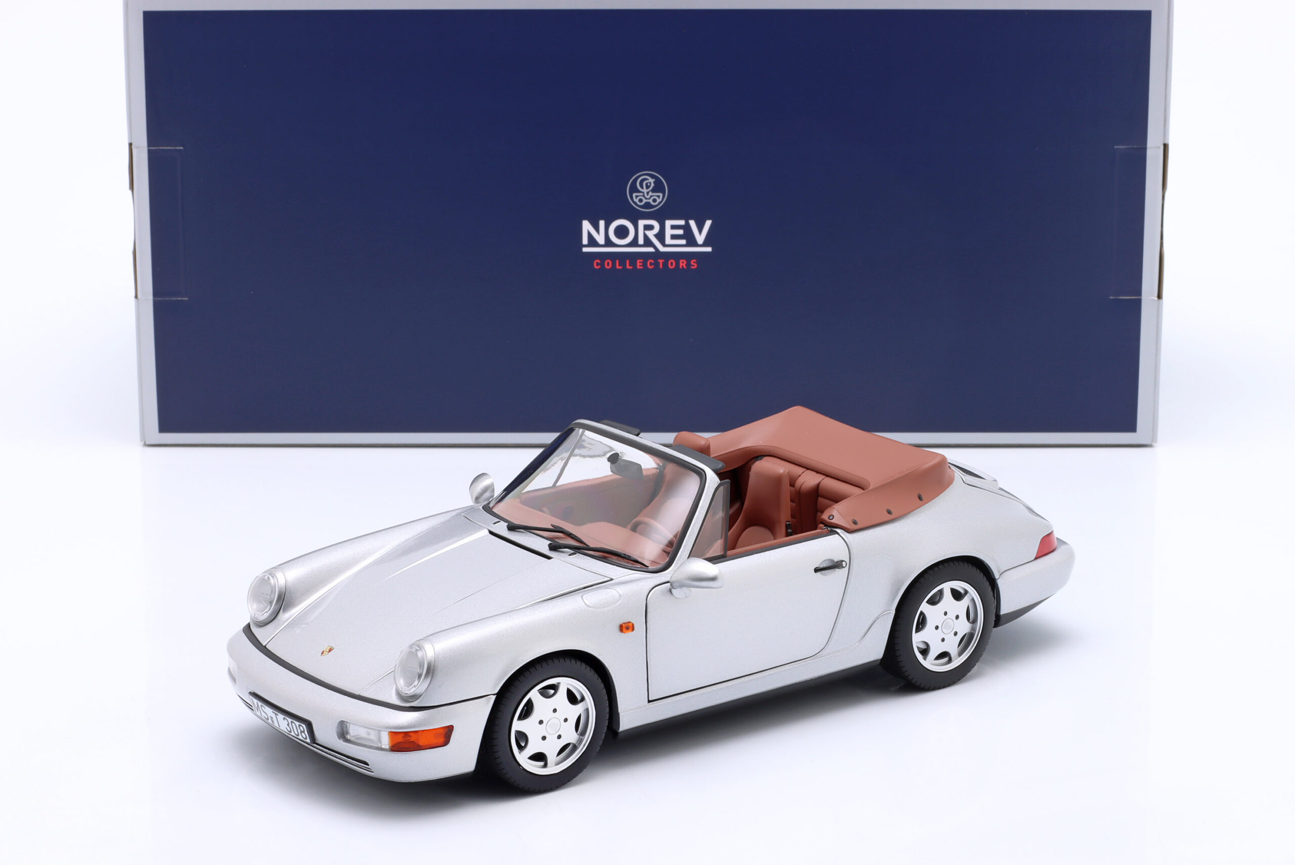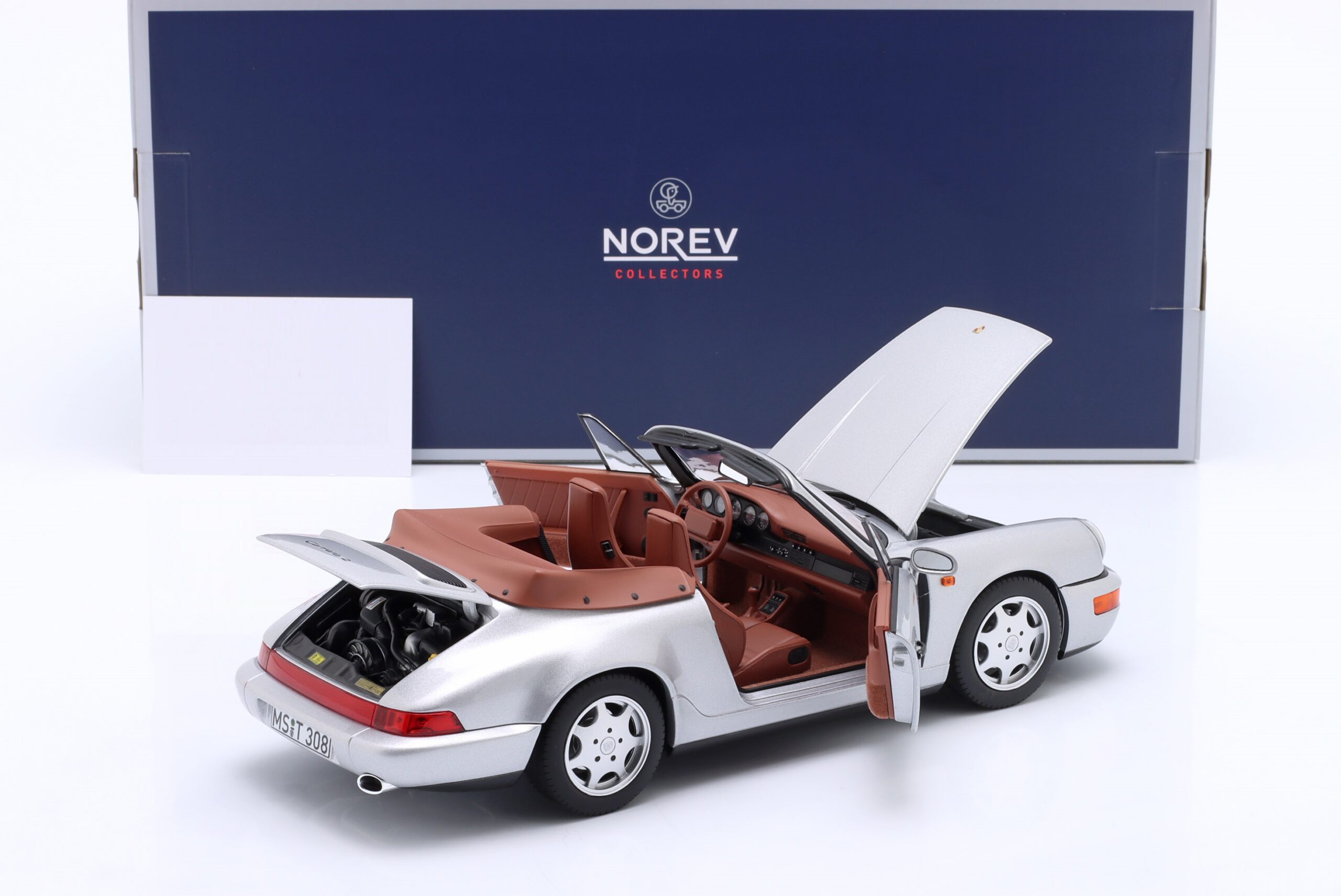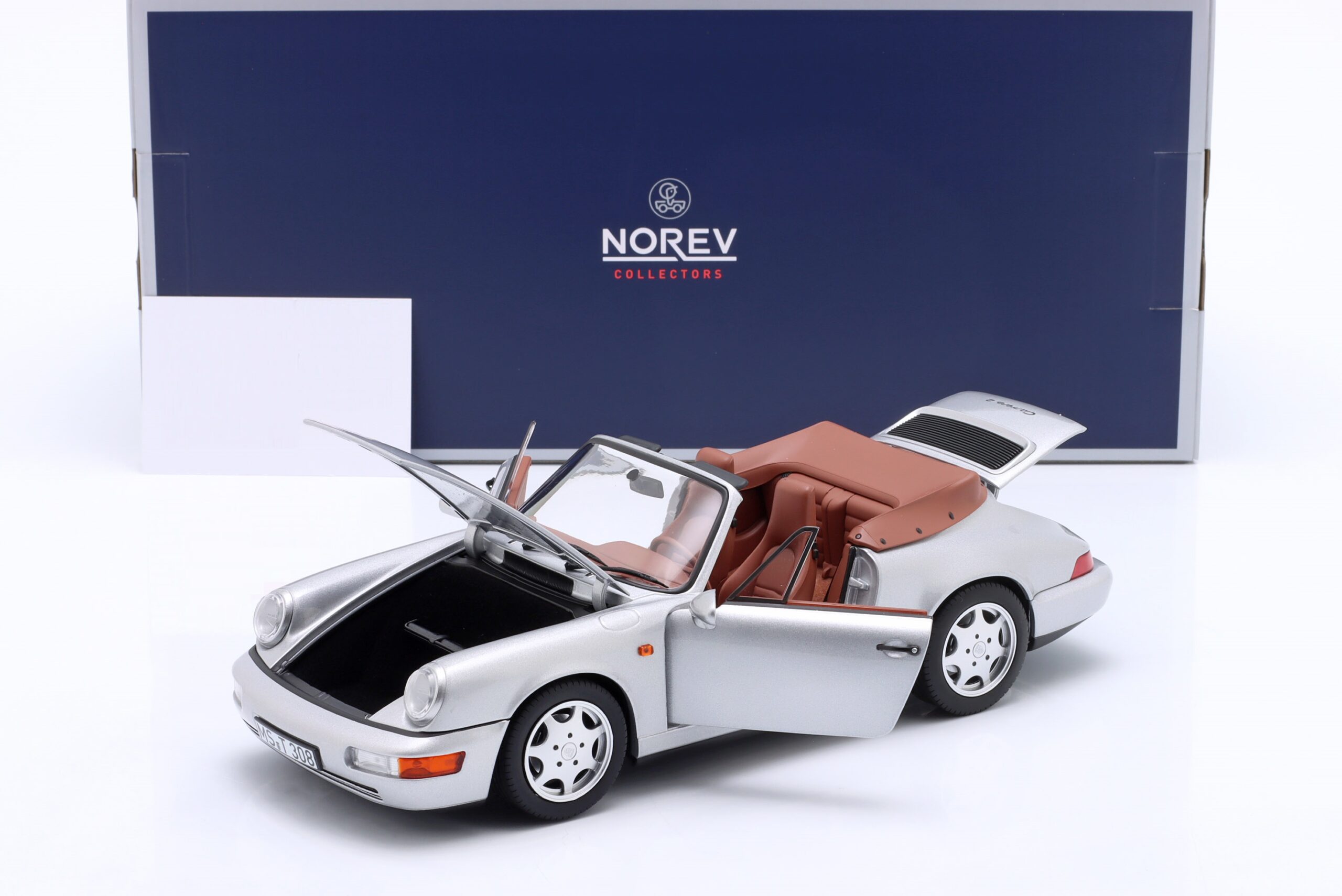 Kolekcjonerski model metalowy z elementami plastikowymi samochodu PORSCHE 911 Carrera 2 Cabriolet z roku 1990 w kolorze Srebrnym.