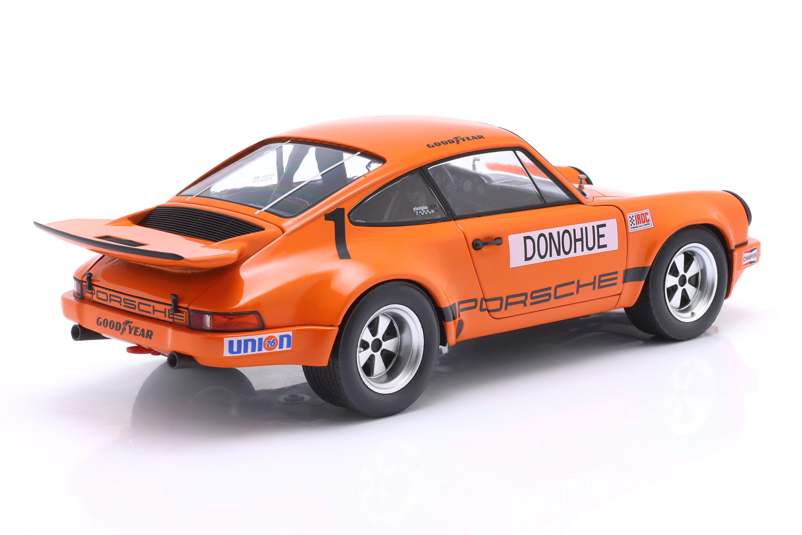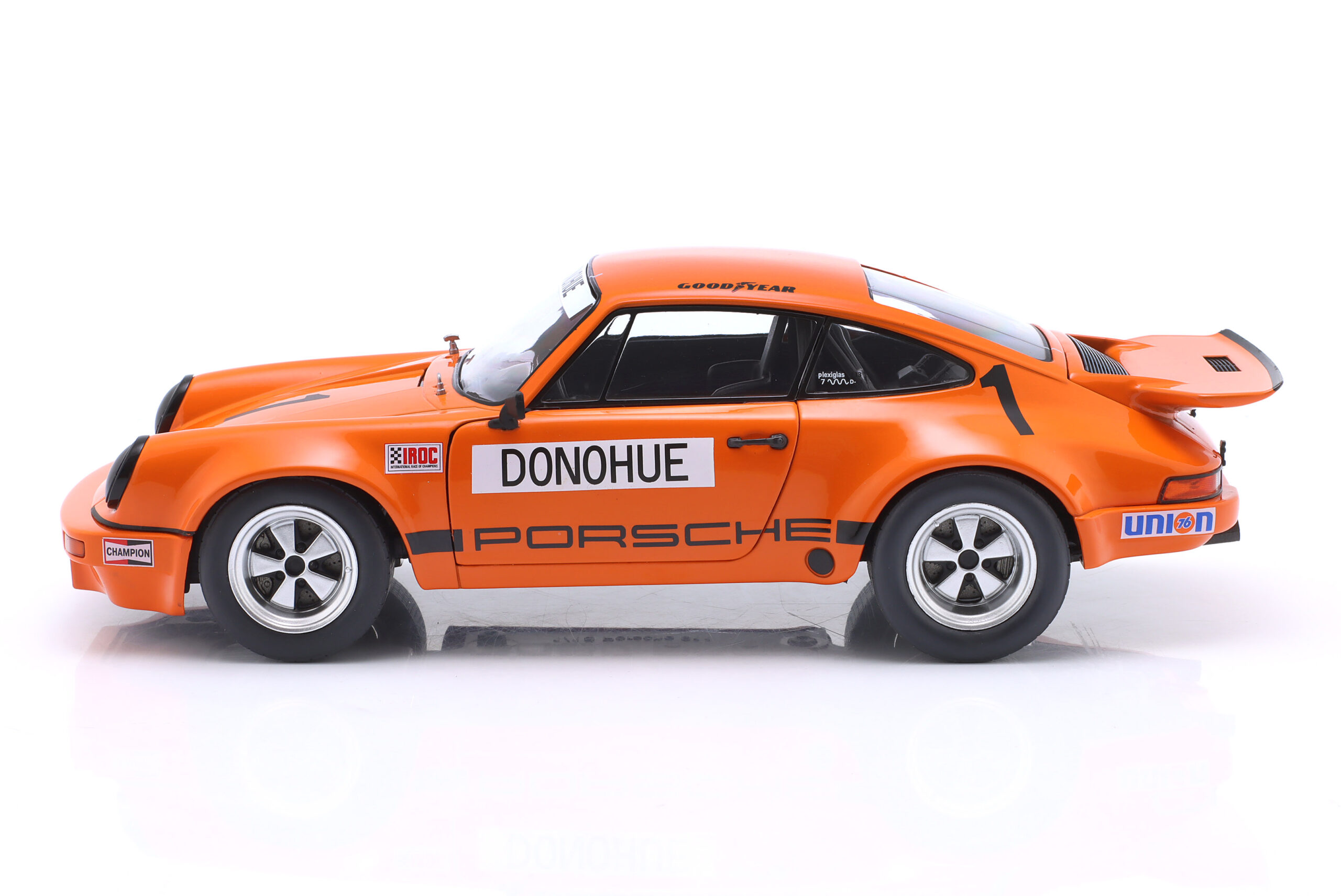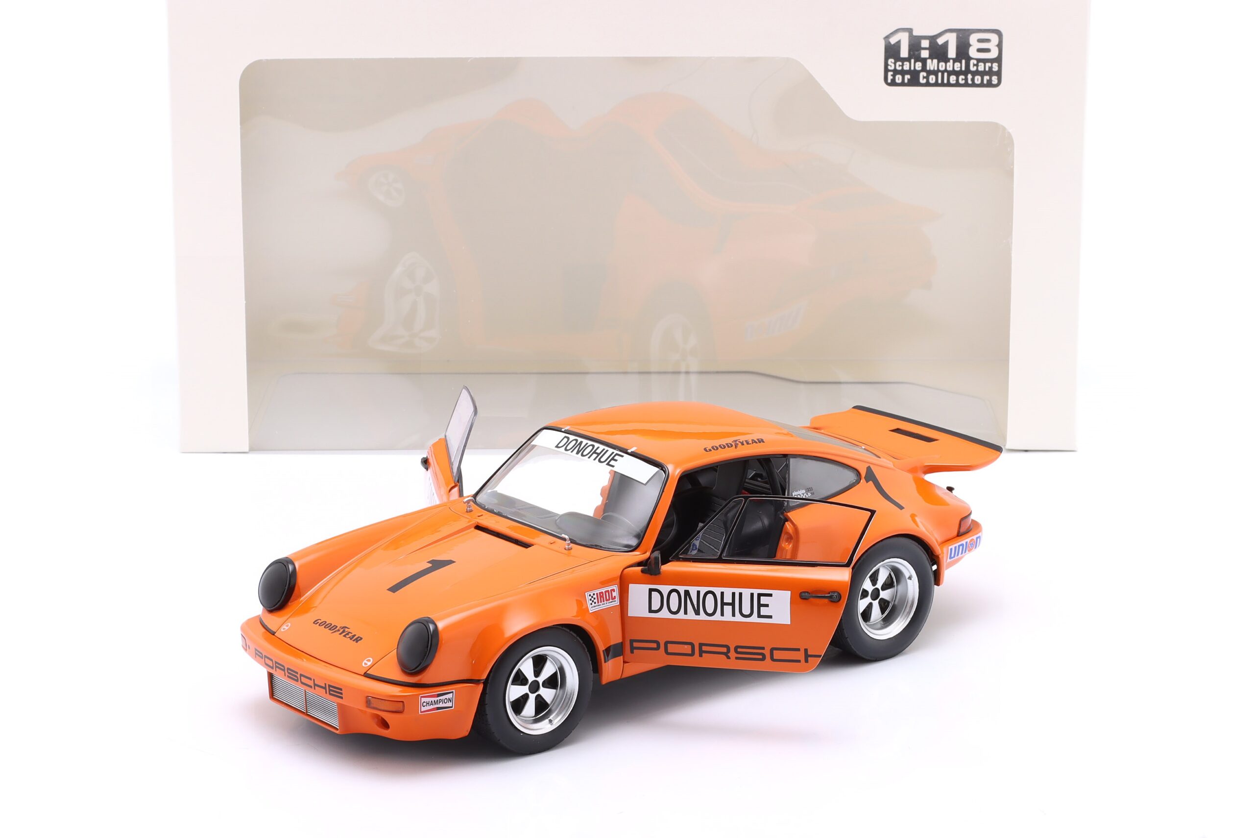 Kolekcjonerski model metalowy z elementami plastikowymi samochodu wyścigowego PORSCHE 911 Carrera 3.0 RSR #1 w którym Mark Donohue zwyciężył w wyścigu serii IROC na Torze Daytona w roku 1974.Model posiada otwierane drzwi.