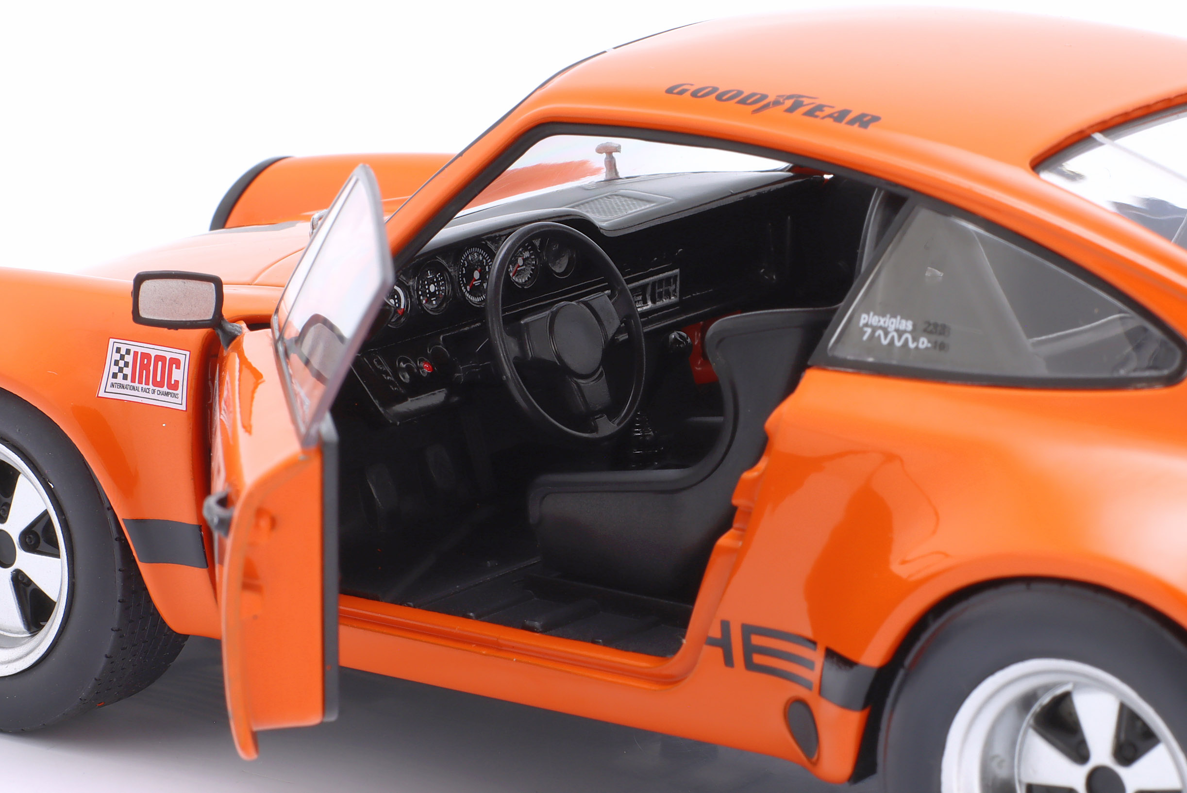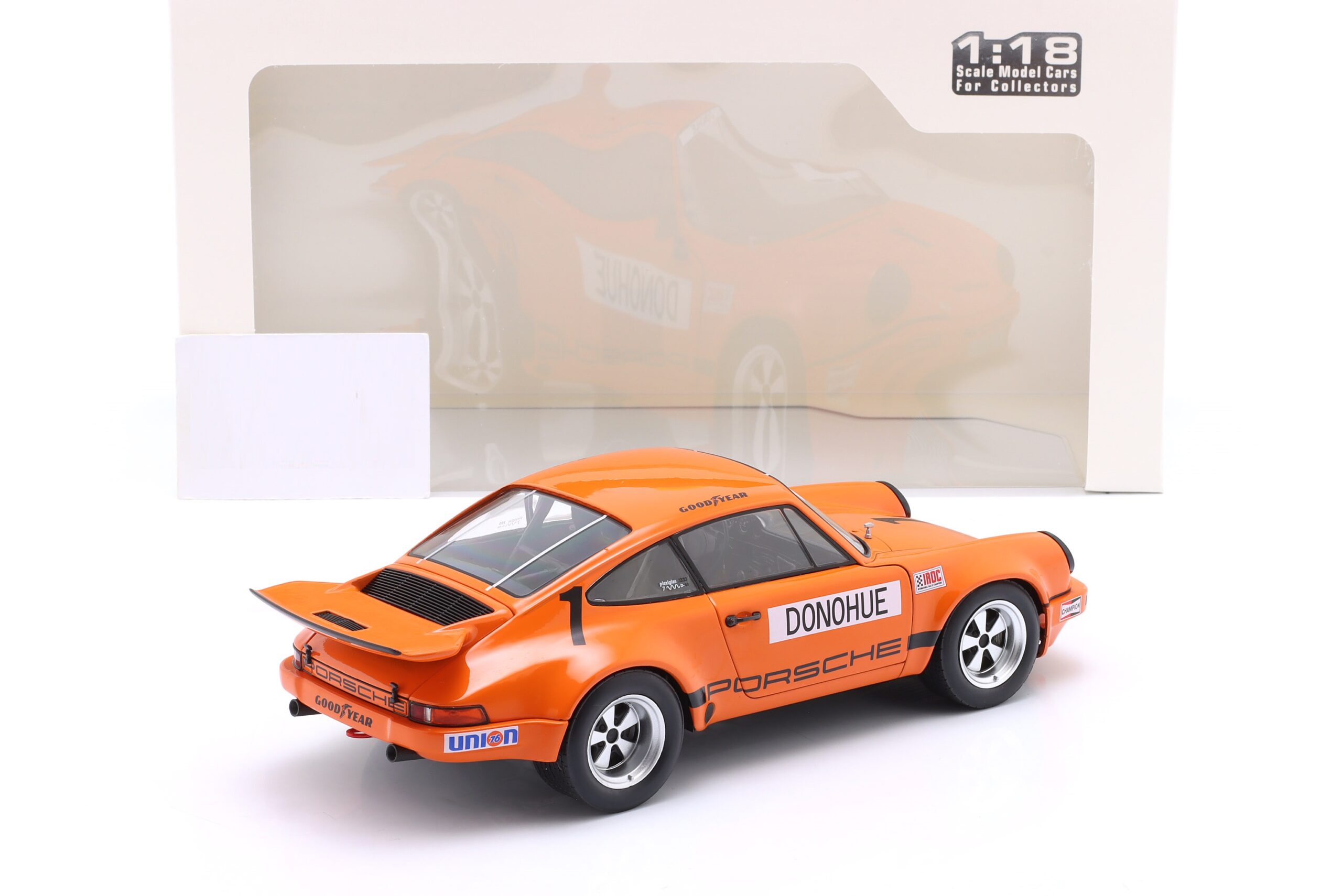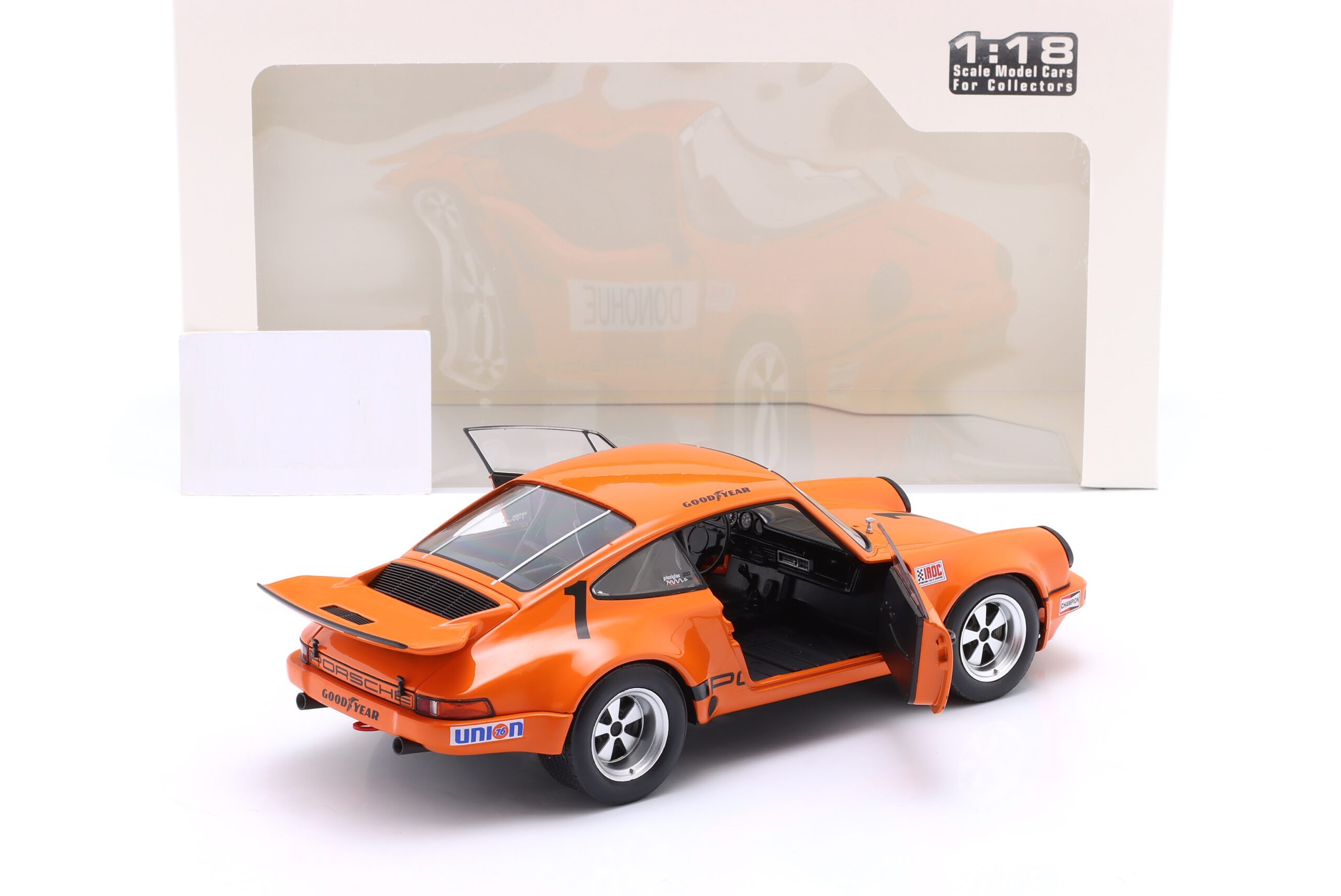 Kolekcjonerski model metalowy z elementami plastikowymi samochodu wyścigowego PORSCHE 911 Carrera 3.0 RSR #1 w którym Mark Donohue zwyciężył w wyścigu serii IROC na Torze Daytona w roku 1974.Model posiada otwierane drzwi.