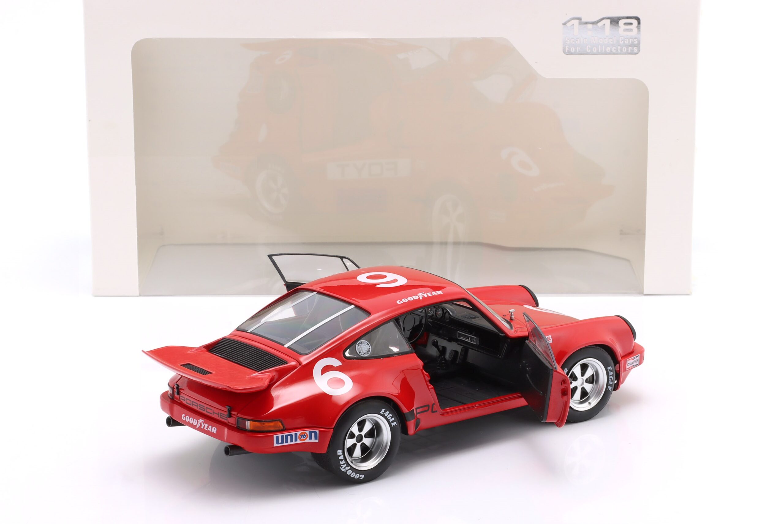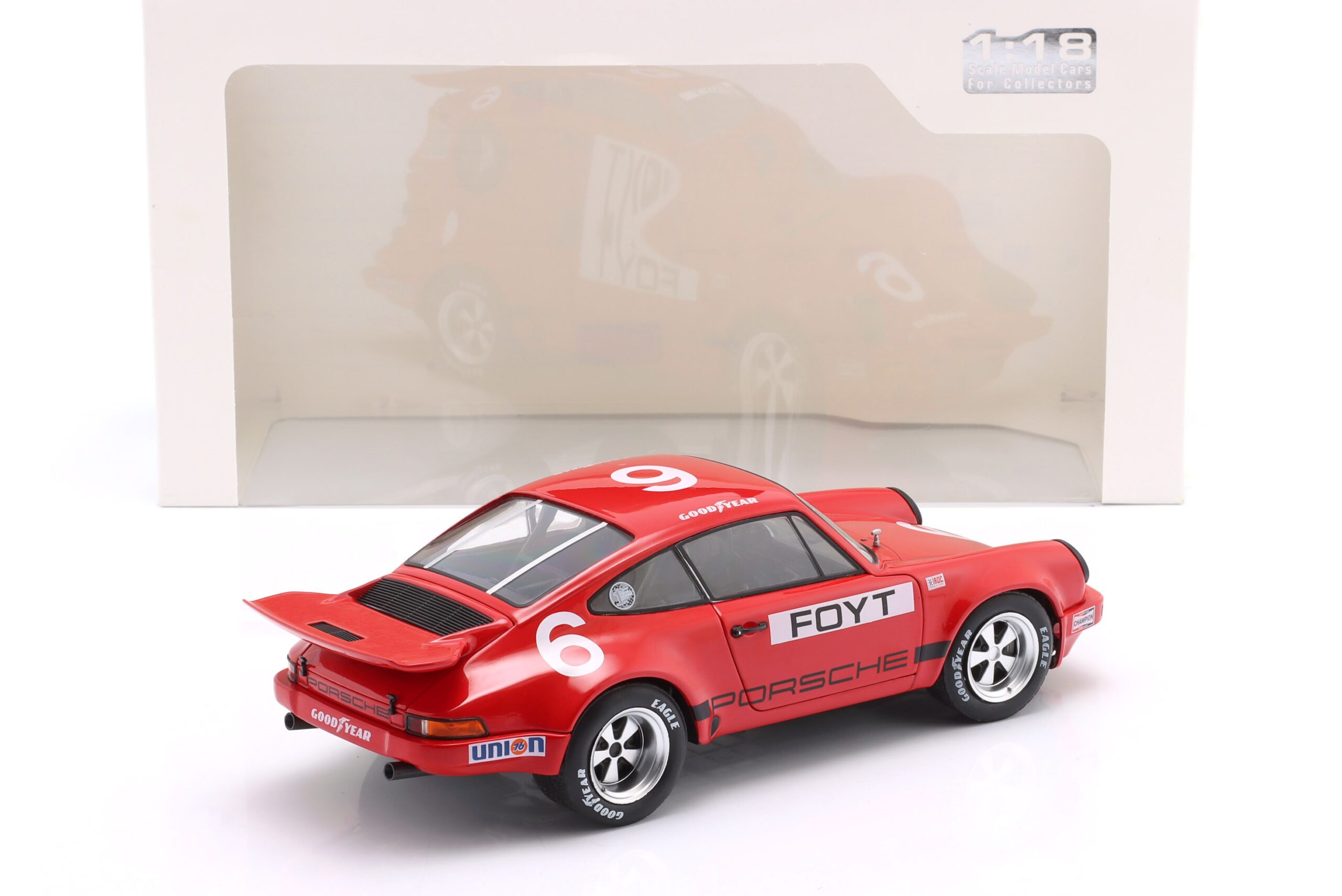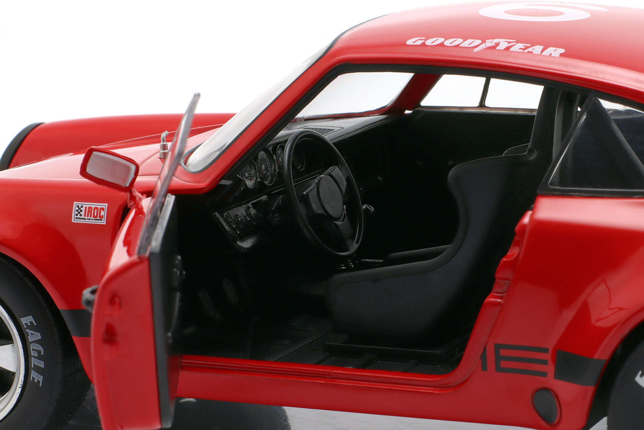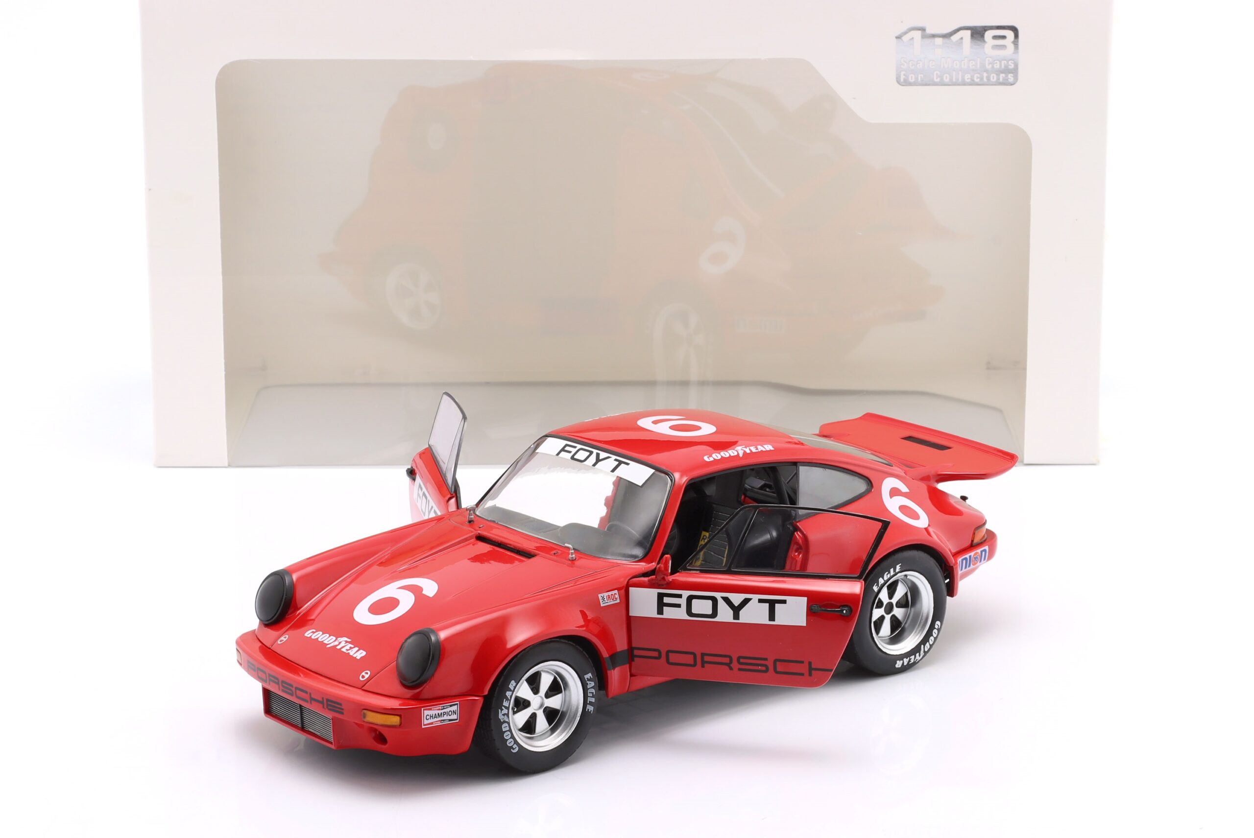 Kolekcjonerski model metalowy z elementami plastikowymi samochodu wyścigowego PORSCHE 911 CARRERA RS 3.0 #6 w którym A.J.Foyt startował w amerykańskiej serii wyścigowej IROC na Torze Daytona w roku 1974,Seria IROC (International Race of Champions) to amerykańska seria wyścigowa ,w której ścigają się najlepsi kierowcy wyścigowi z różnych kategrii w jednakowo przygotowanych samochodach.Seria miałą swoją inaugurację w roku 1974.W tej edycji kierowcy mieli do dyspozycji jednakowe samochody wyścigowe PORSCHE 911 RS.A.J.Foyt zajął w tych zawodach 6-te miejsce.W kolejnych latach kierowcy startowali w samochodach Chevrolet Camaro, Dodge Daytona, Dodge Avenger i Pontiac Firebird.Model wykonany z metalu w bardzo wysokiej jakości.posiada otwierane drzwi.Model na plastikowej podstawce z opisem modelu.Zapakowany w kartonowe pudełko z witrynką.Firma SOLIDO produjuje również kilka innych samochodów PORSCHE 911 CARRERA RS z tego wyścigu.