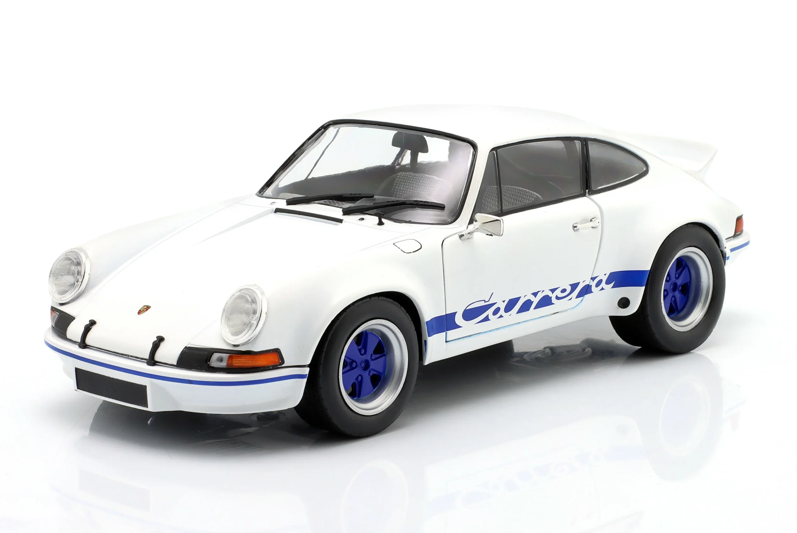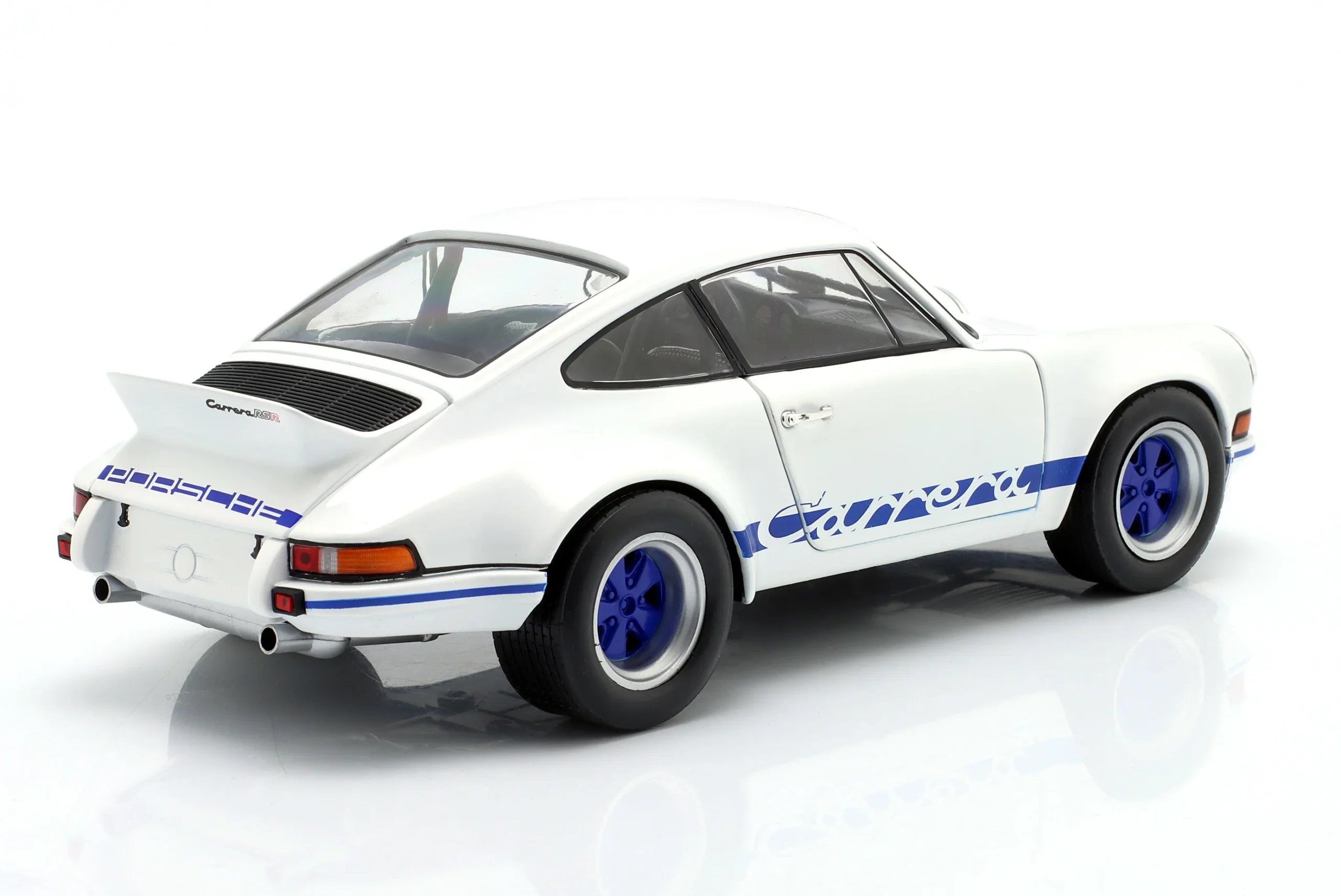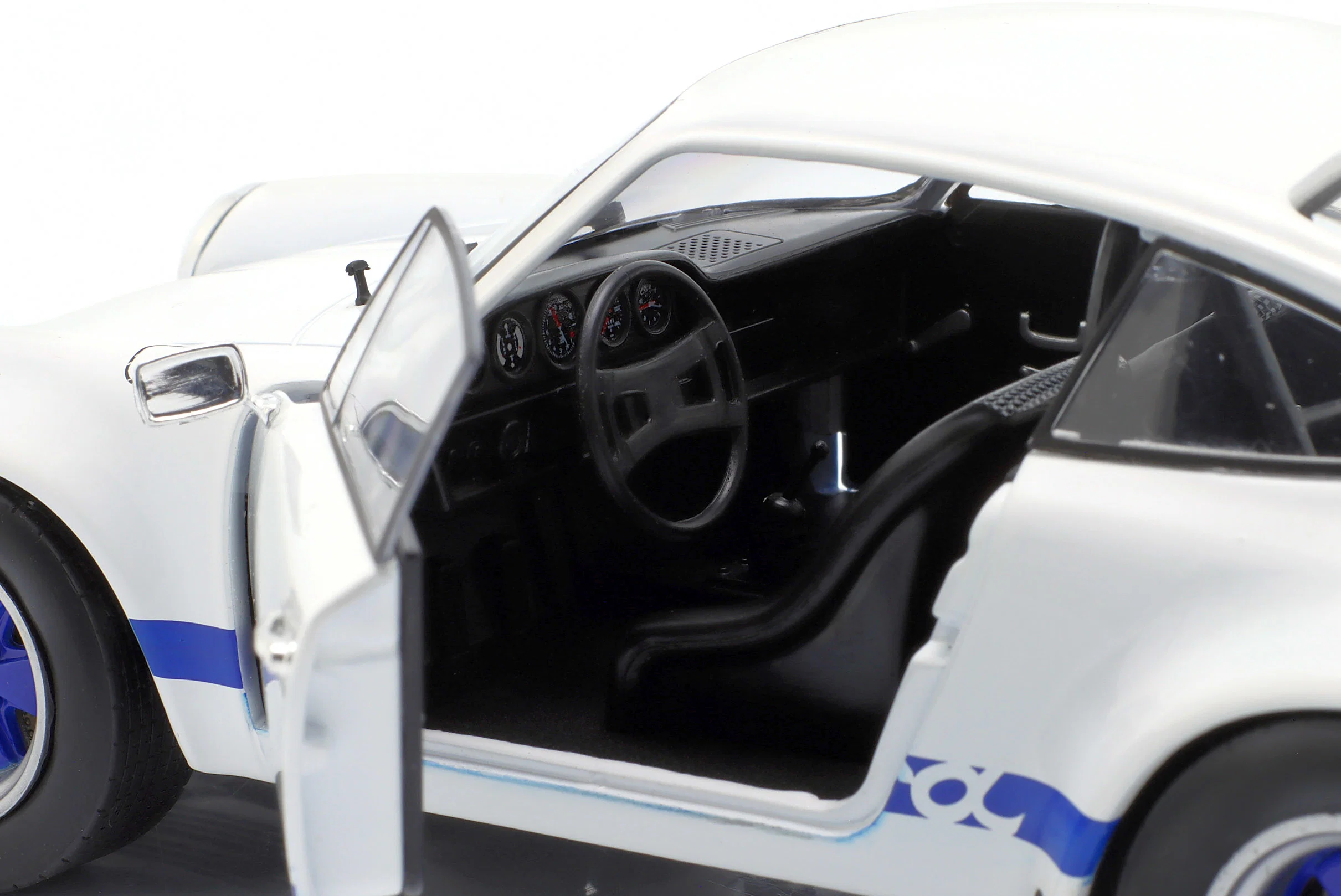 Kolekcjonerski model metalowy z elementami plastikowymi samochodu PORSCHE 911 RSR z roku 1973 w kolorze Białym z Niebieskimi pasami Carrera.Model posiada otwierane drzwi.