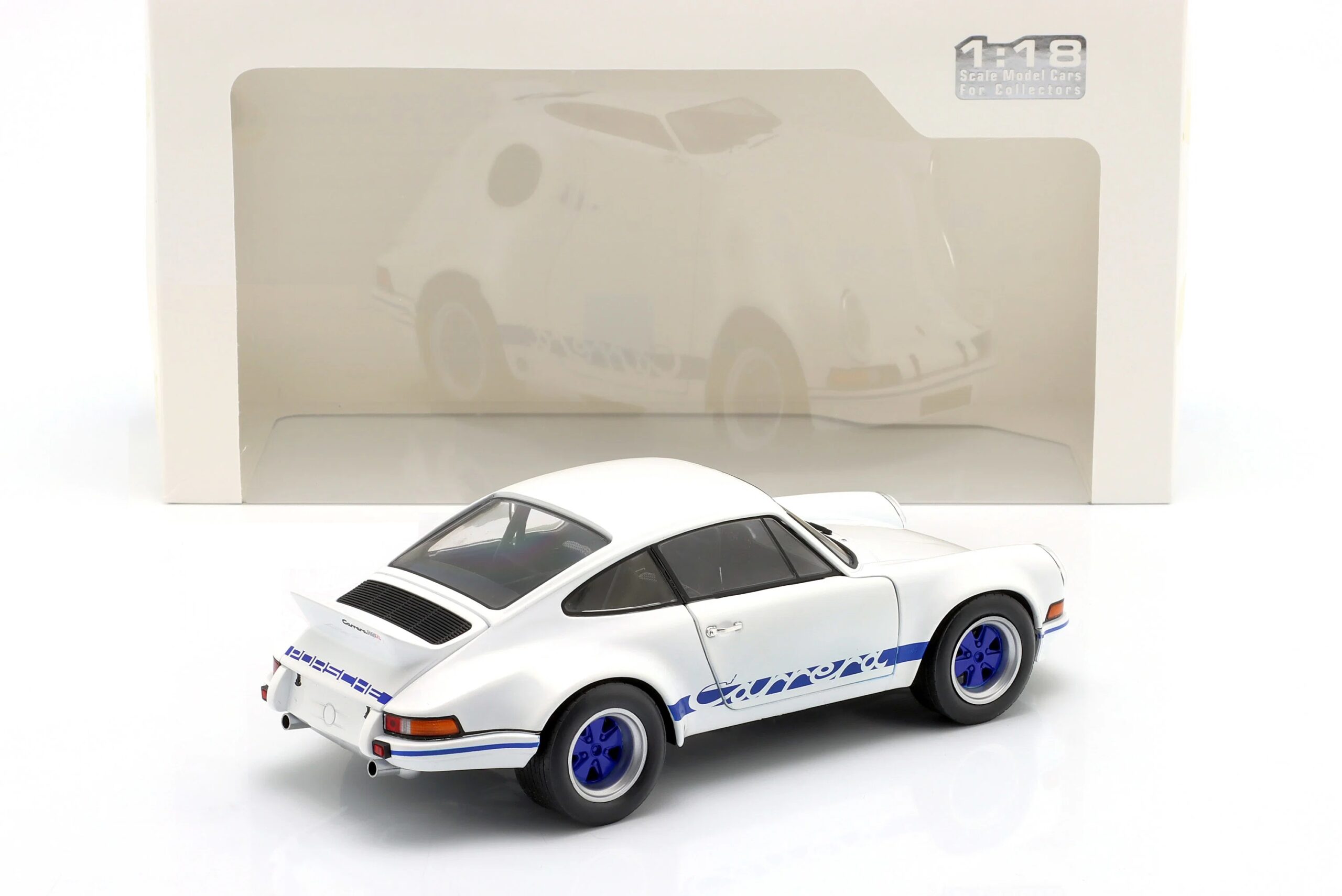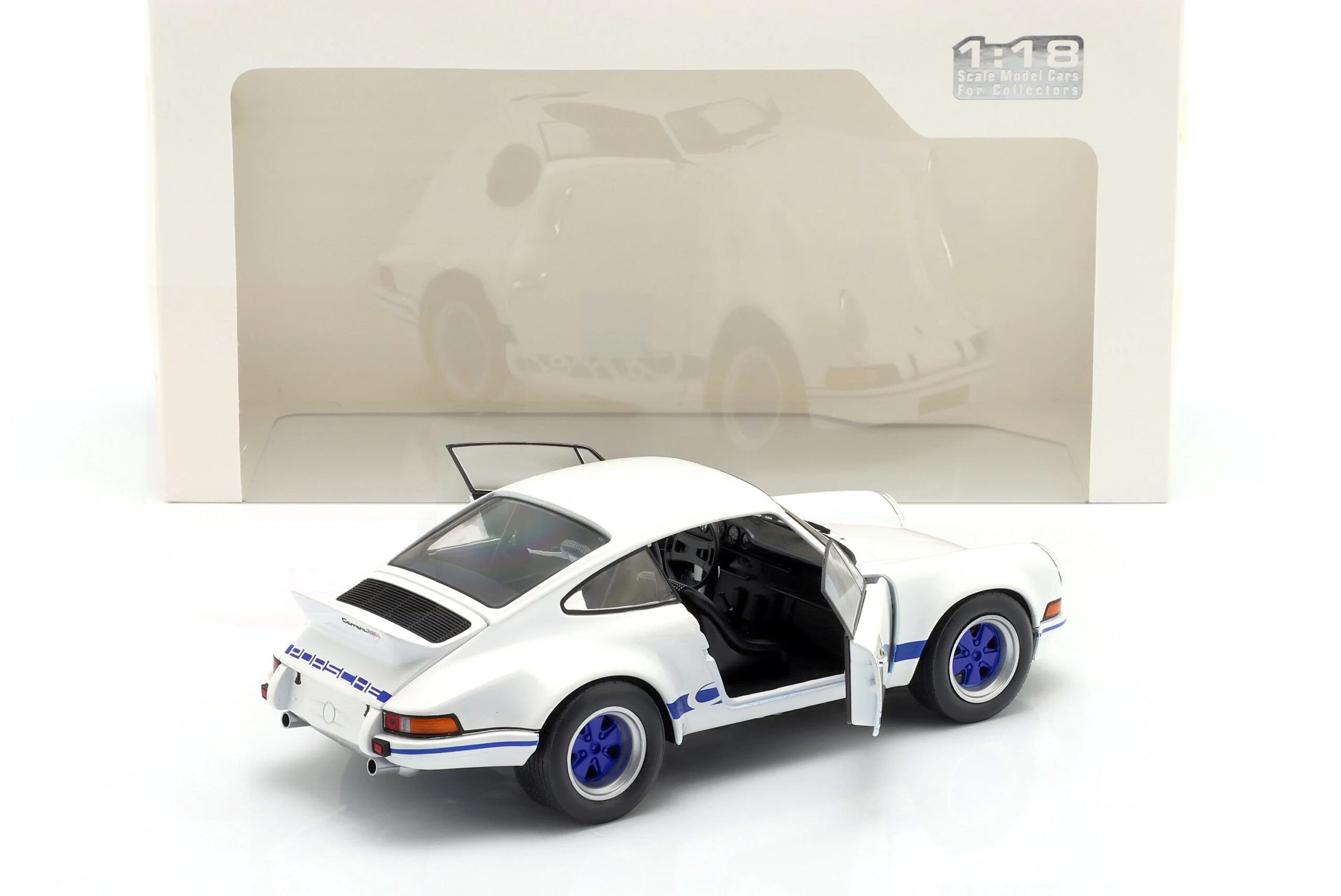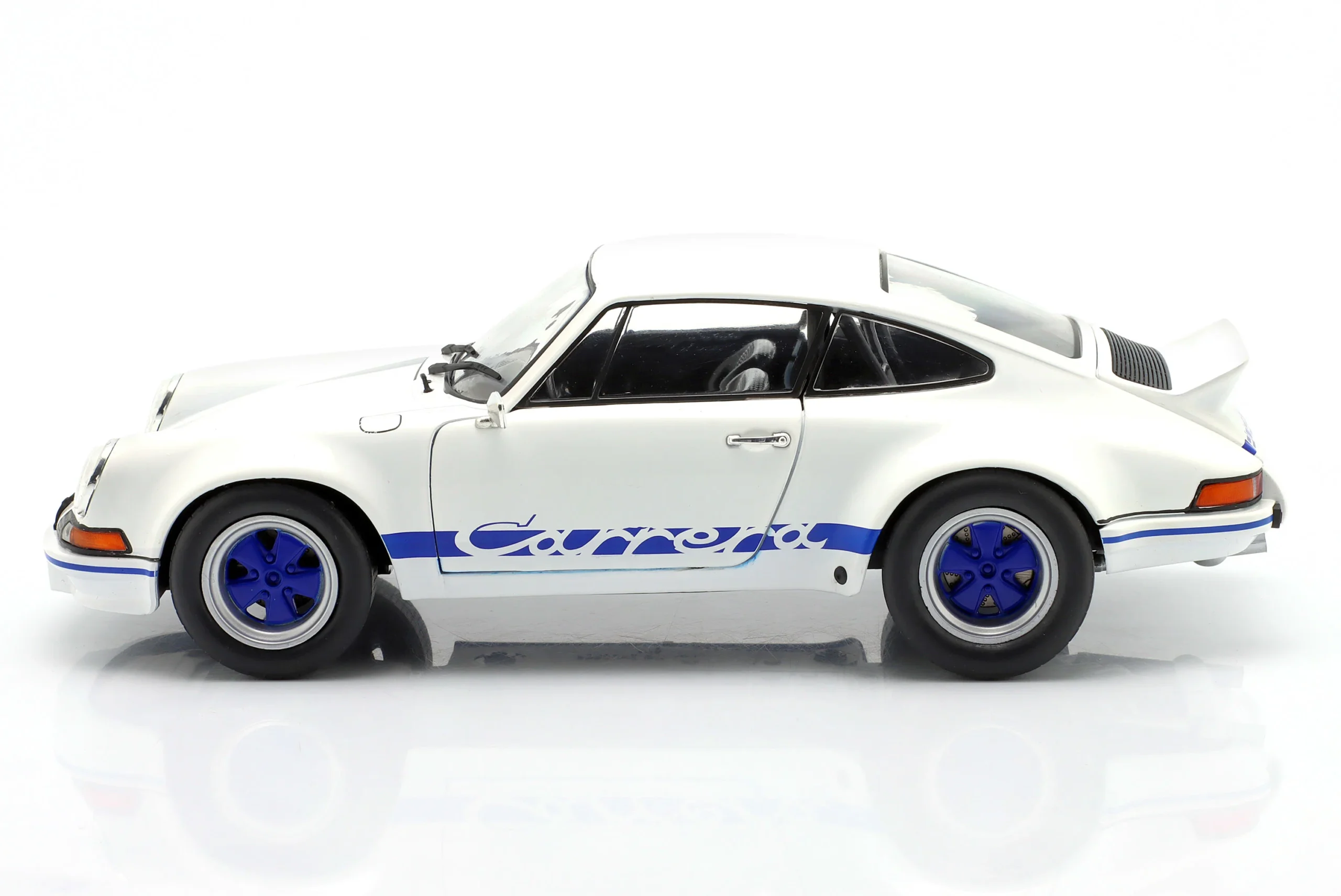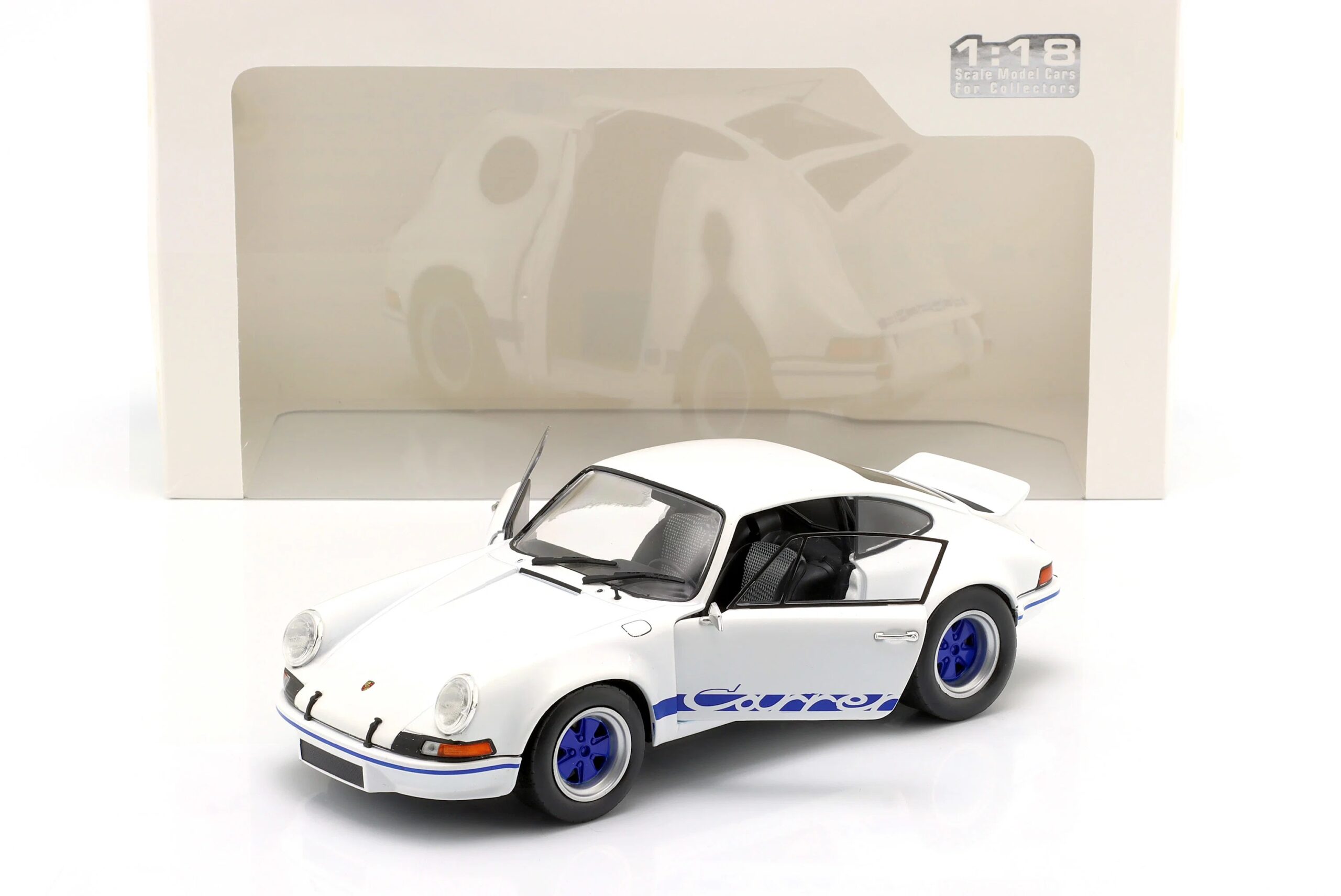 Kolekcjonerski model metalowy z elementami plastikowymi samochodu PORSCHE 911 RSR z roku 1973 w kolorze Białym z Niebieskimi pasami Carrera.Model posiada otwierane drzwi.