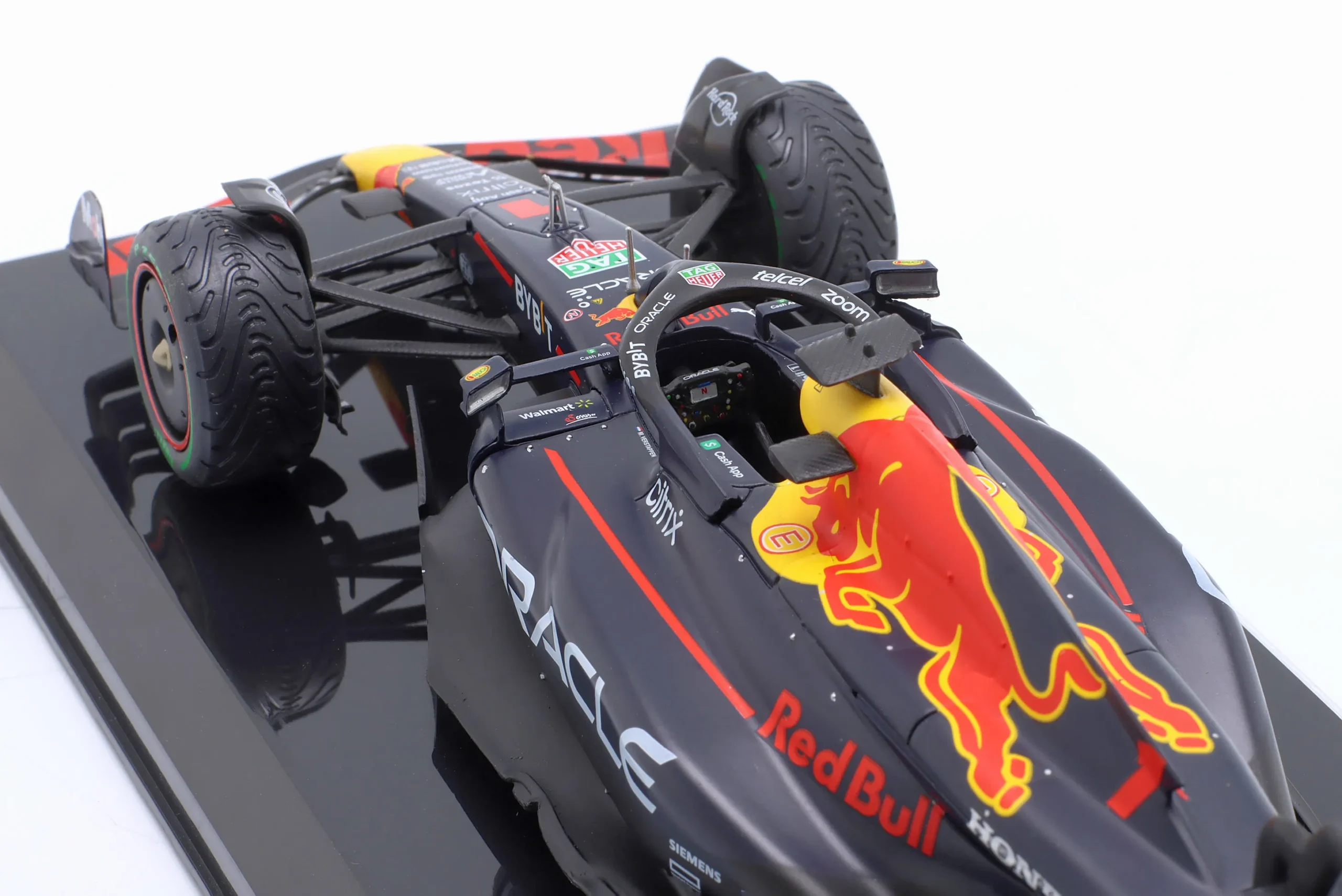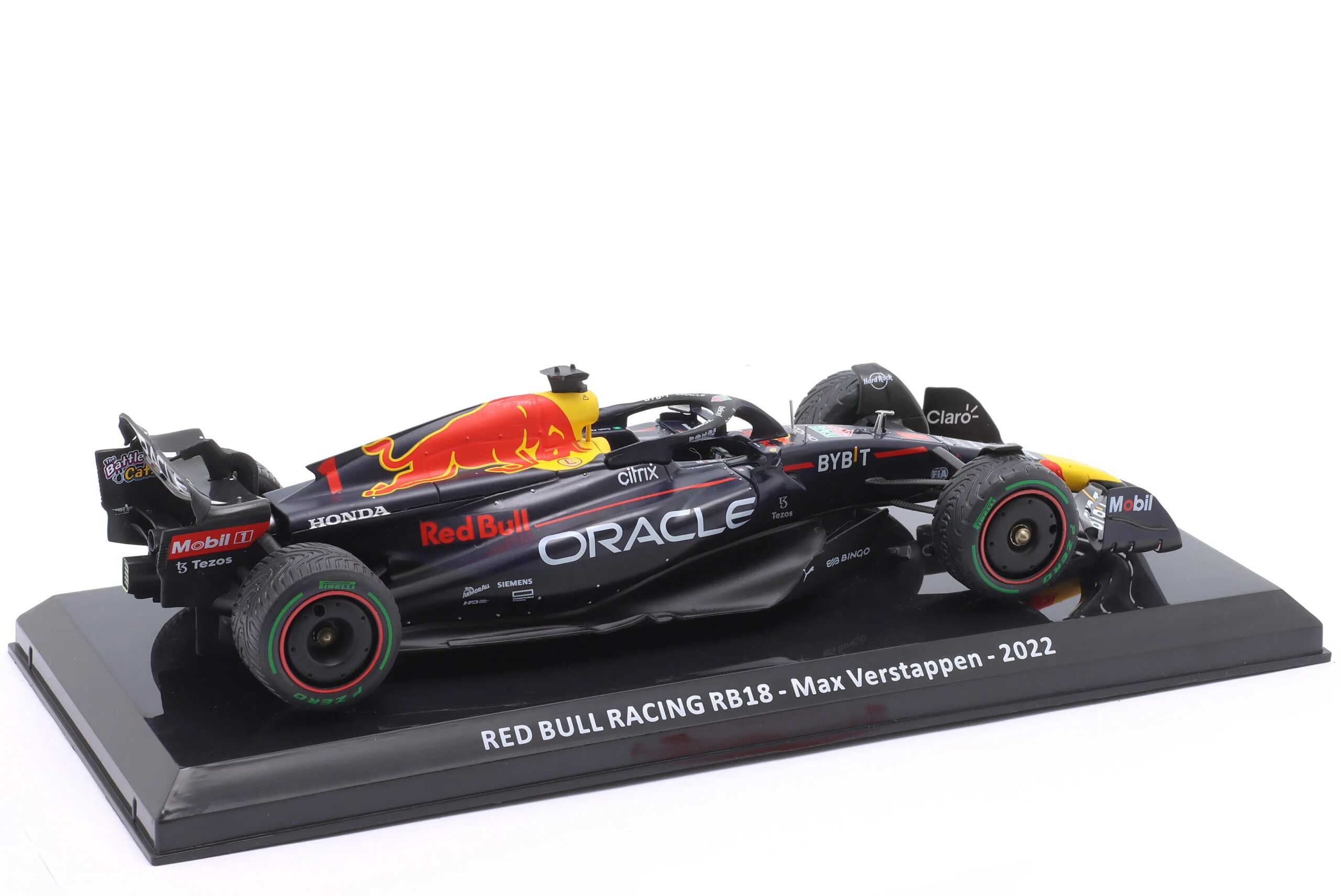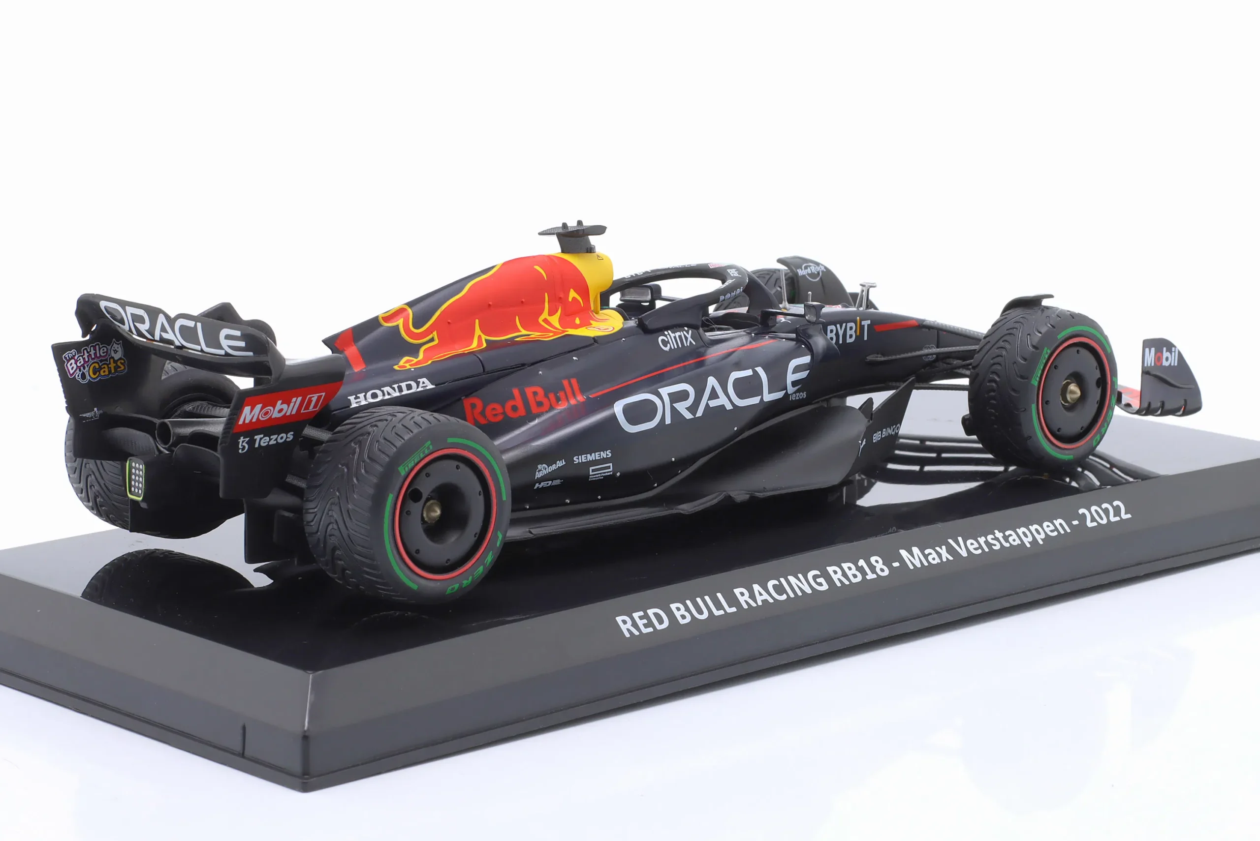 Kolekcjonerski model metalowy z elementami plastikowymi bolidu Formuły 1 RED BULL RACING RB18 #1 w którym Max Verstappen zdobył Tytuł Mistrza Świata Formuły 1 w sezonie 2022.Model na podstawce,zapakowany w blister.