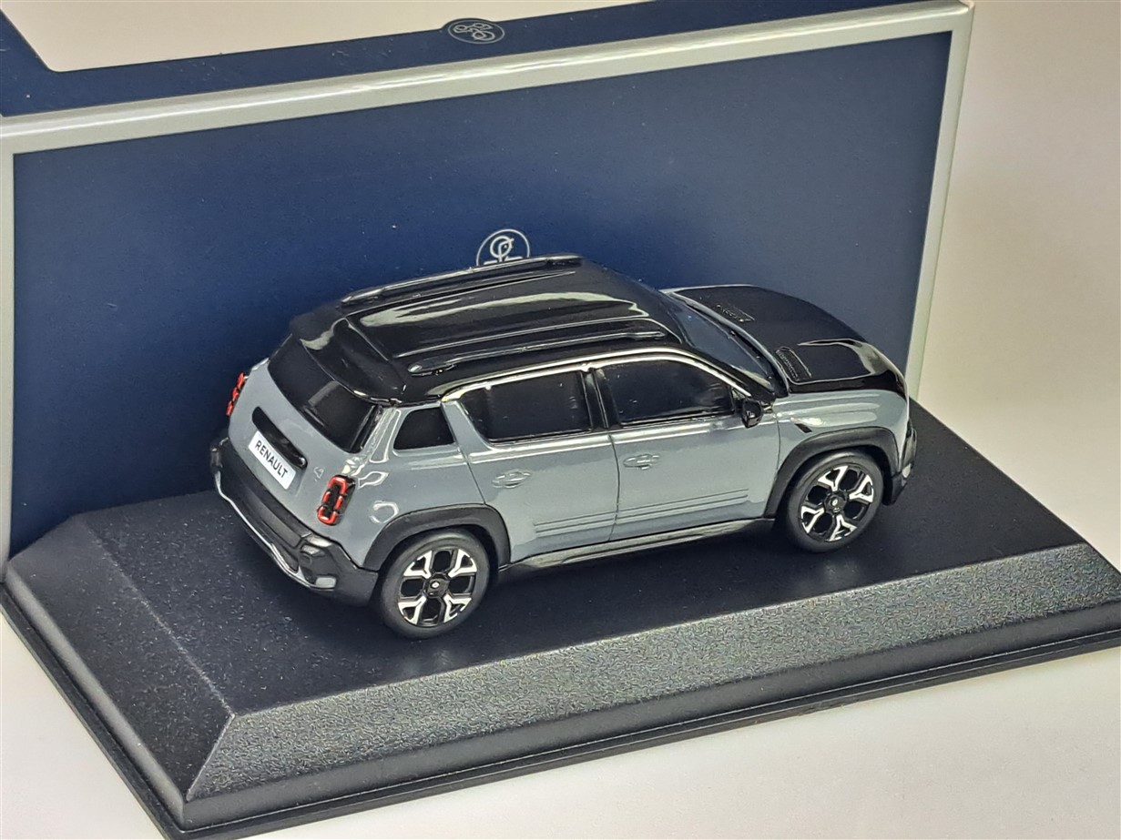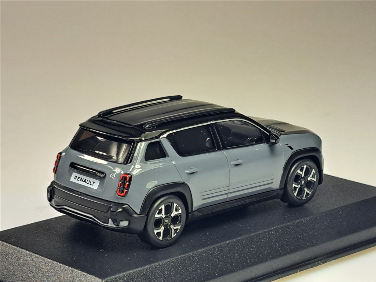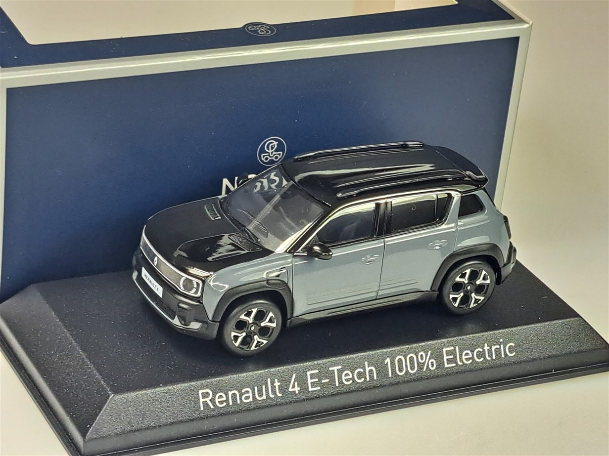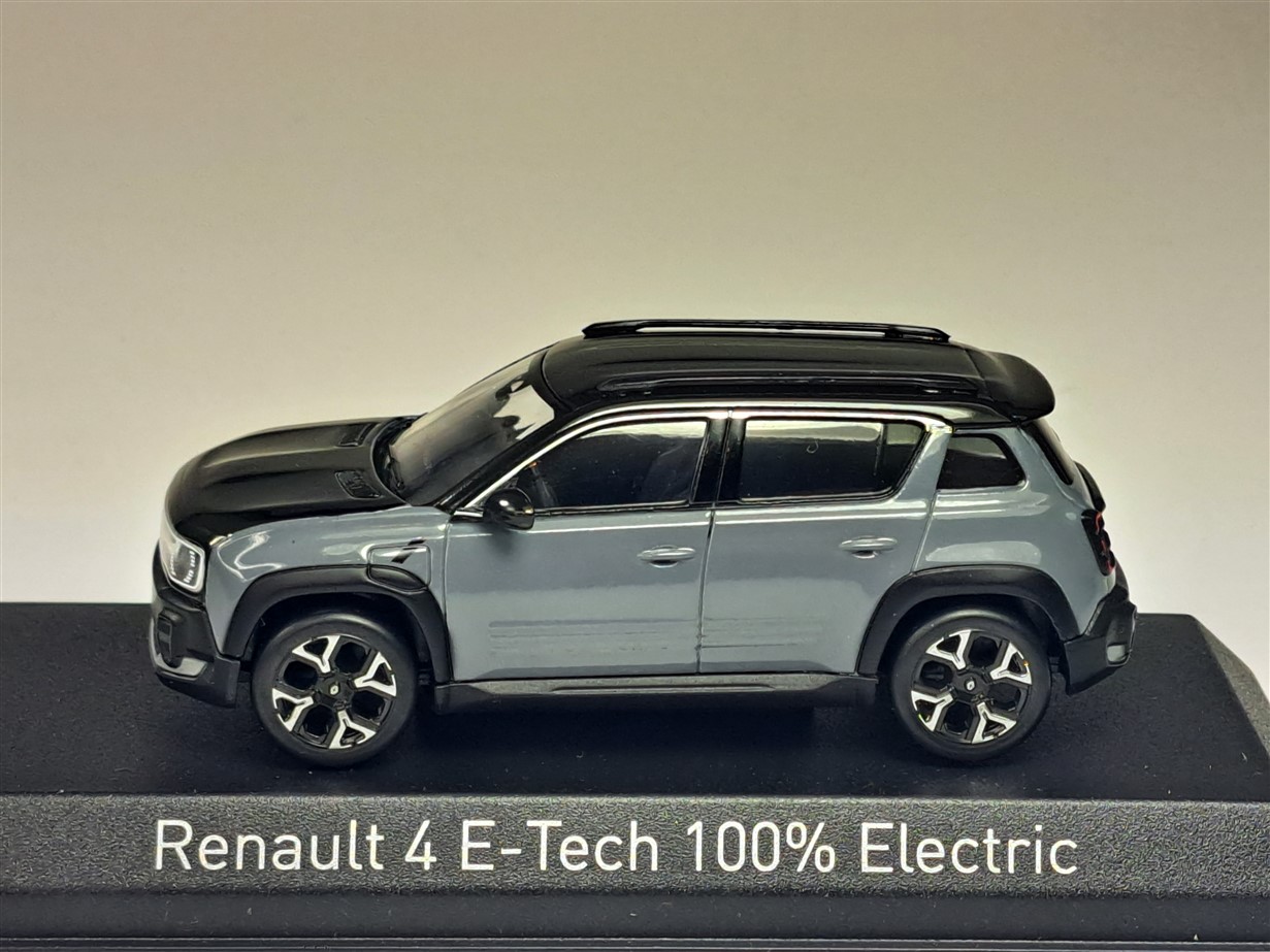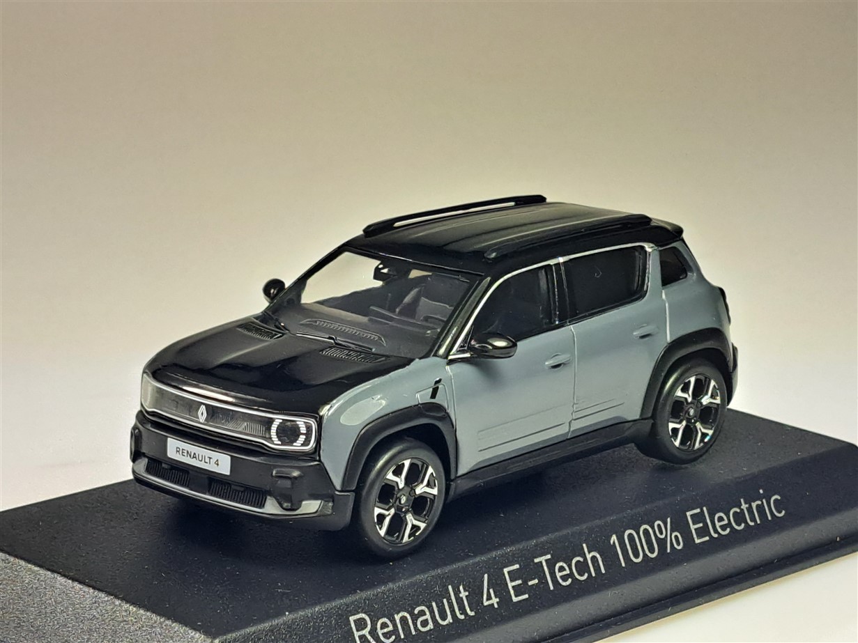 Kolekcjonerski model metalowy z elementami plastikowymi samochodu RENAULT 4 E-Tech 100% Electric z roku 2025 w kolorze Urban Grey.