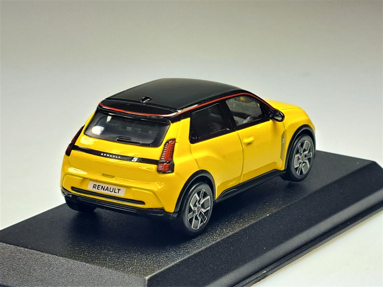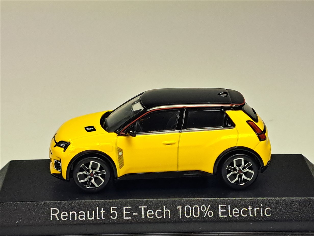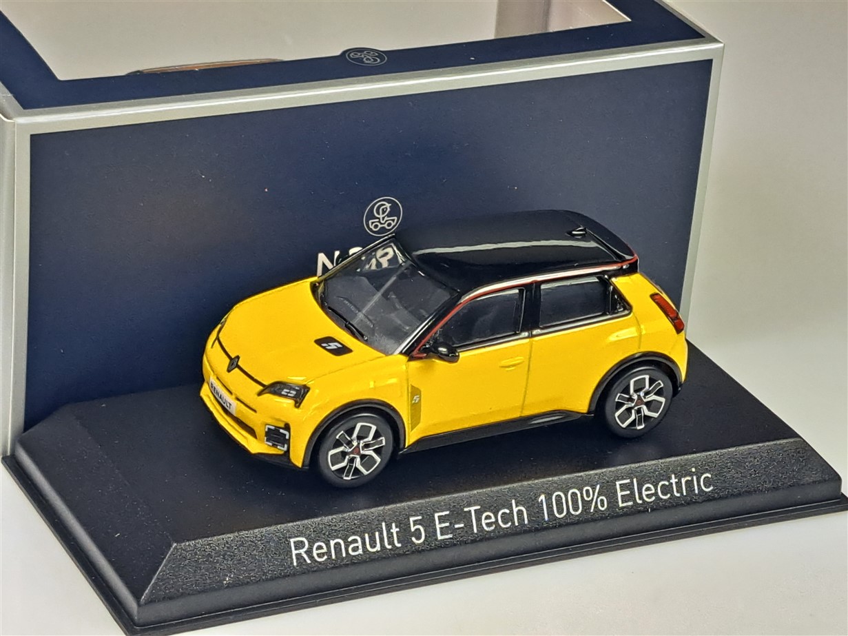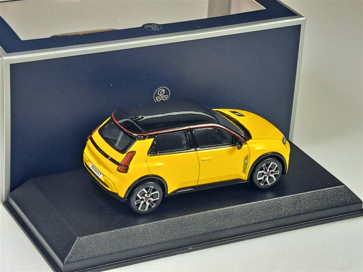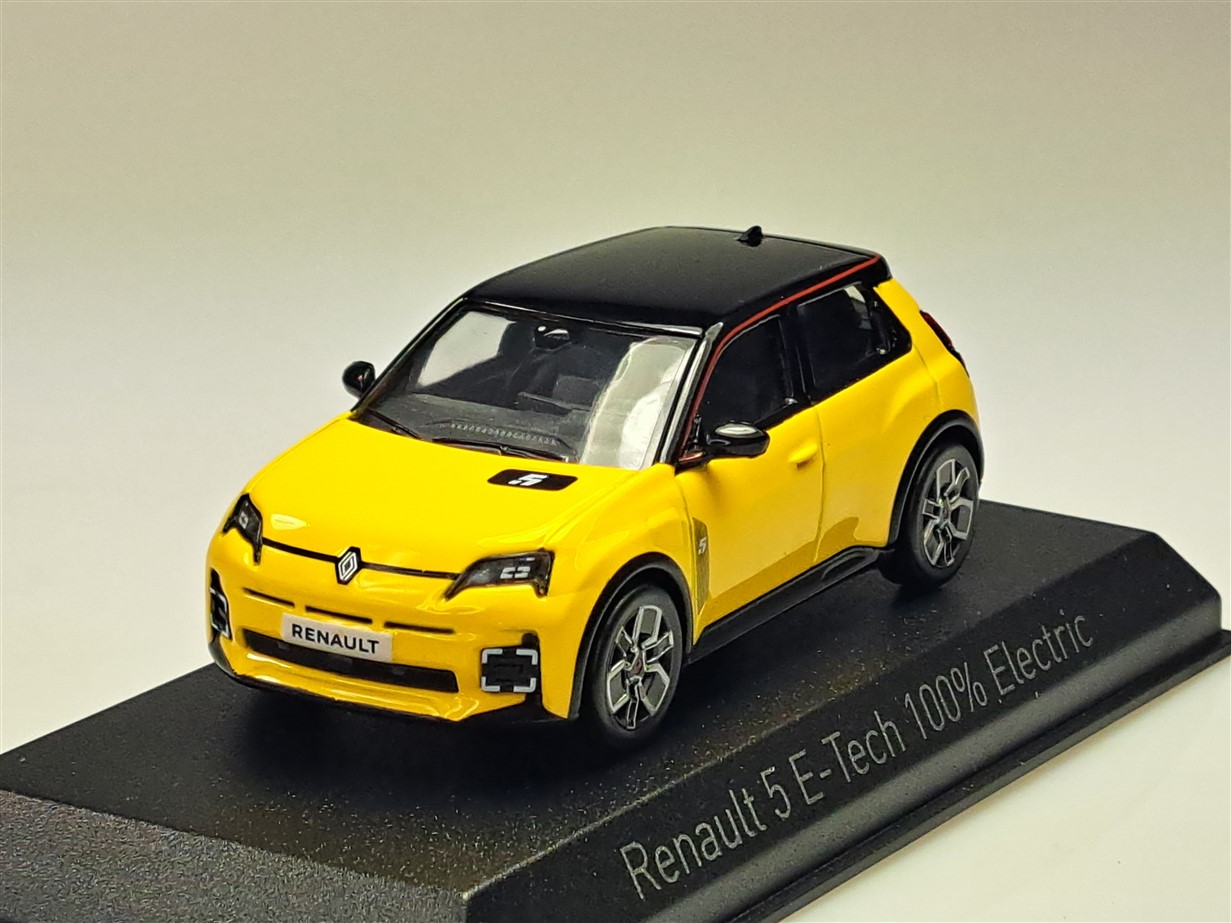 Kolekcjonerski model metalowy z elementami plastikowymi samochodu RENAULT 5 E-Tech 100% Electric z roku 2024 w kolorze Pop Yellow/Black.