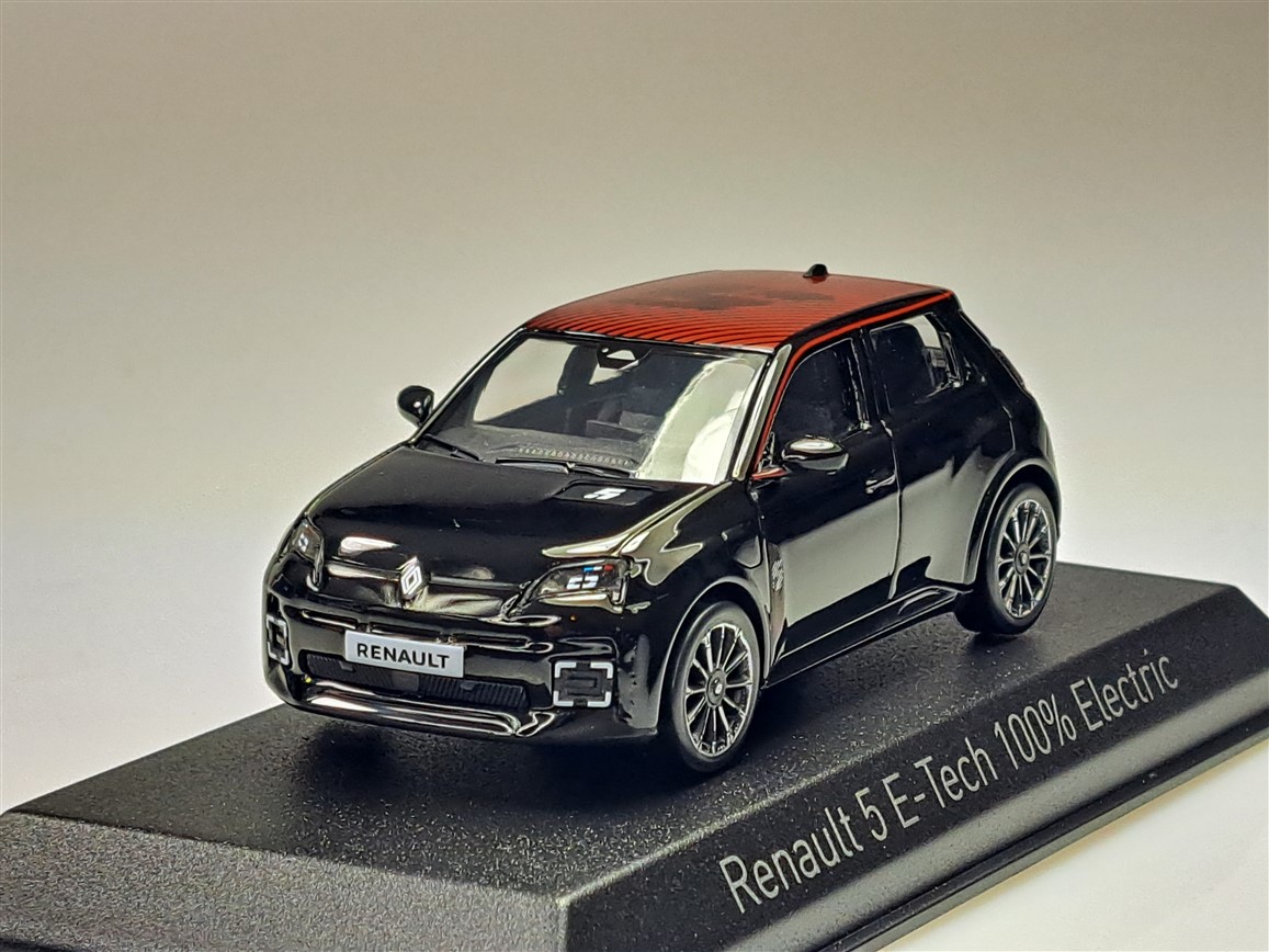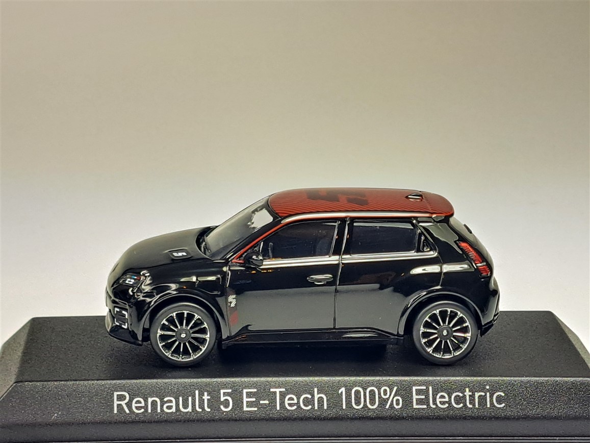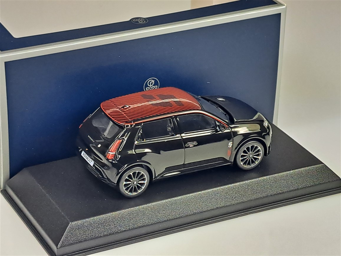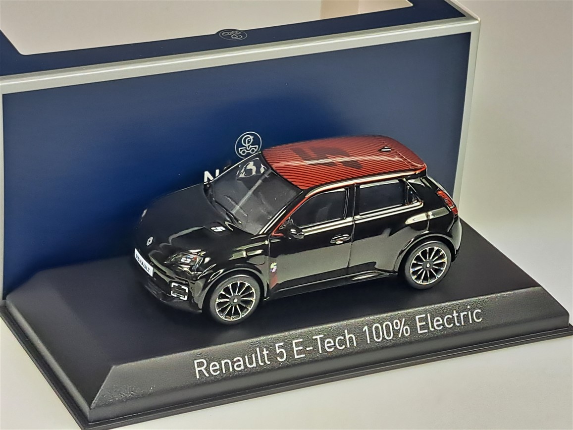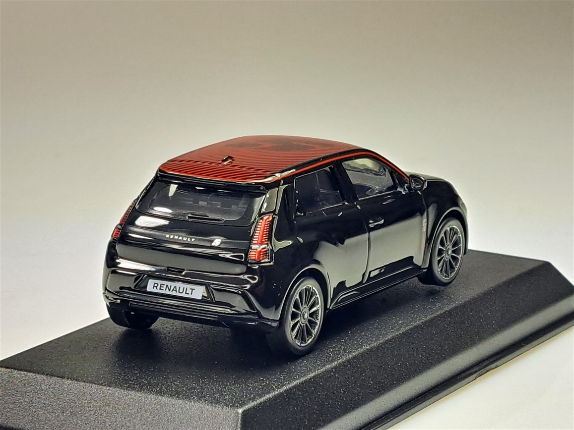 Kolekcjonerski model metalowy z elementami plastikowymi samochodu RENAULT 5 E-Tech 100% Electric z roku 2025 w kolorze Diamond black/Red Deco.