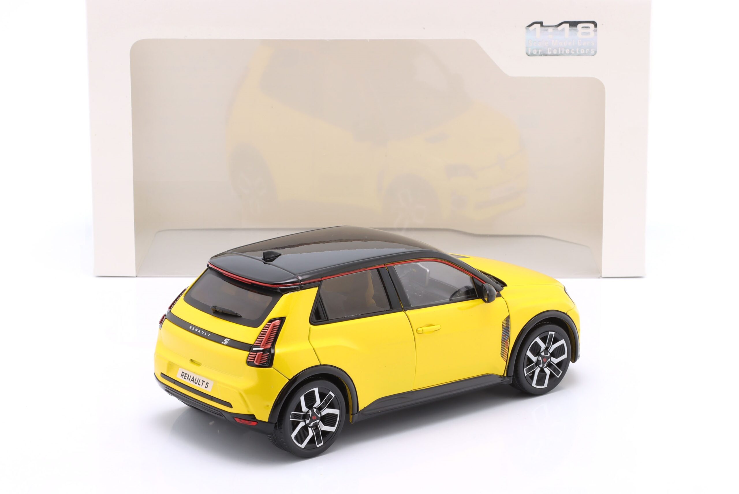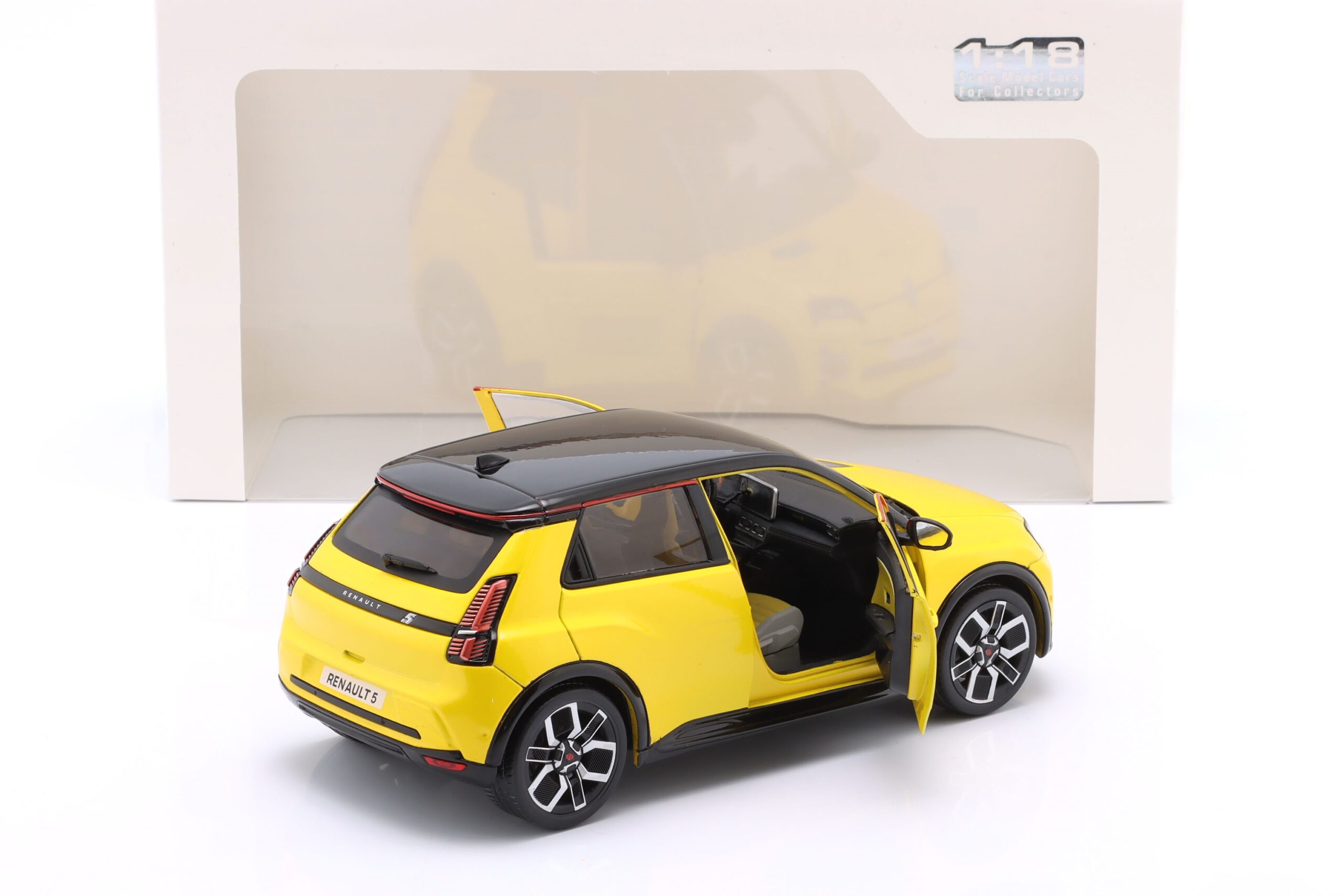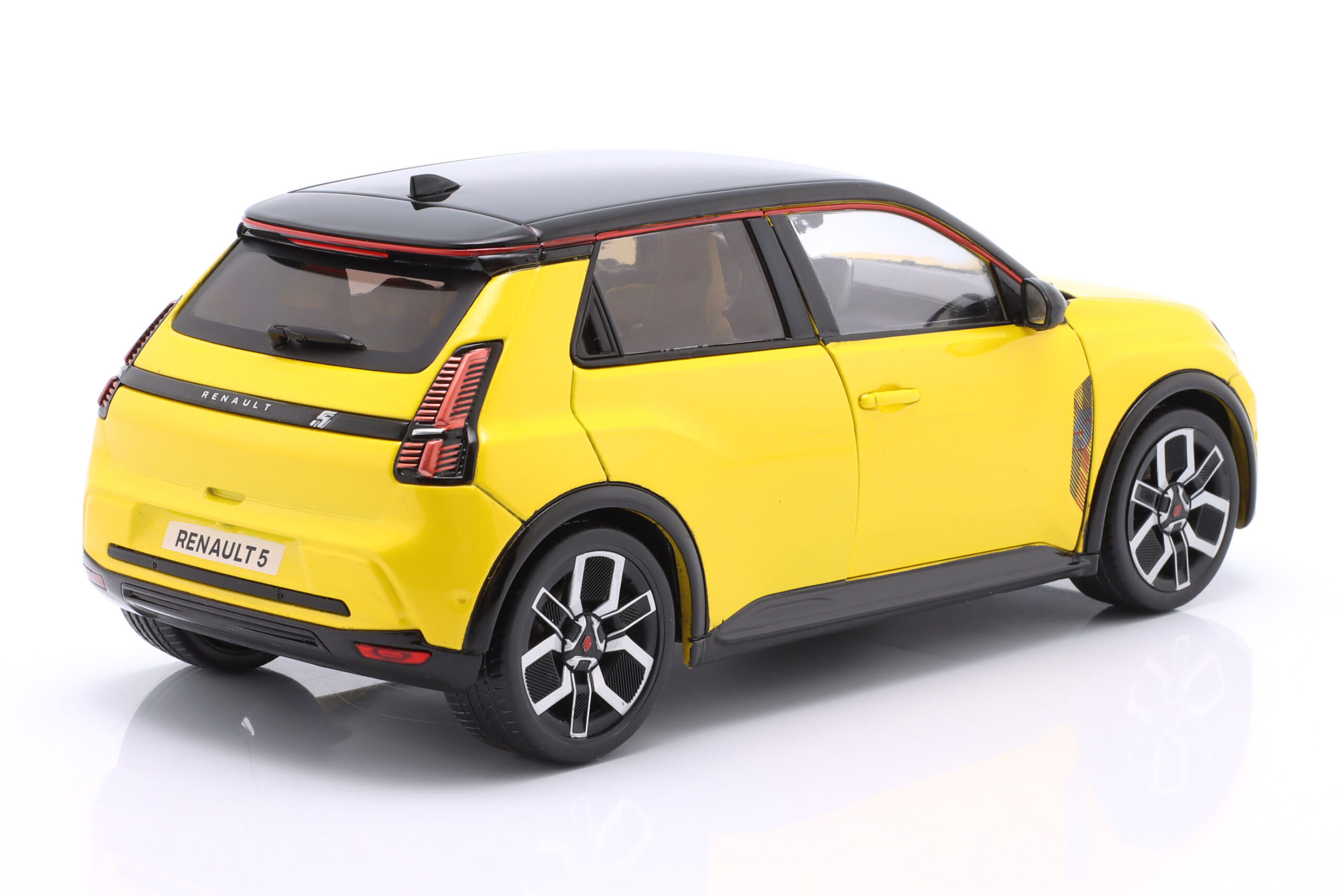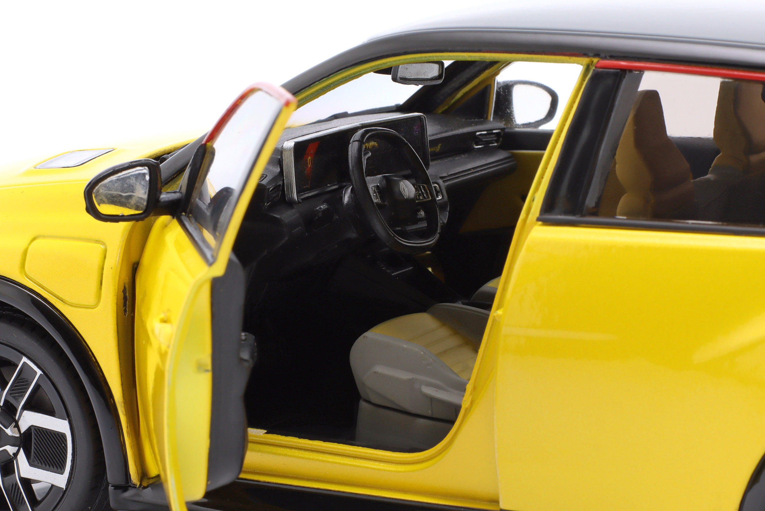 Kolekcjonerski model metalowy z elementami plastikowymi samochodu RENAULT 5 E-Tech roku 2024 w kolorze Pop yellow.Model posiada otwierane drzwi.