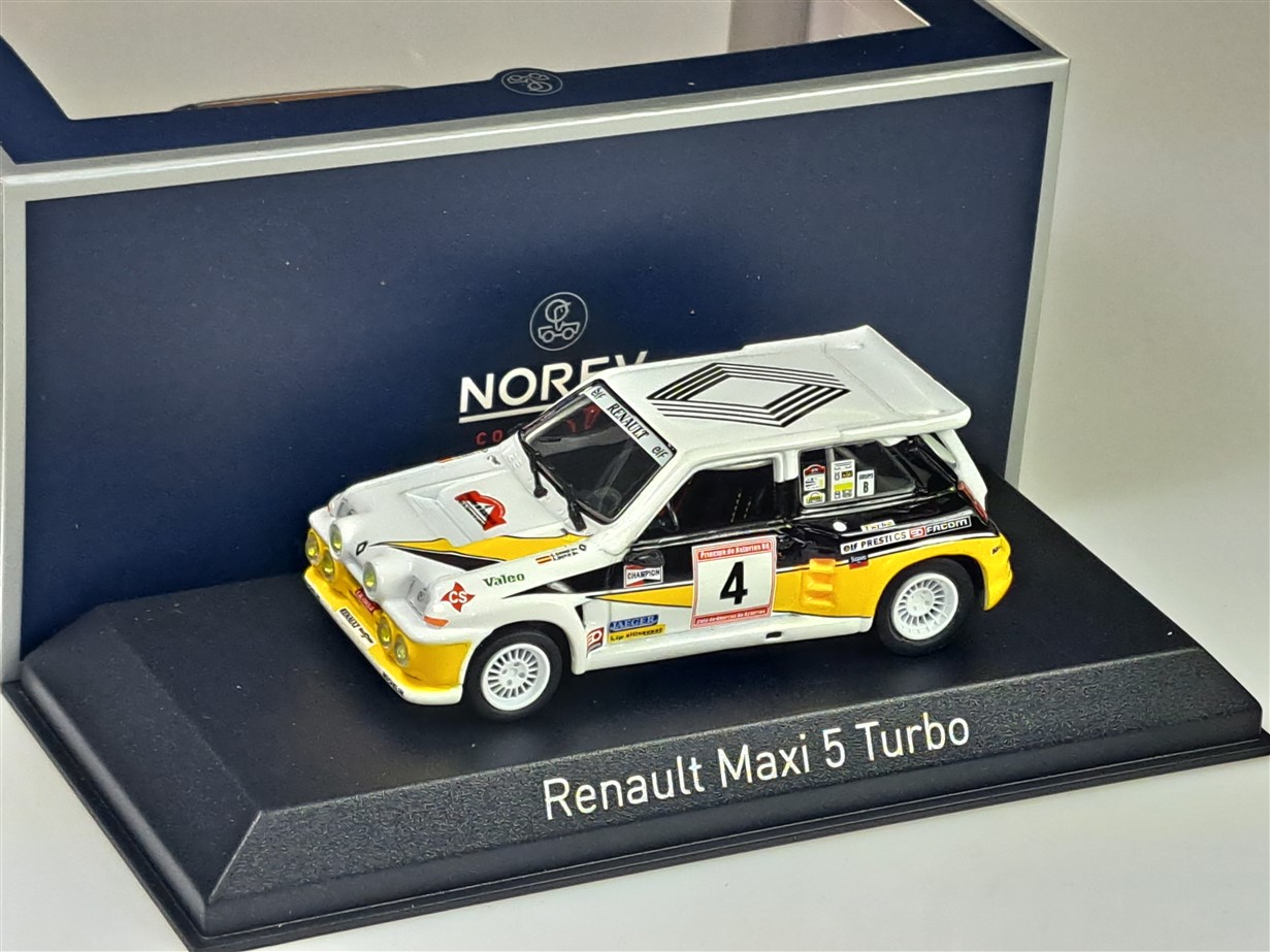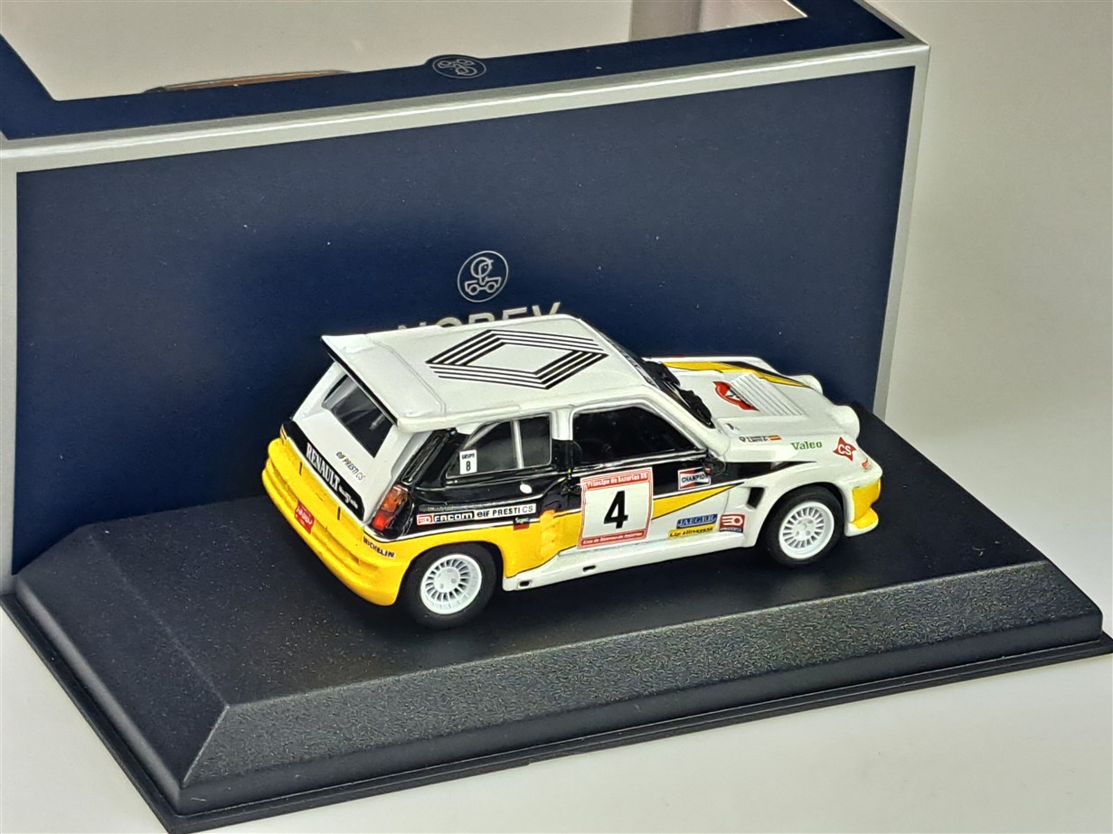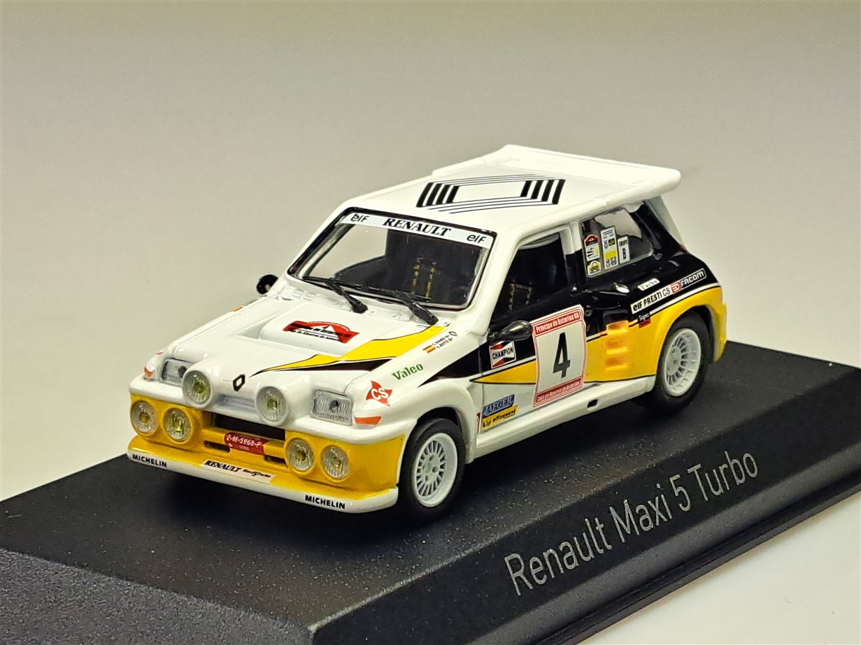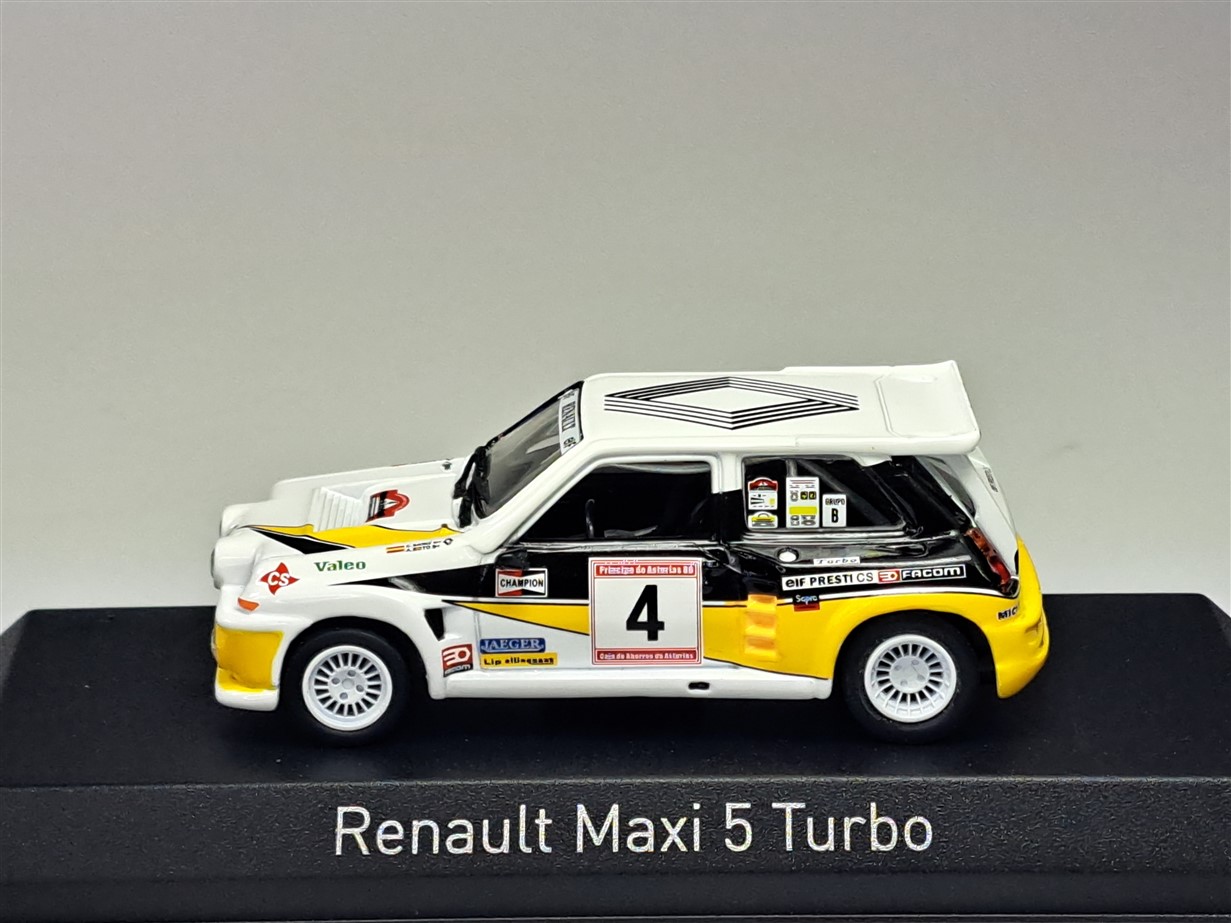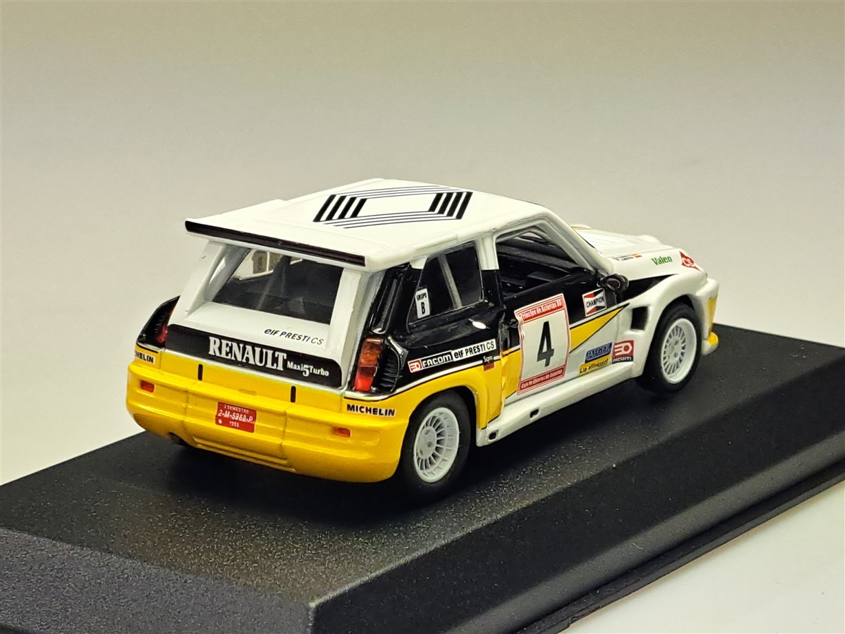 Kolekcjonerski model metalowy z elementami plastikowymi samochodu rajdowego RENAULT Maxi 5 Turbo #4.w którym załoga C.Sainz/A.Boto startowała w Rajdzie Asturii (Rally Principe de Asturias – Spain) w roku 1986.