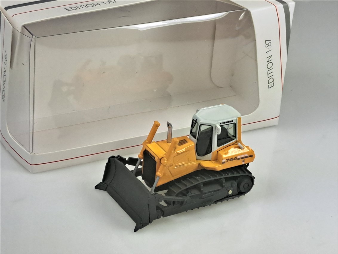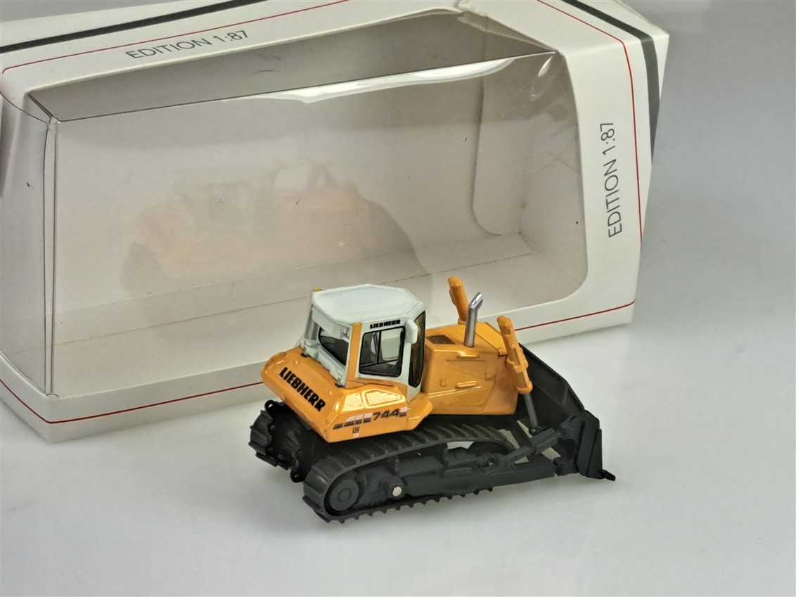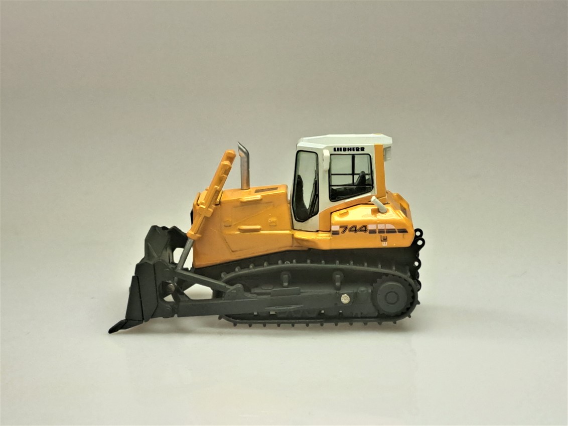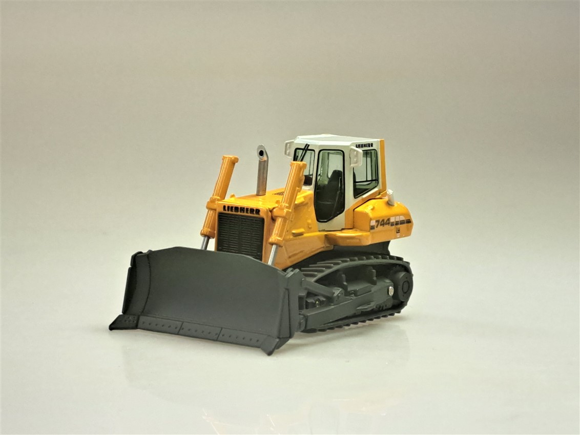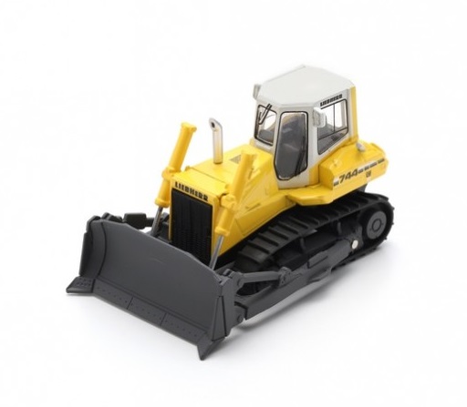Kolekcjonerski model metalowy z elementami plastikowymi spychacza LIEBHERR PR744 w kolorze żółtym.