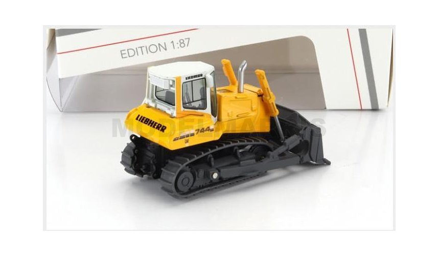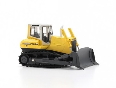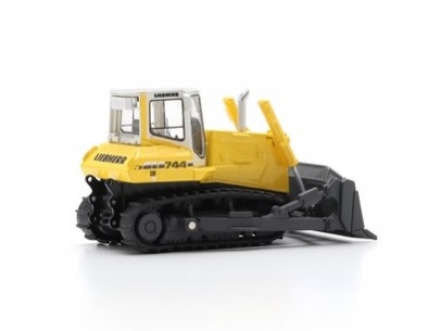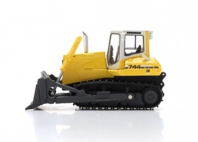 Kolekcjonerski model metalowy z elementami plastikowymi spycharki gąsienicowej LIEBHERR PR 744 produkowanej w latach 2006-2016 w kolorze Żółtym.