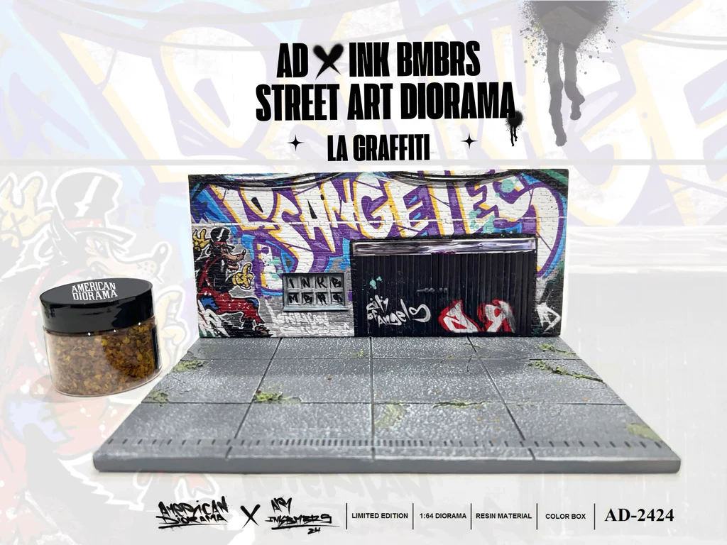 Kolekcjonerska diorama wykonana z tworzywa sztucznego Street Art Diorama: LA Grafitti 2024. Zestaw zapakowany w kartonowe pudełko do samodzielnego montażu.Modele samochodów i figurki nie są częścią zestawu.W słoiczku znajdują się listki imitujące jesienne liście,które można wykorzystać w dioramie jak widać na kolejnych zdjęciach.