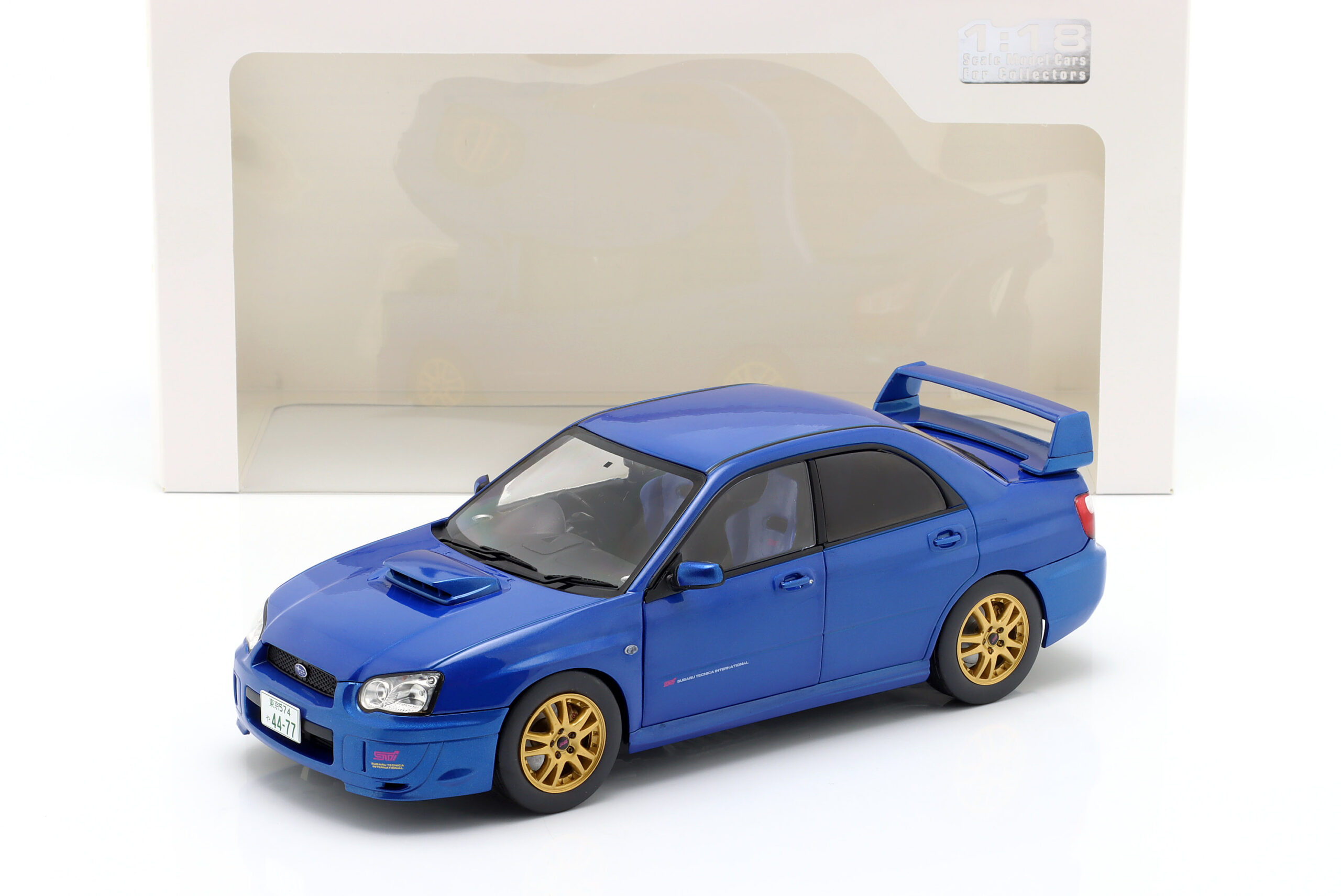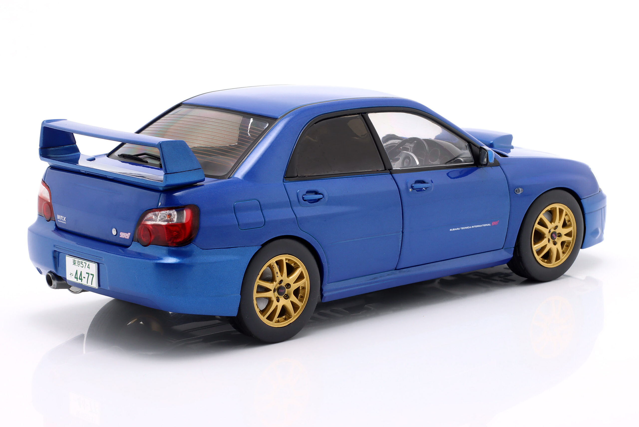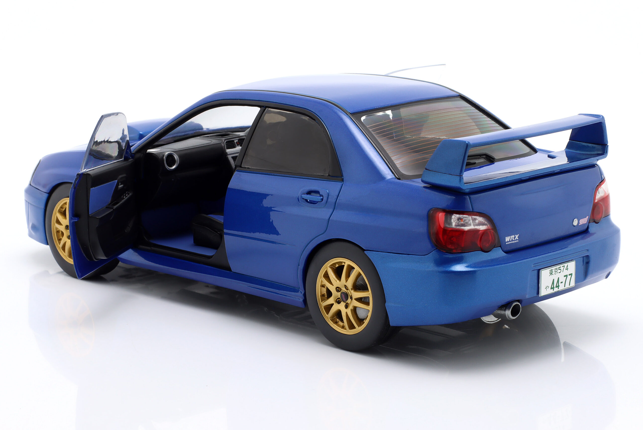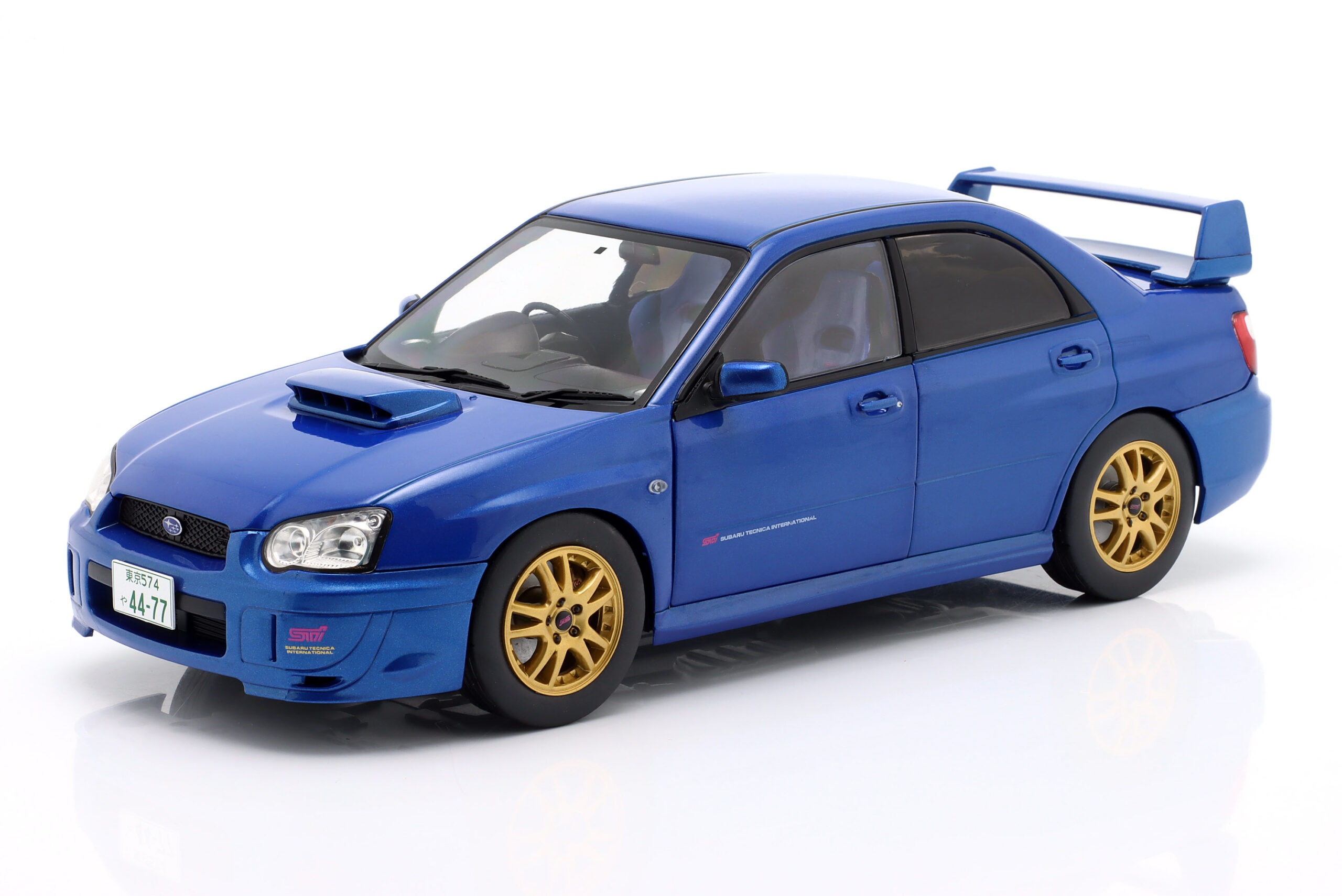 Kolekcjonerski model metalowy z elementami plastikowymi samochodu SUBARU IMPREZA WRX STI z roku 2003 w kolorze Sonic Blue.