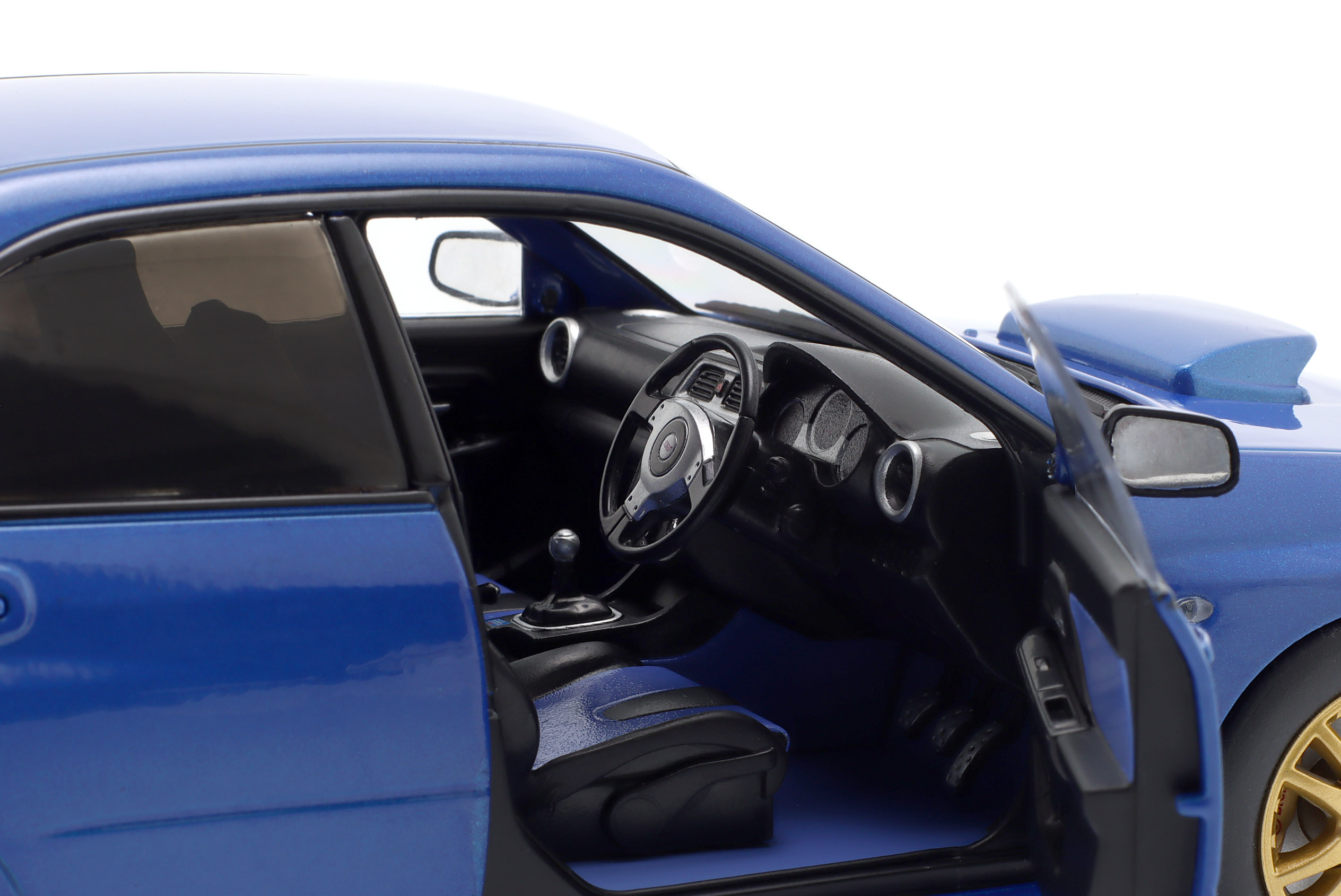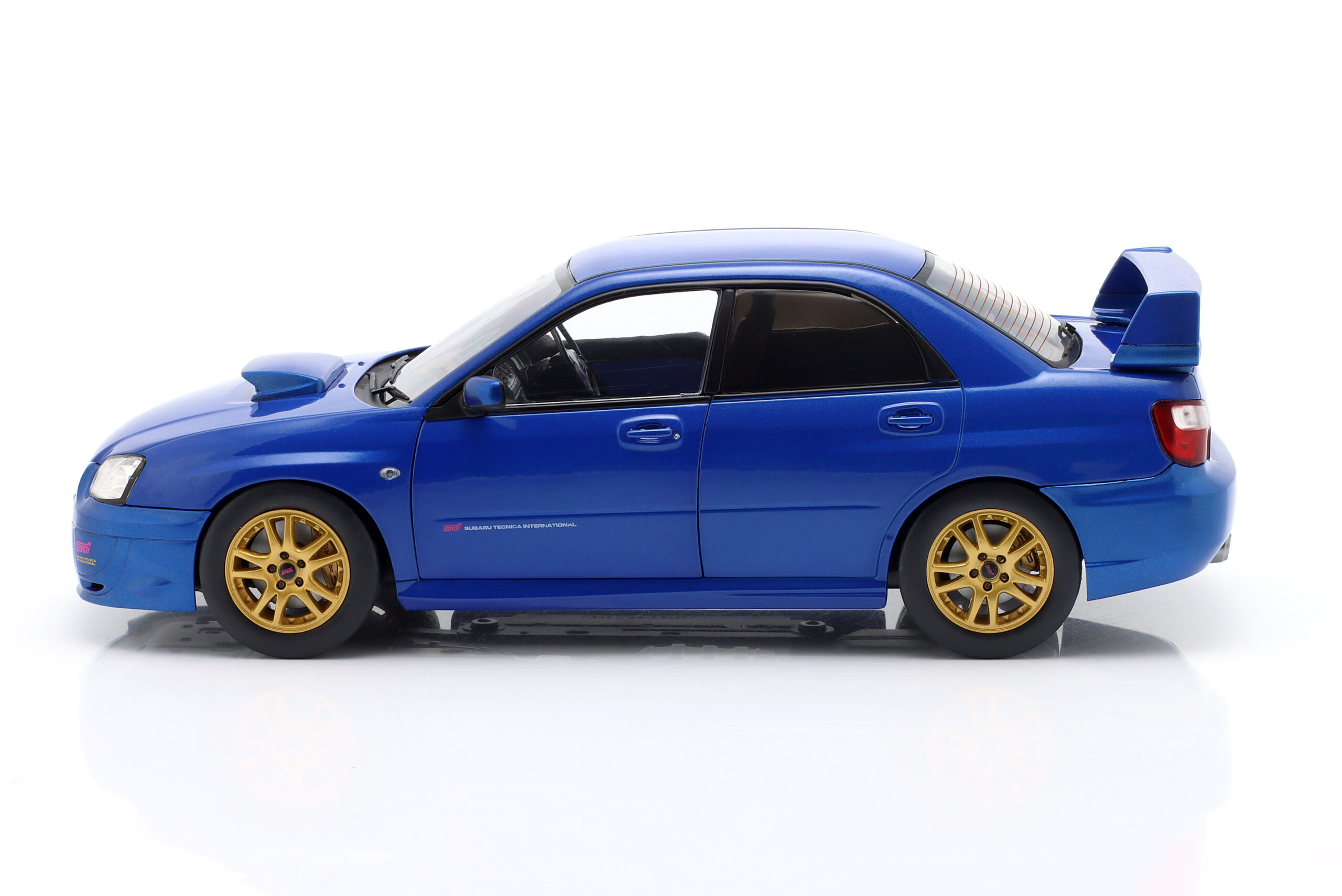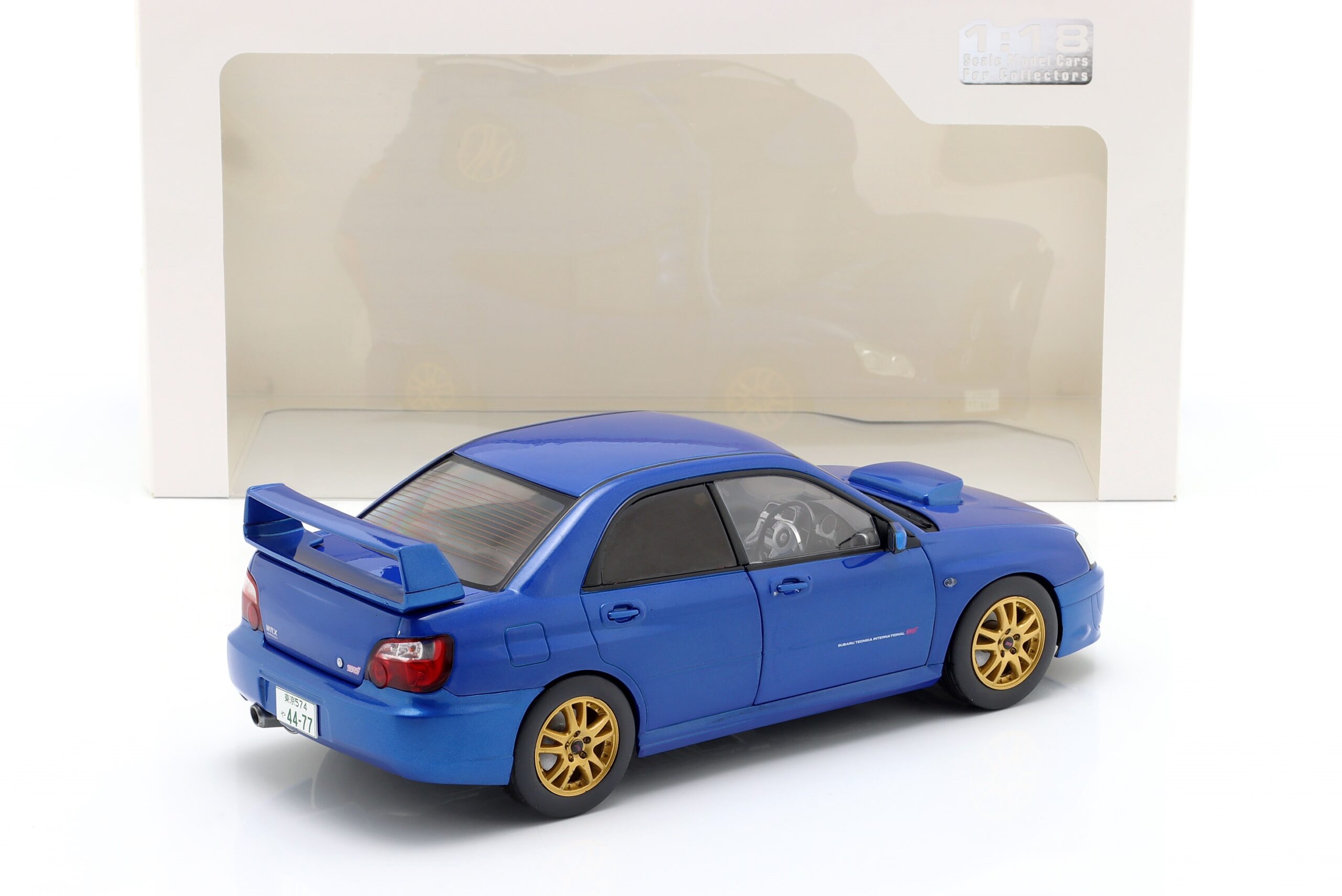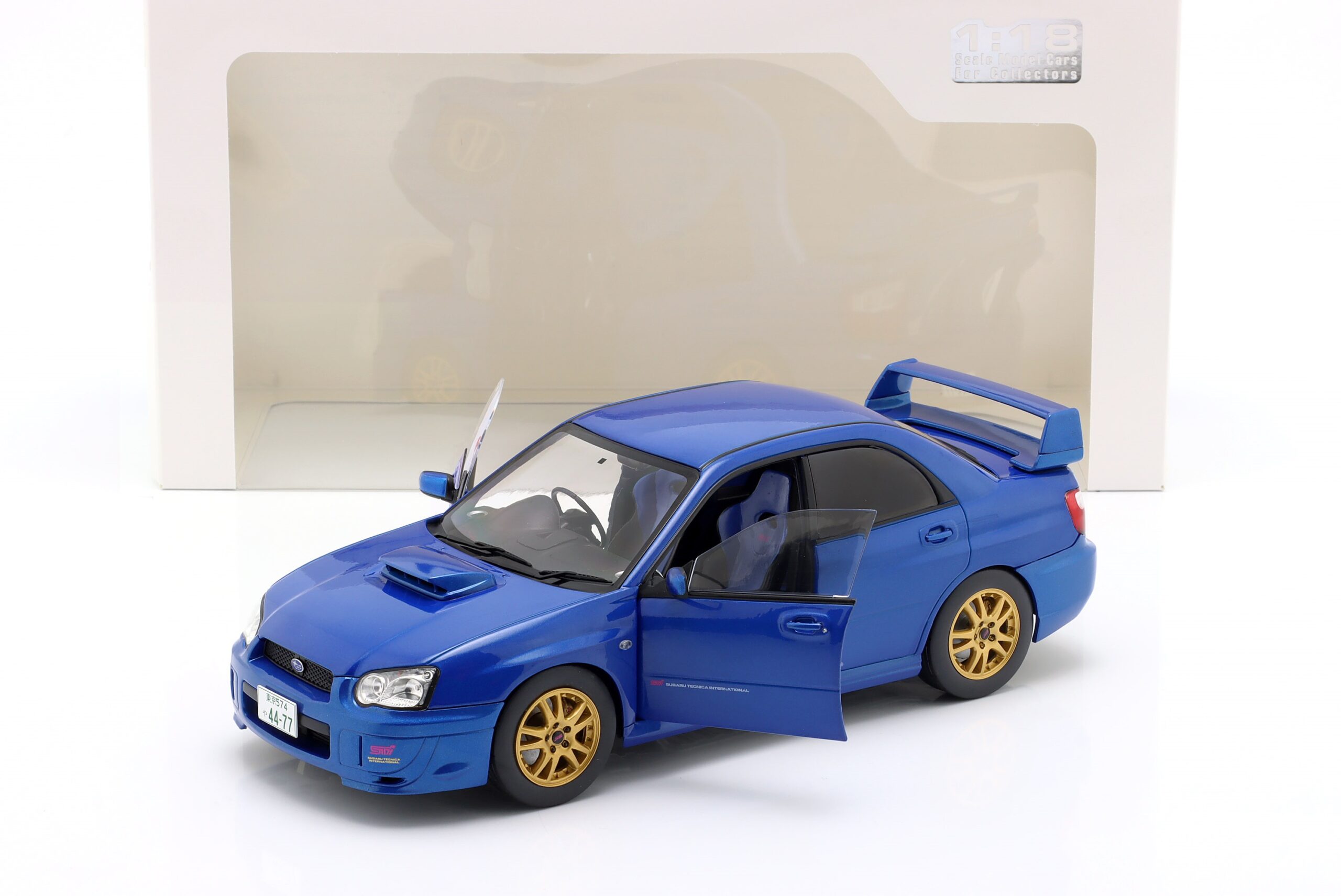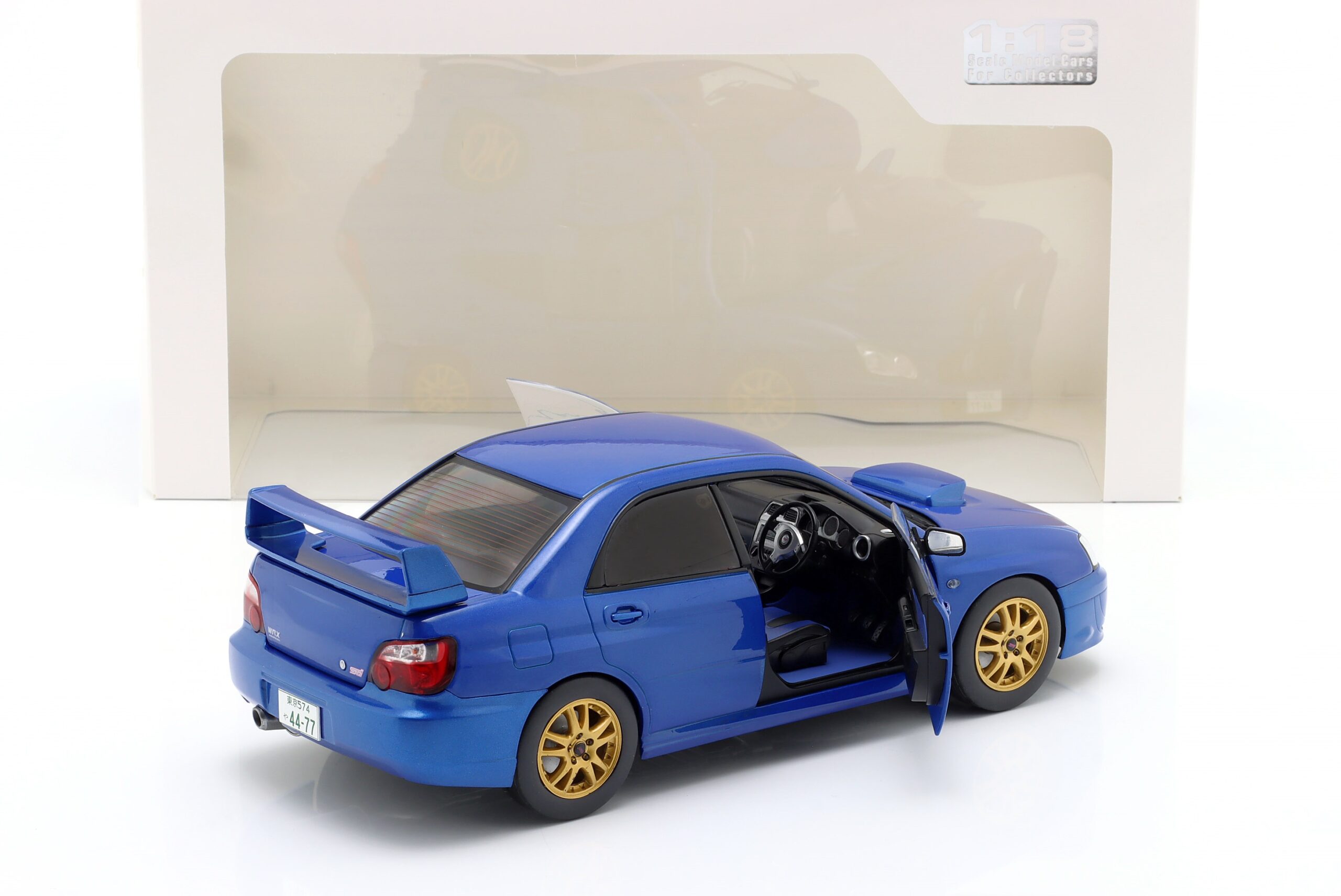 Kolekcjonerski model metalowy z elementami plastikowymi samochodu SUBARU IMPREZA WRX STI z roku 2003 w kolorze Sonic Blue.