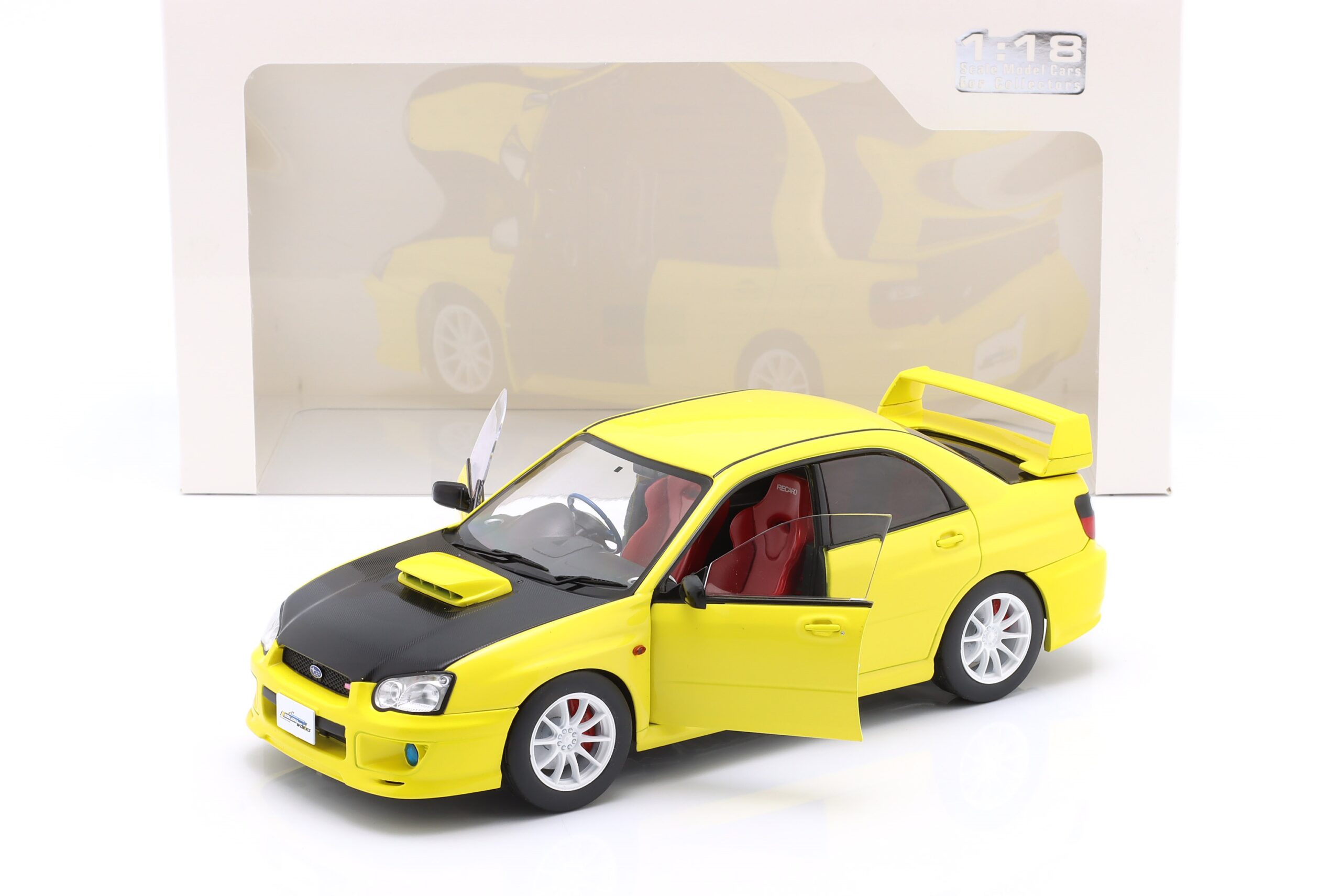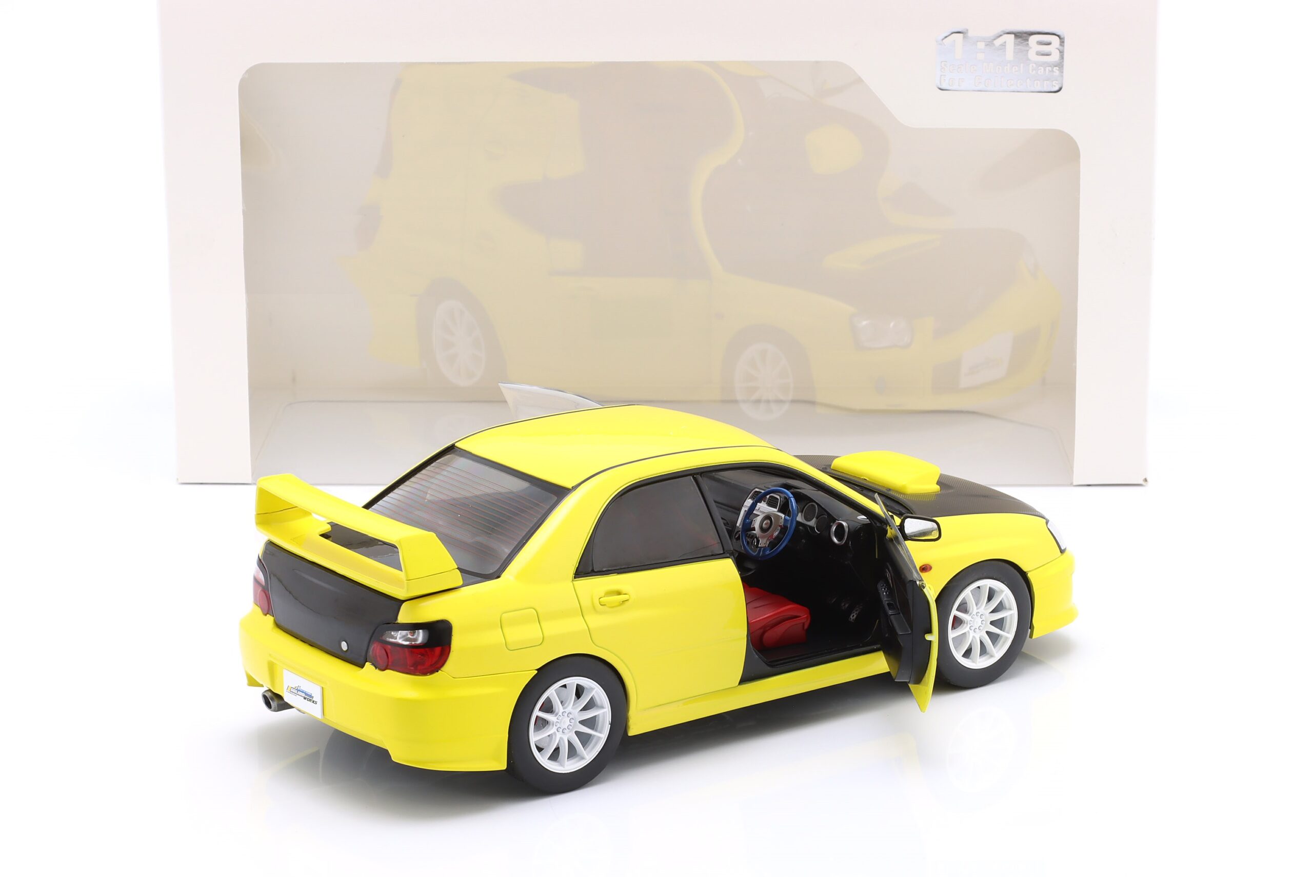 Kolekcjonerski model metalowy z elementami plastikowymi samochodu SUBARU IMPREZA WRX STI Streetfighters z roku 2003 w kolorze Żółtym z czarną pokrywą silnika.