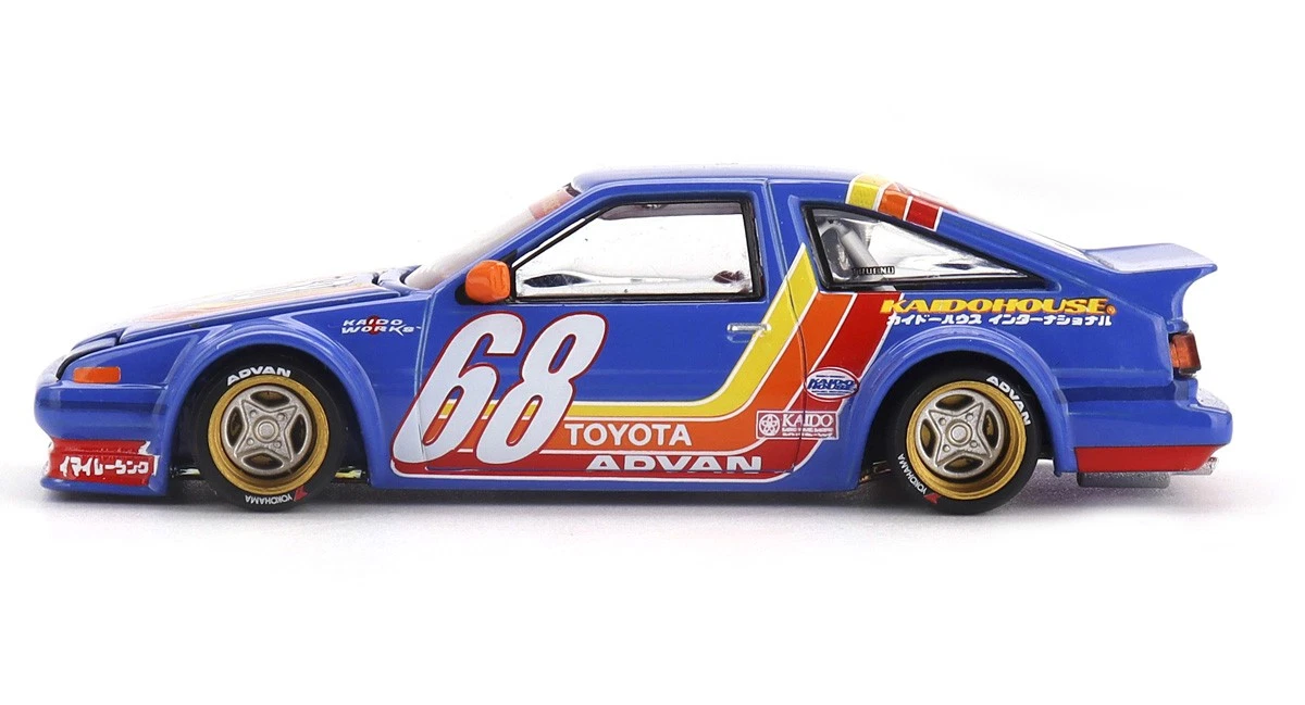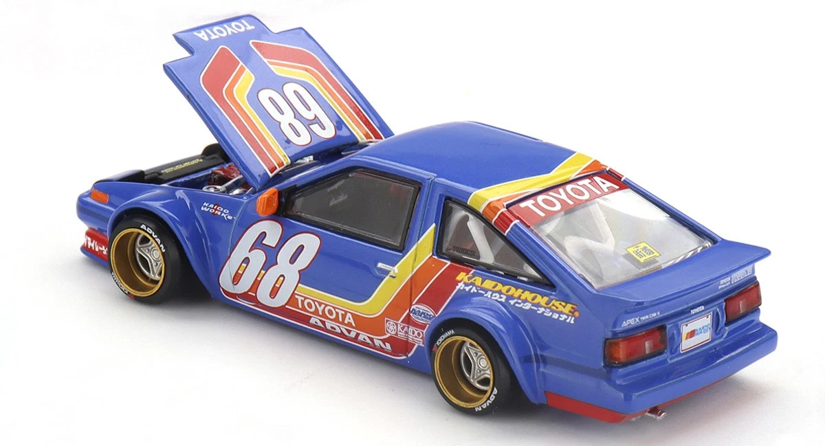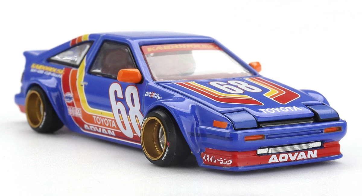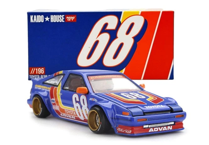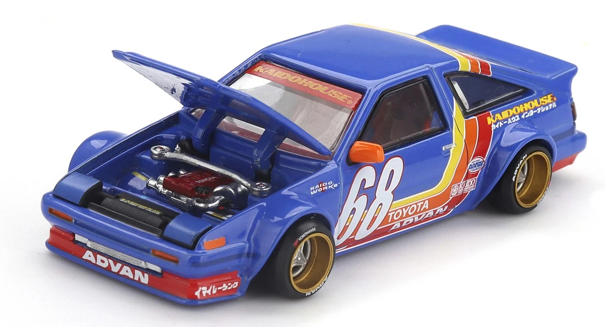 Kolekcjonerski model metalowy z elementami plastikowymi samochodu TOYOTA AE86 Sprinter Trueno Kaido Racing V1 z roku 1983.Model zapakowany w kartonowe pudełko z sylwetką samochodu.Model z serii KAIDO HOUSE.