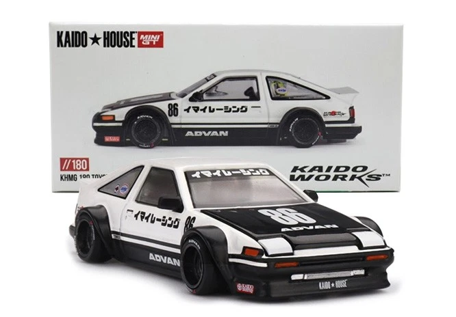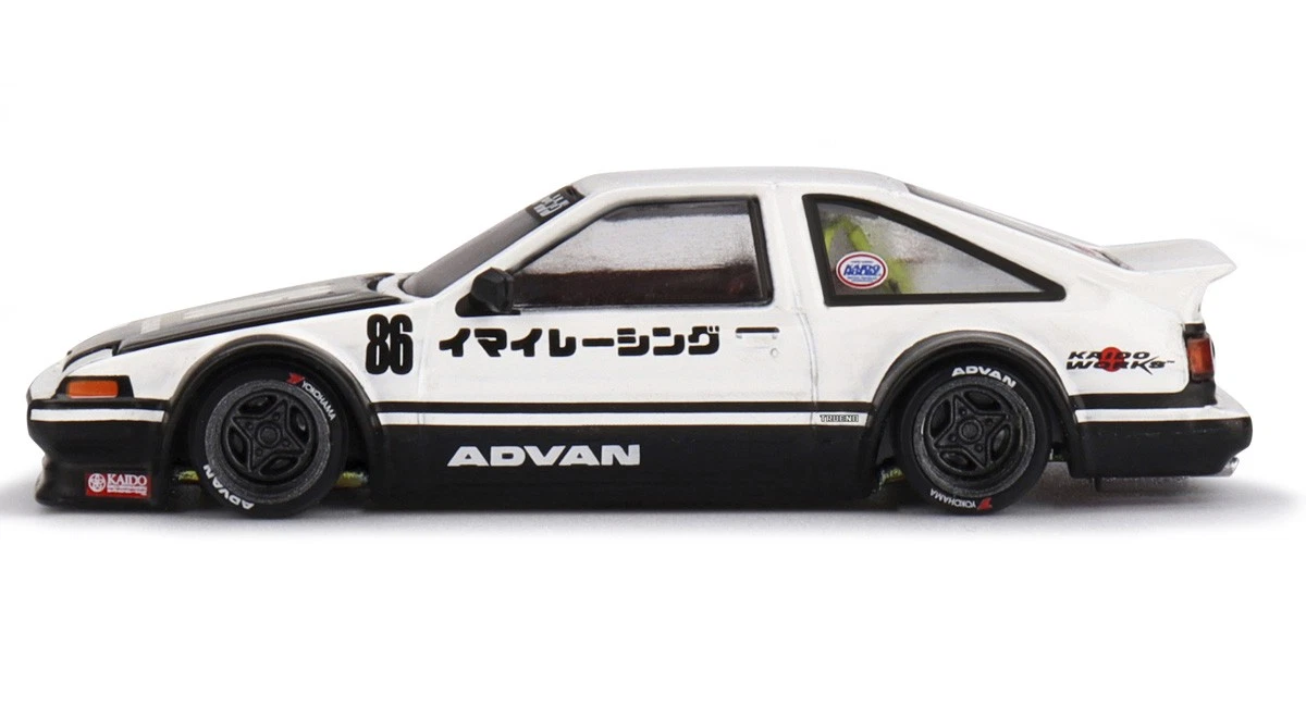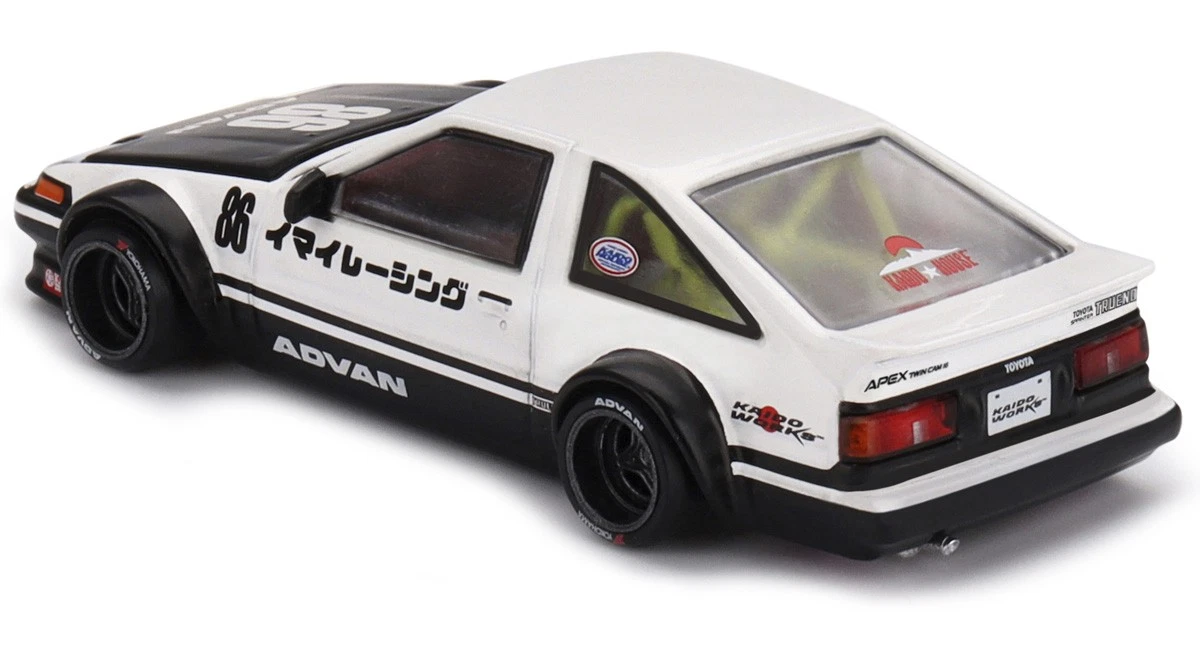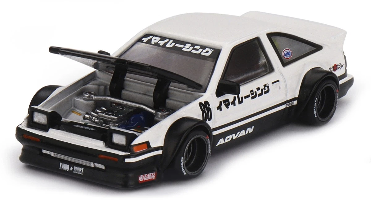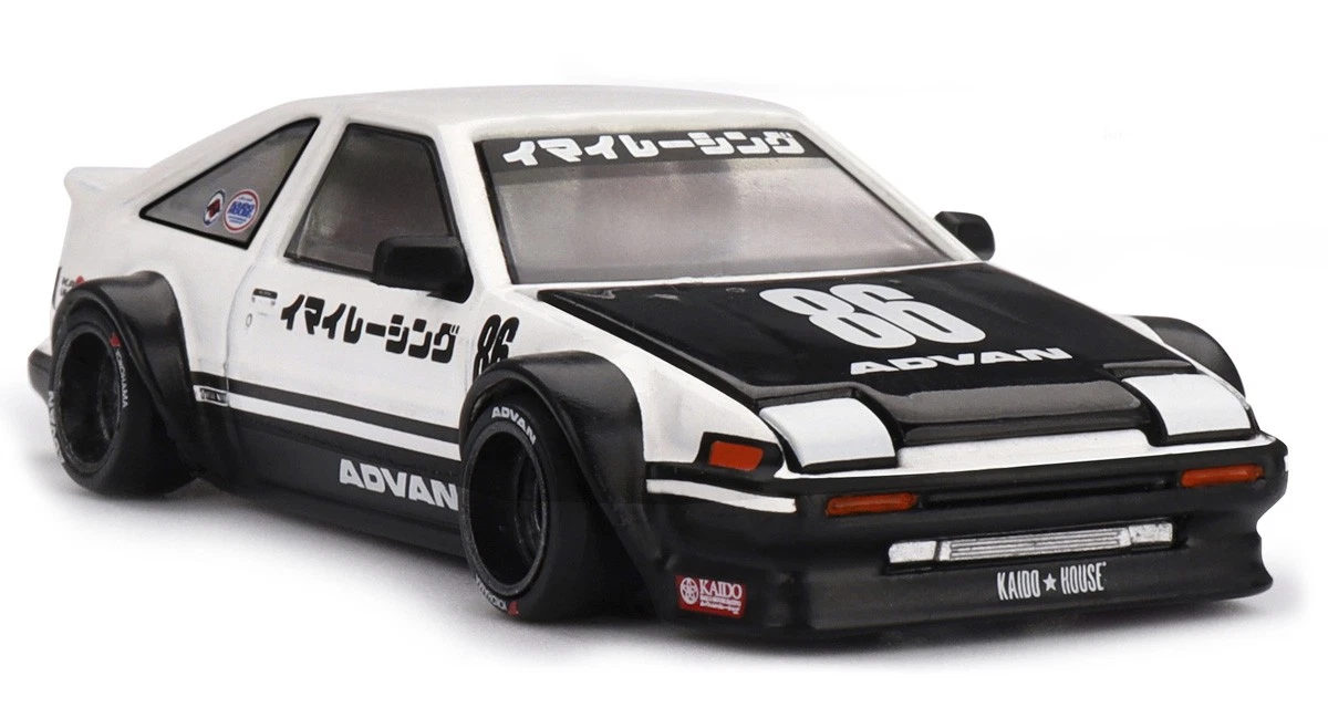 Kolekcjonerski model metalowy z elementami plastikowymi samochodu TOYOTA AE86 Sprinter Trueno Kaido Street V1 z roku 1983.Model zapakowany w kartonowe pudełko z sylwetką samochodu.Model z serii KAIDO HOUSE.