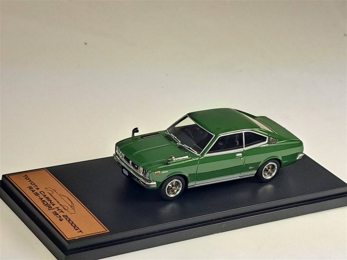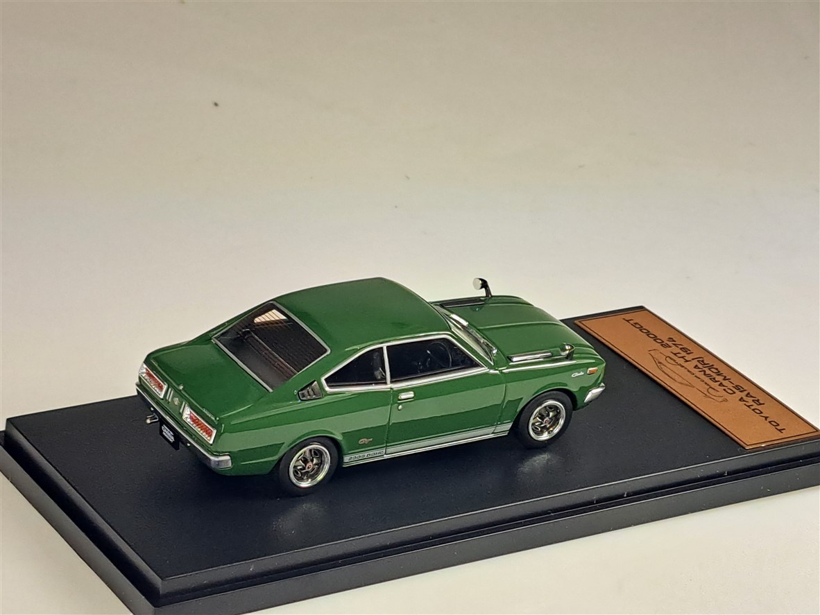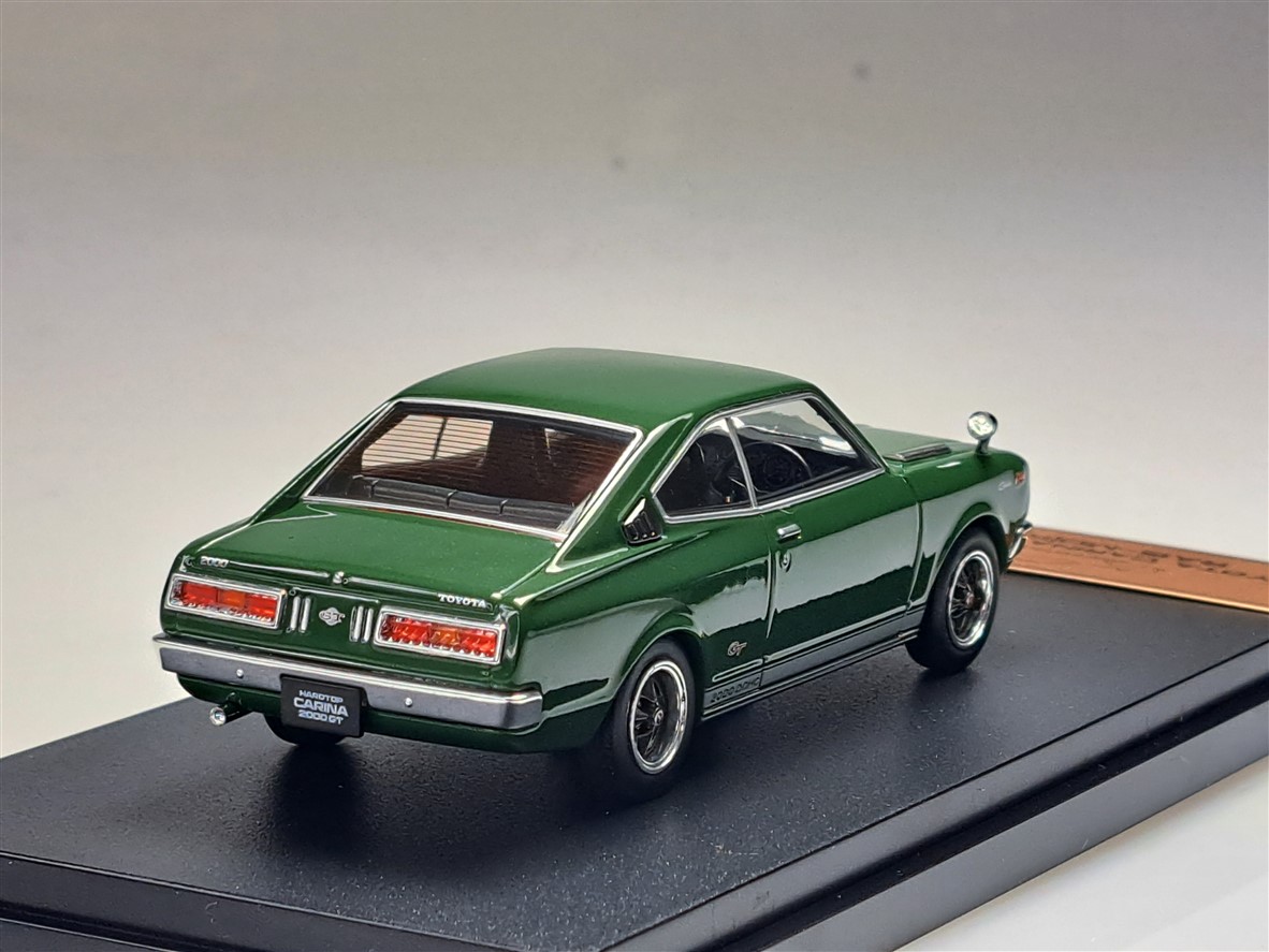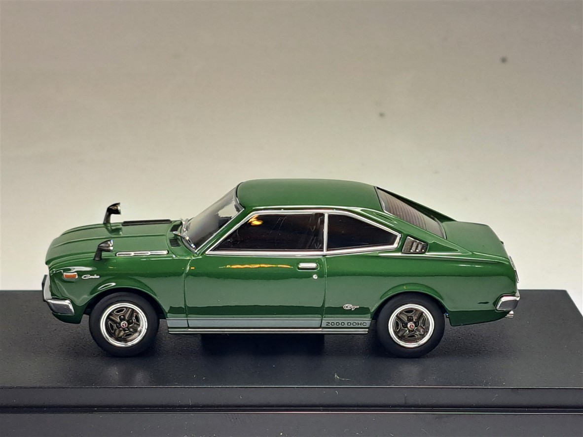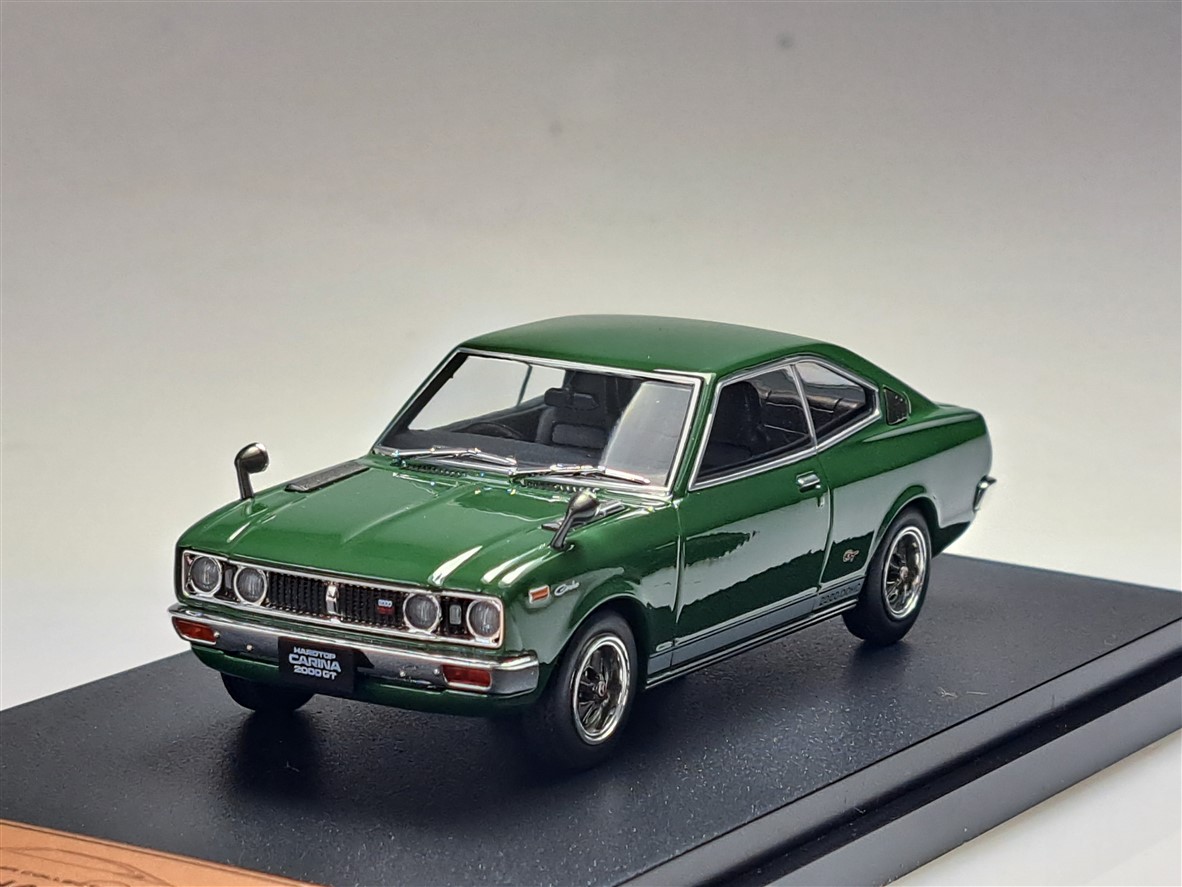 Kolekcjonerski model metalowy z elementami plastikowymi samochodu TOYOTA CARINA HT 2000GT z roku 1974 w kolorze Zielonym.Model na podstawce,posiada akrylową gablotkę ekspozycyjną