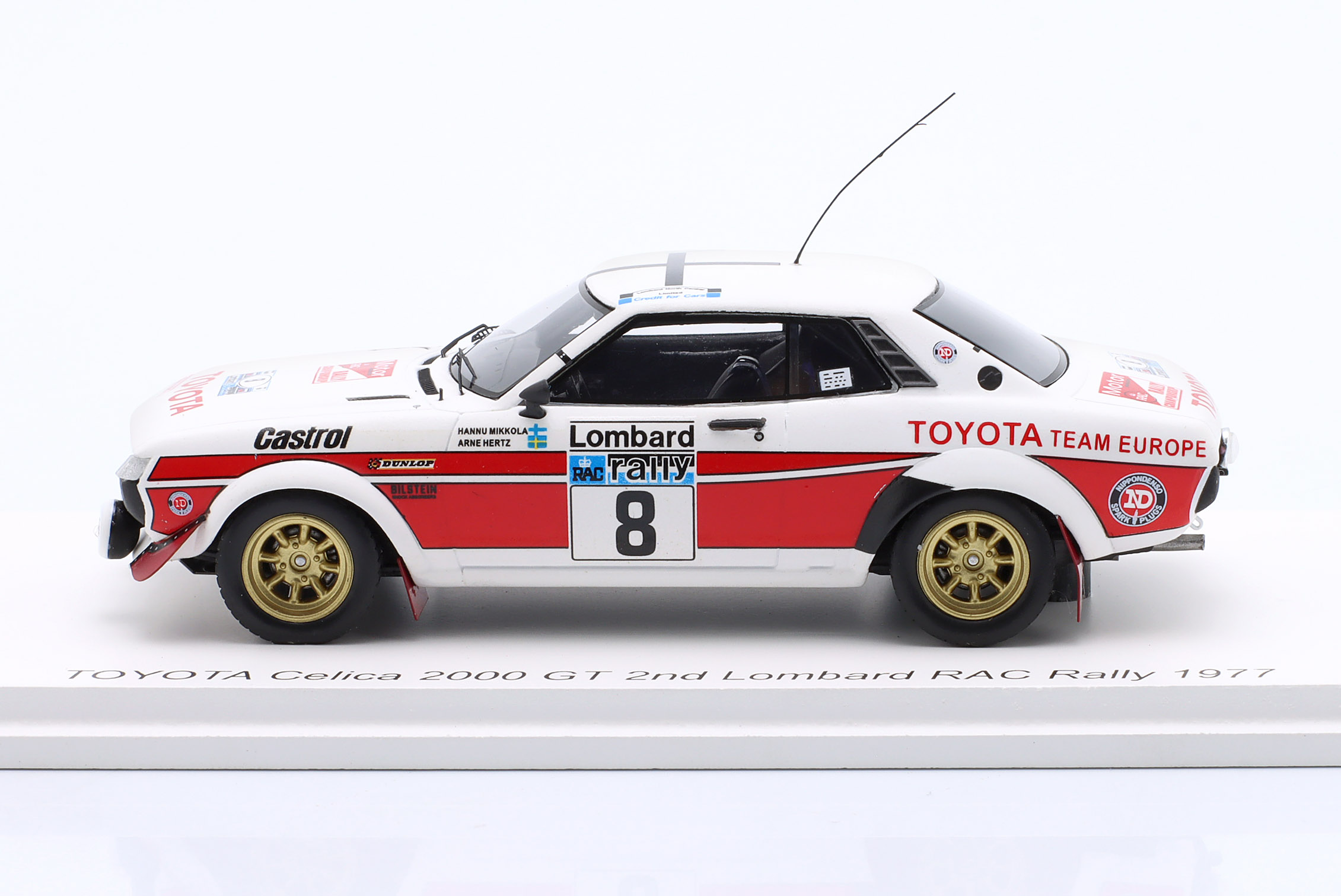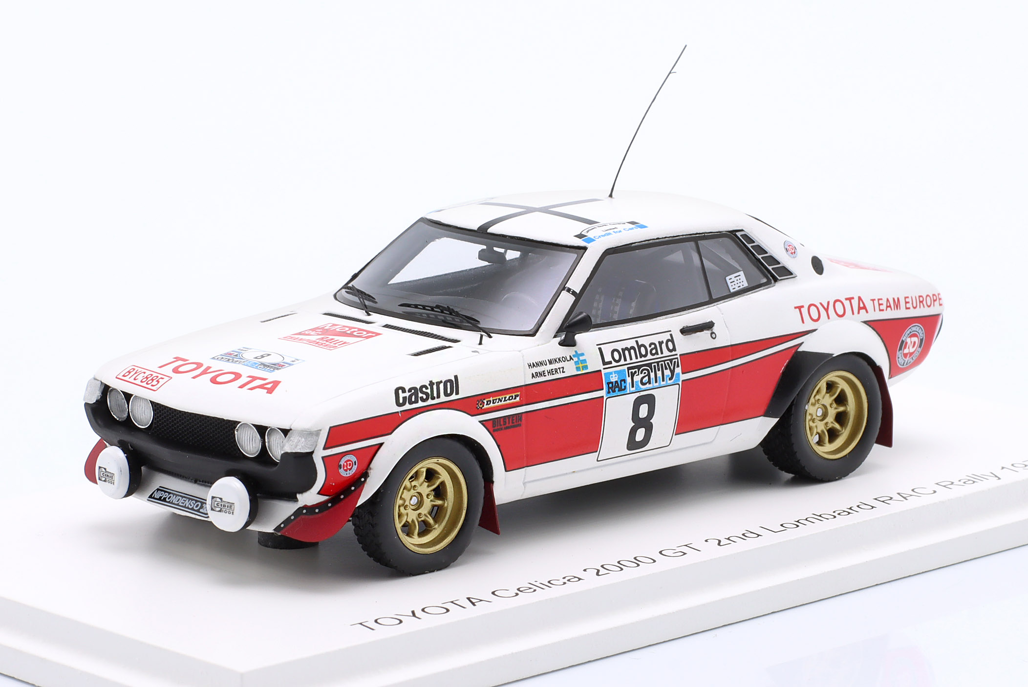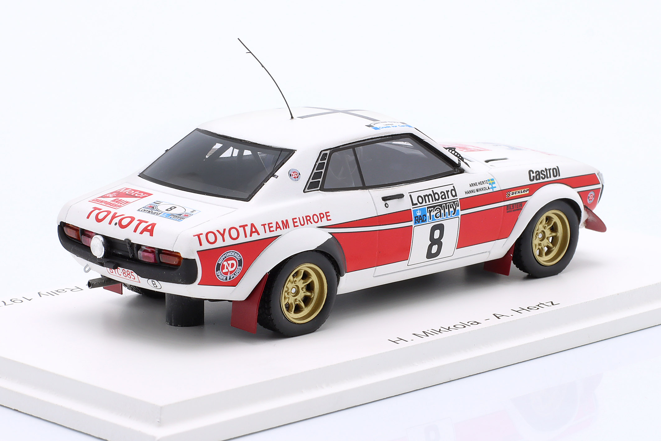 Kolekcjonerski model wykonany z żywicy samochodu rajdowego TOYOTA CELICA RA21 2000GT #8 w którym załoga H.Mikkola/A.Hertz zajęła 2-gie miejsce w Rajdzie RAC LOMBARD w roku 1977.