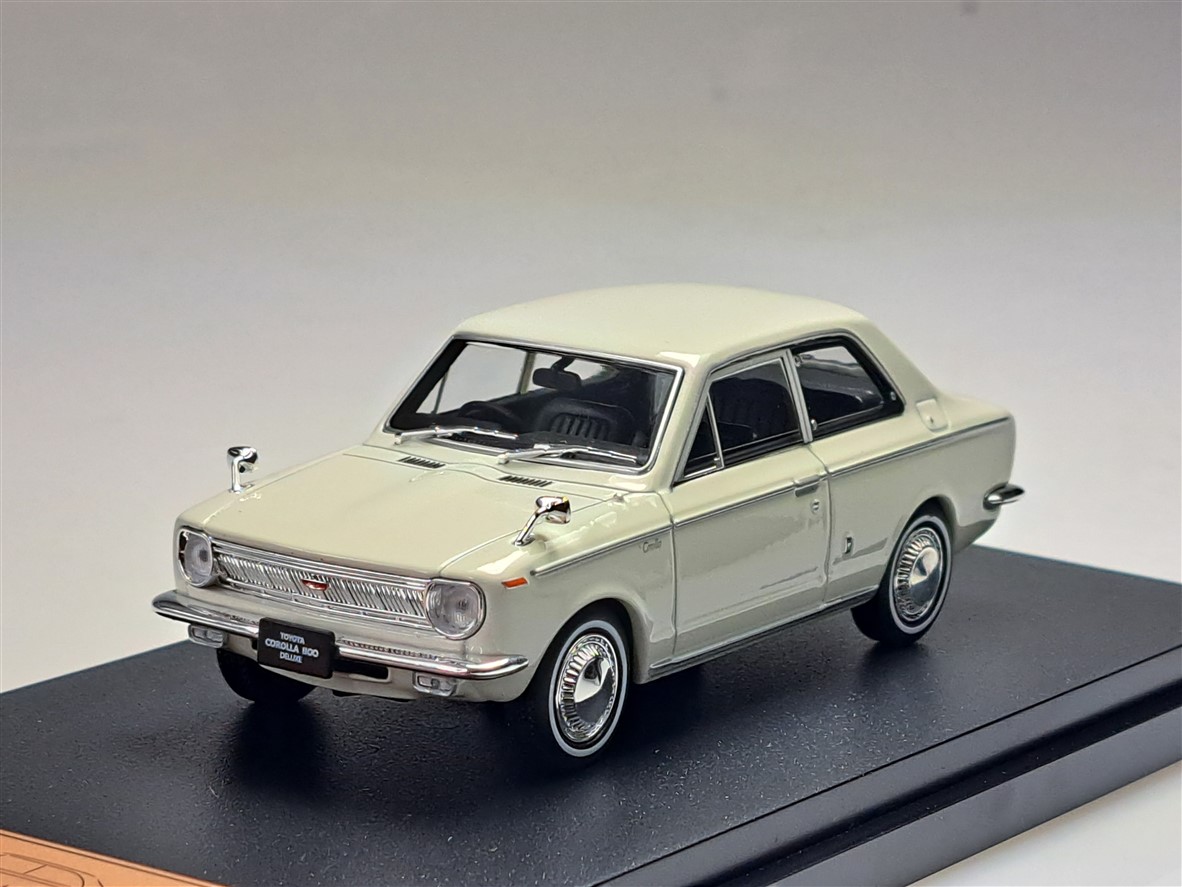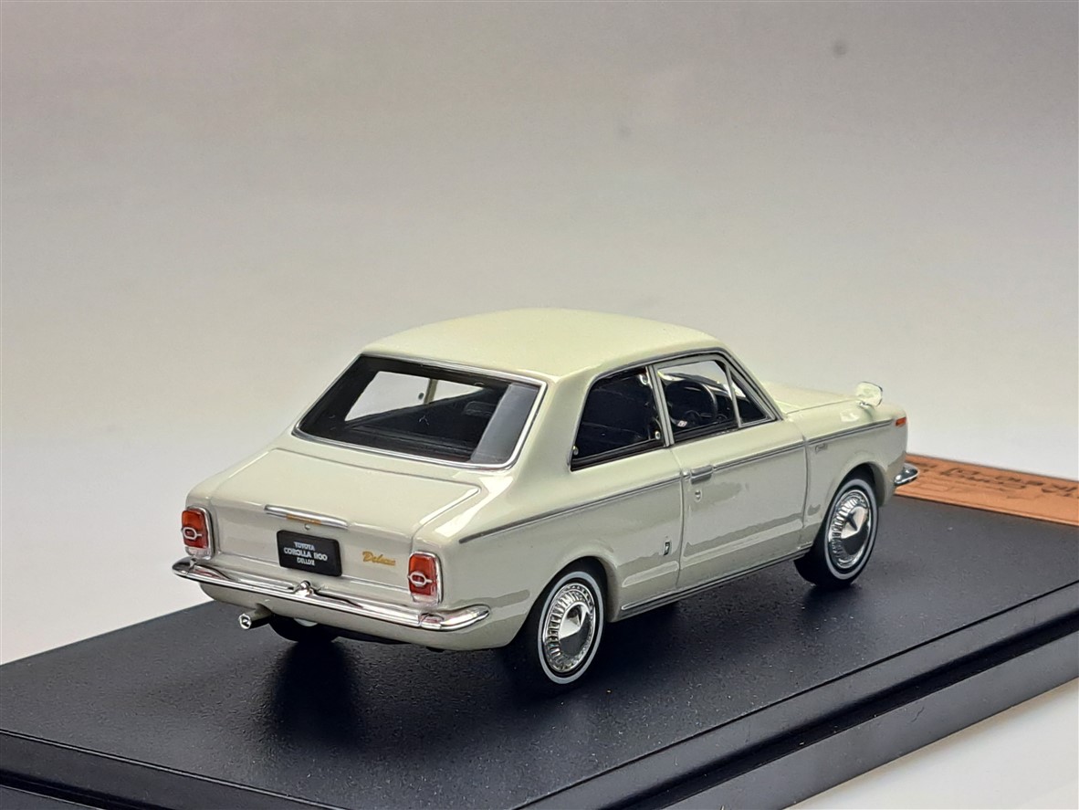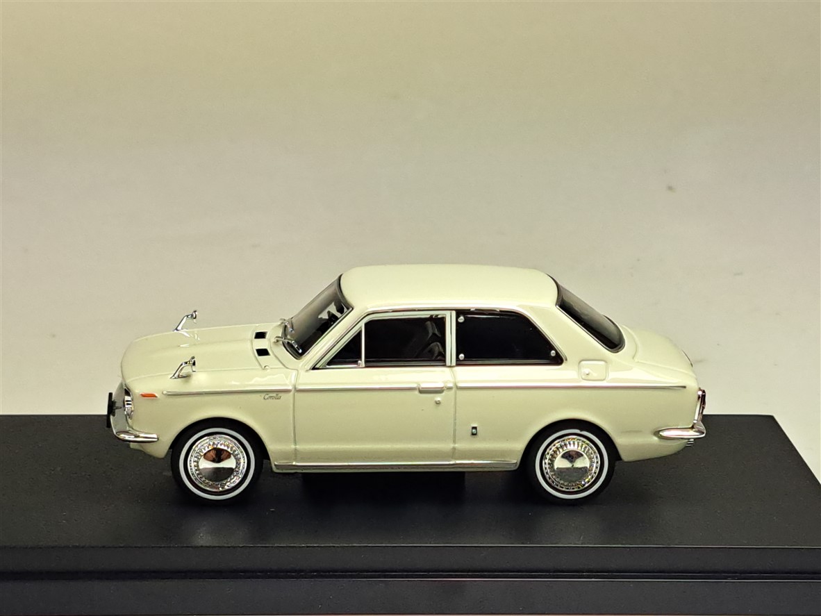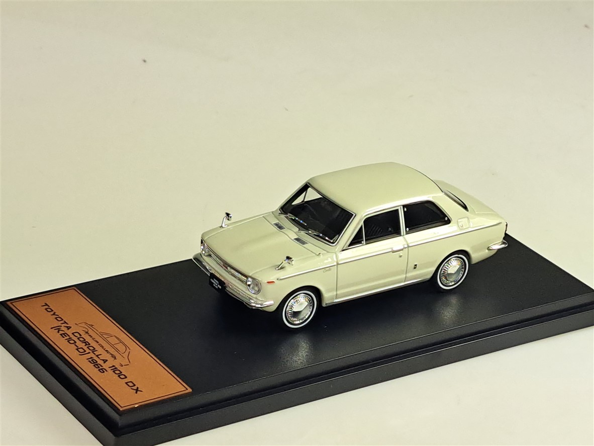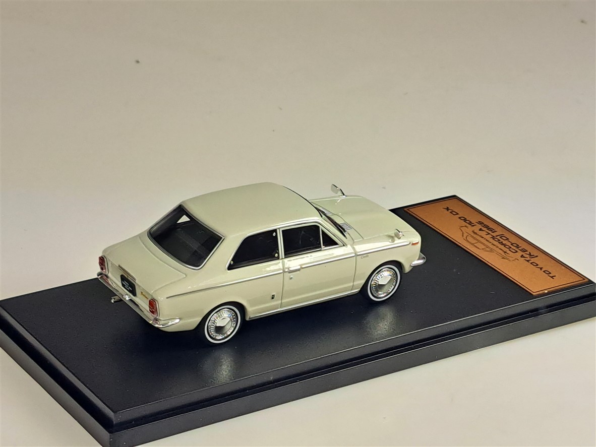 Kolekcjonerski model metalowy z elementami plastikowymi samochodu TOYOTA COROLLA 1100 DX z roku 1966 w kolorze Białym.Model na podstawce,posiada akrylową gablotkę ekspozycyjną