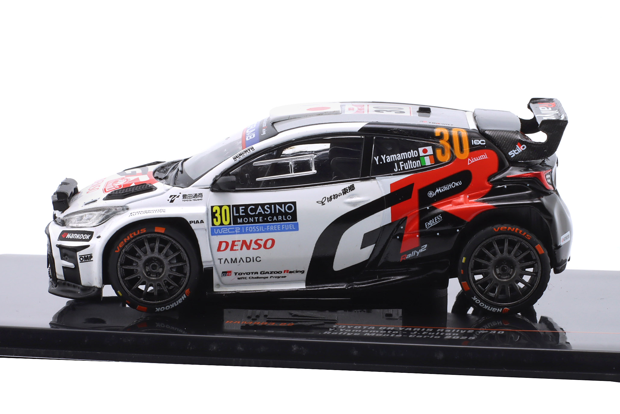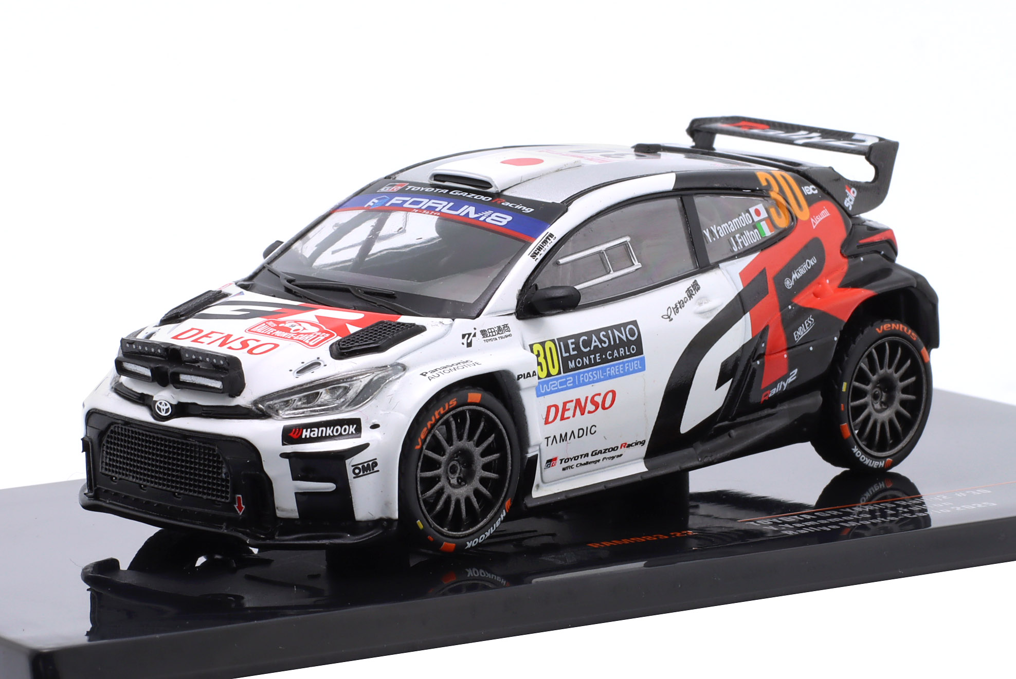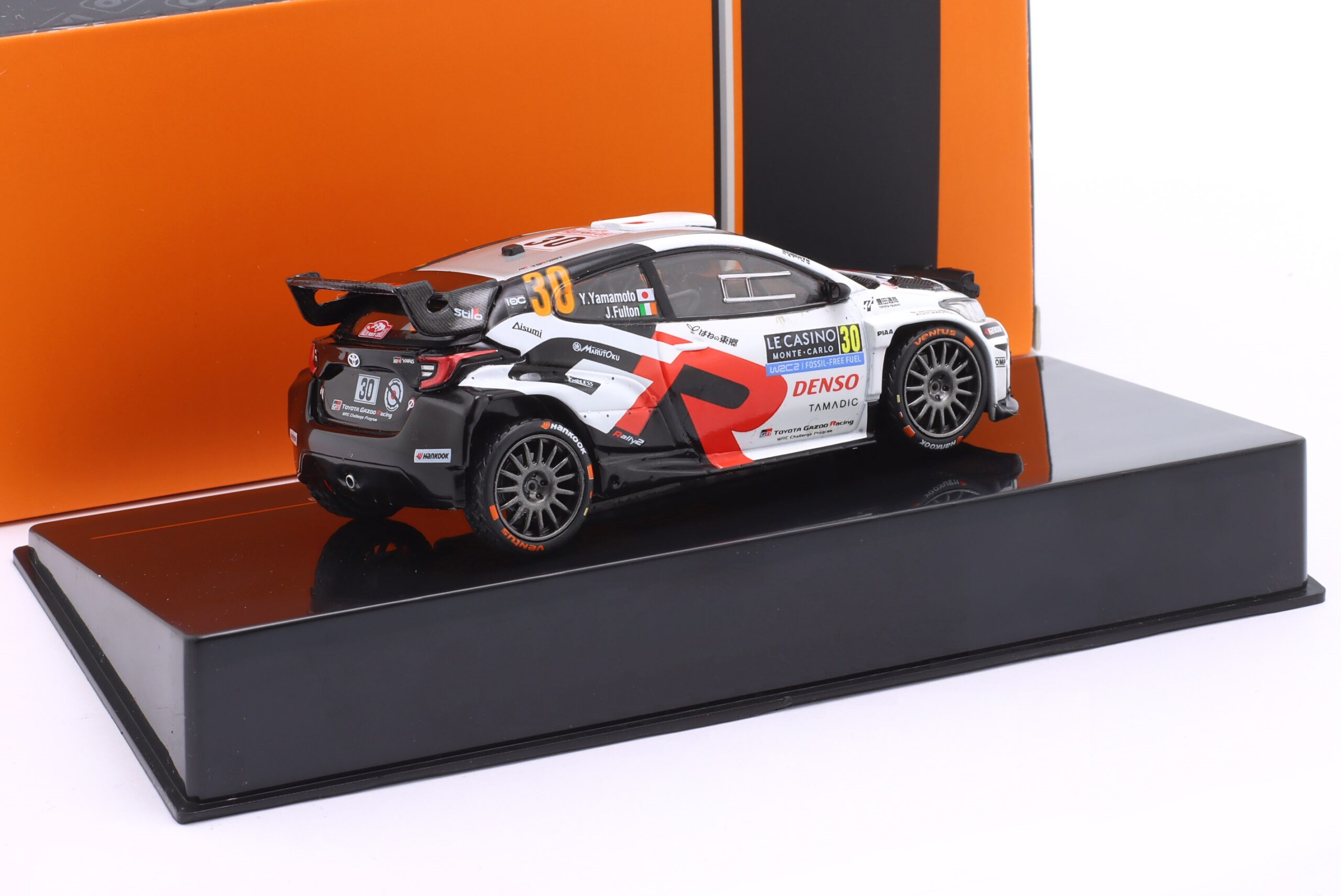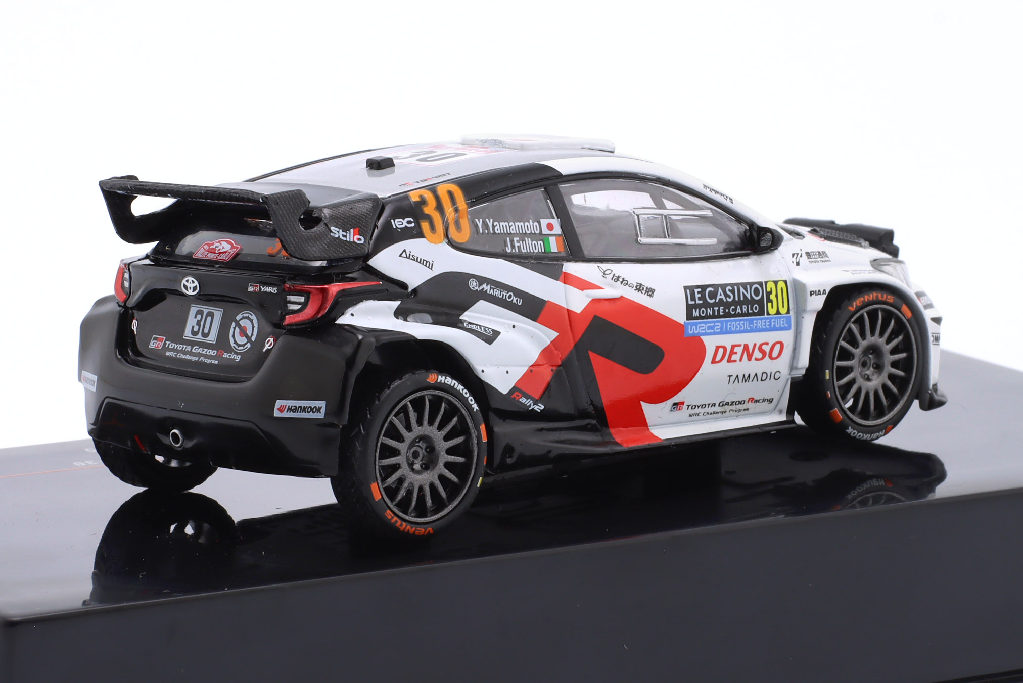 Kolekcjonerski model metalowy z elementami plastikowymi samochodu rajdowego TOYOTA GR YARIS Rally2 #30 załogi Y.Yamamoto/J.Fulton z Rajdu Monte Carlo z roku 2025.Model nie posiada otwieranych elementów.Model na plastikowej podstawce,posiada akrylową gablotkę ekspozycyjną.