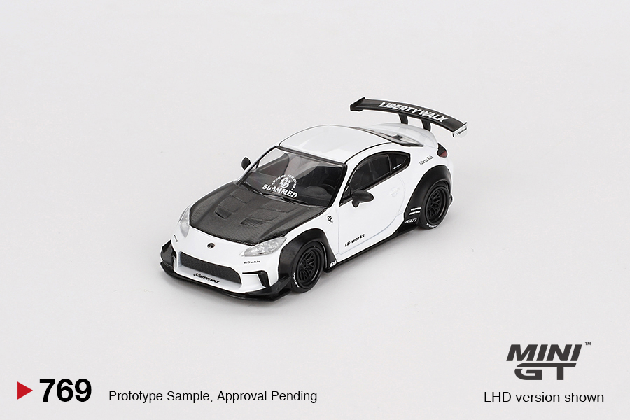 Kolekcjonerski model metalowy z elementami plastikowymi samochodu TOYOTA GR86 LB Nation z roku 2023 w kolorze Białym.