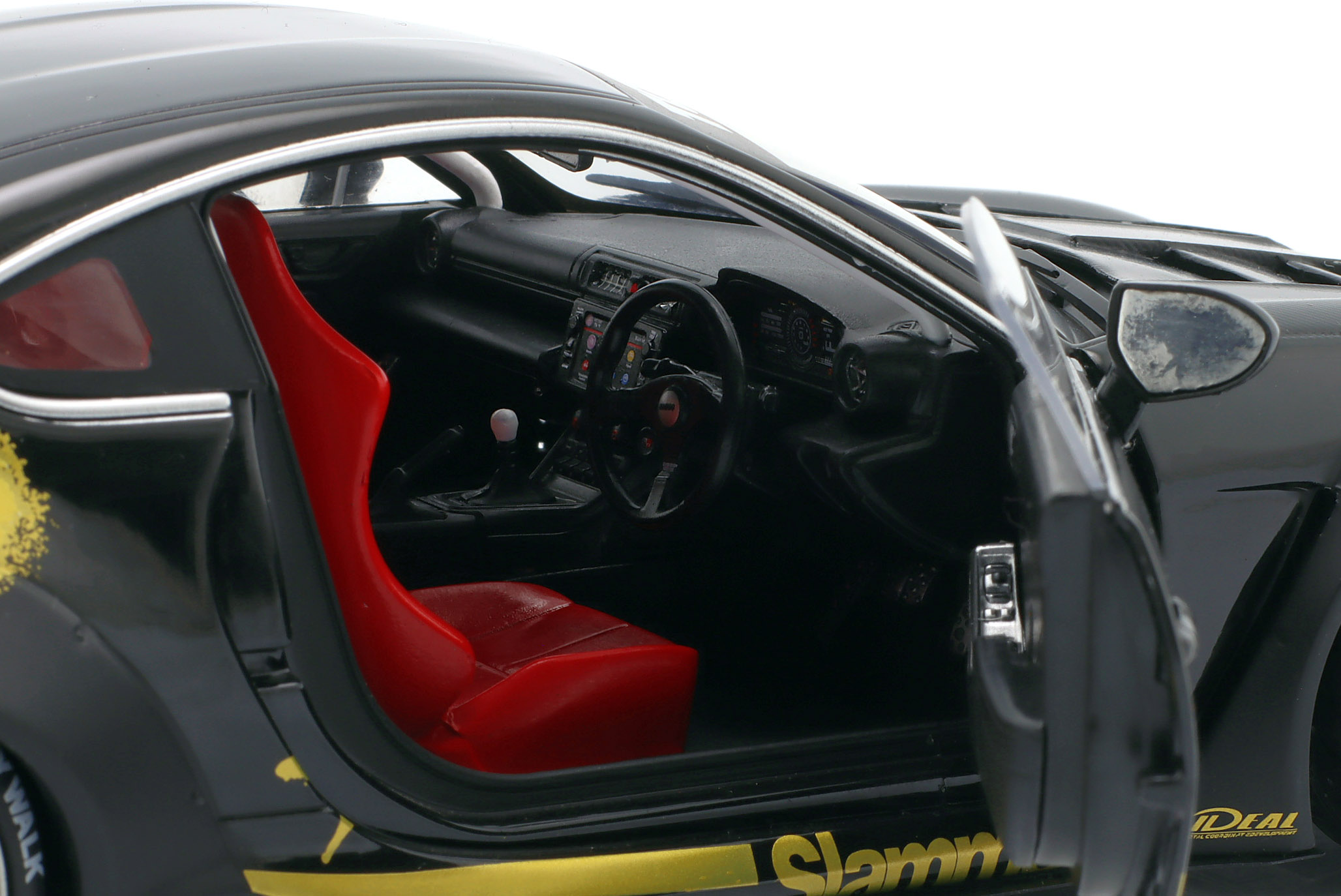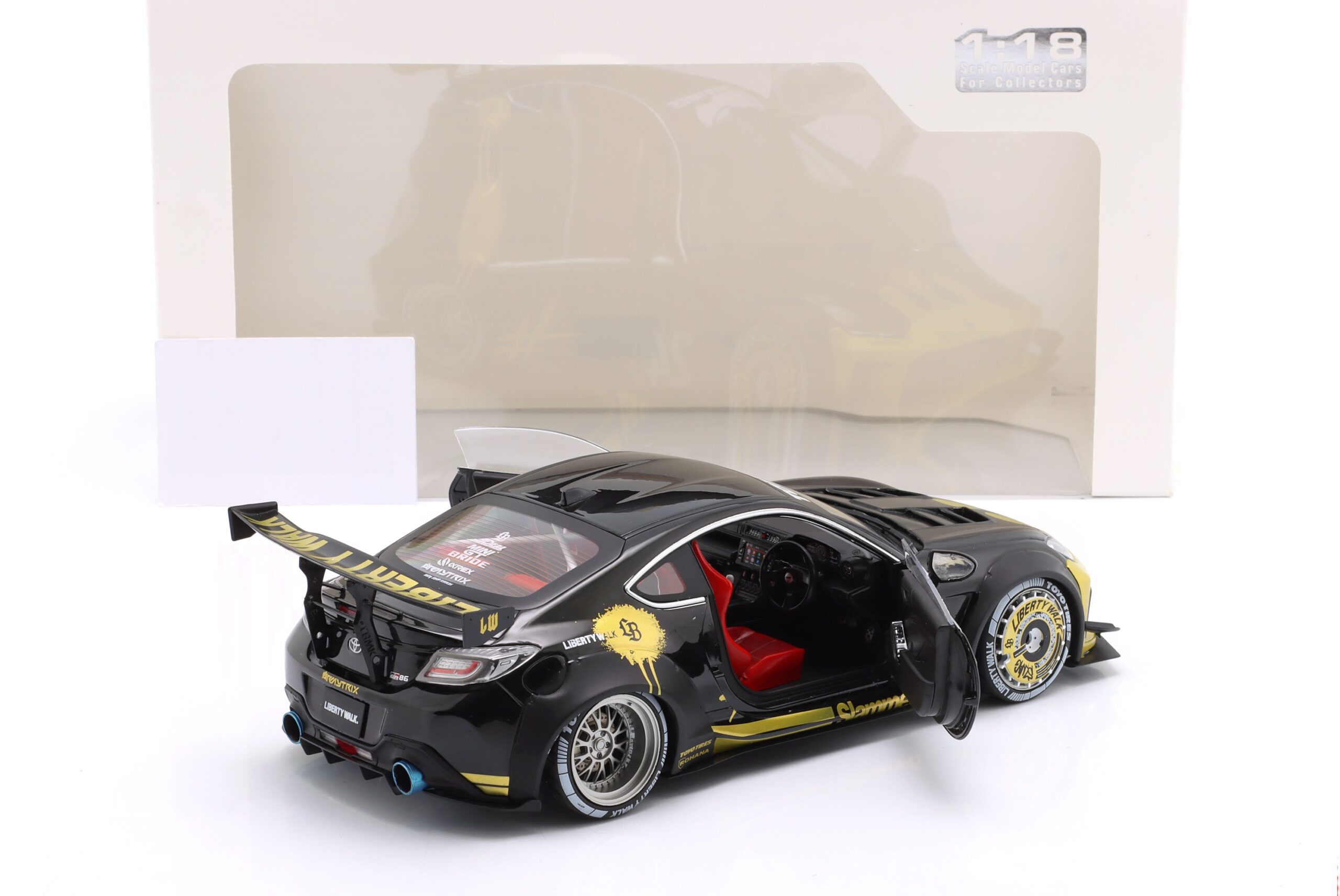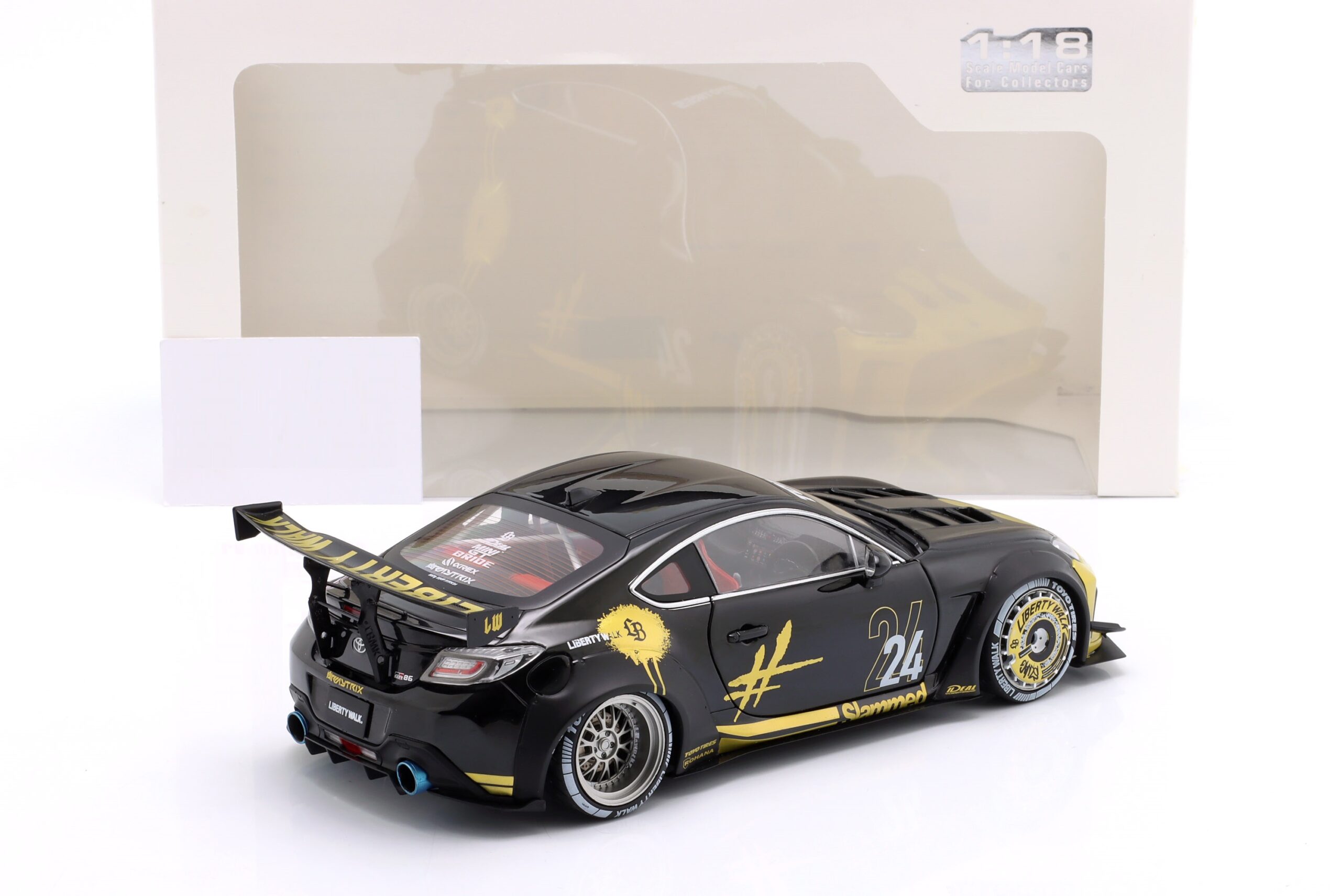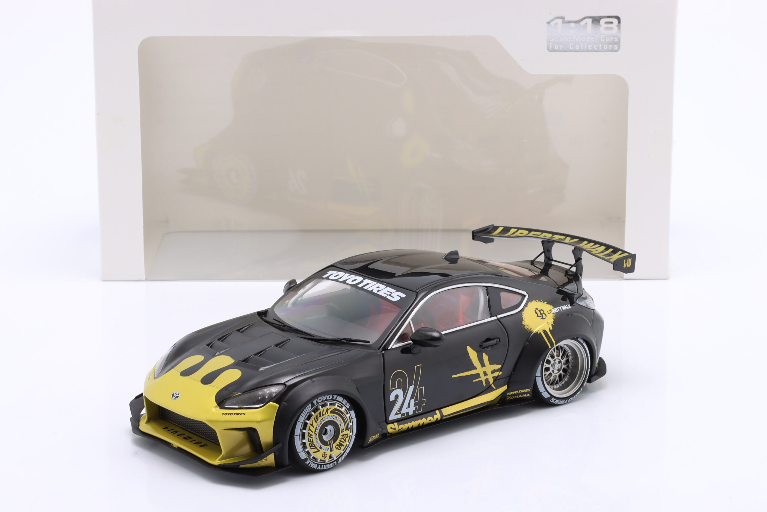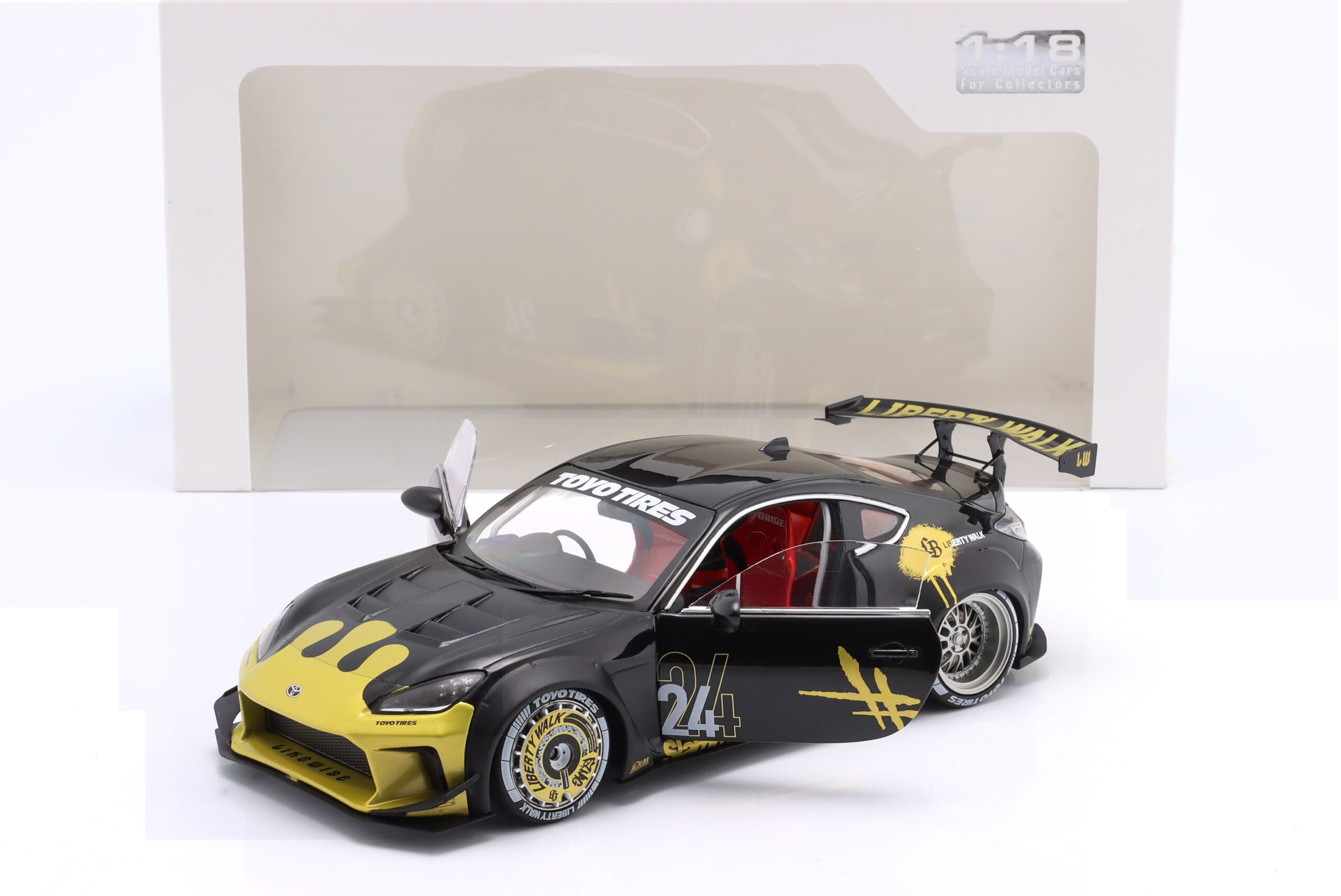 Kolekcjonerski model metalowy z elementami plastikowymi samochodu TOYOTA GR86 LBWK Body Kit z roku 2024 w kolorze Czarnym ze złotymi dodatkami.Model posiada otwierane drzwi.